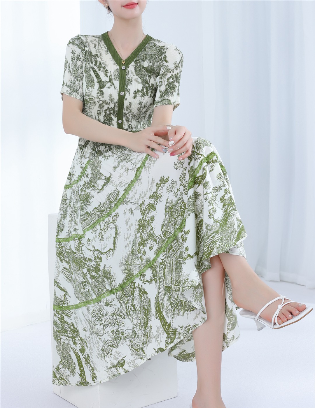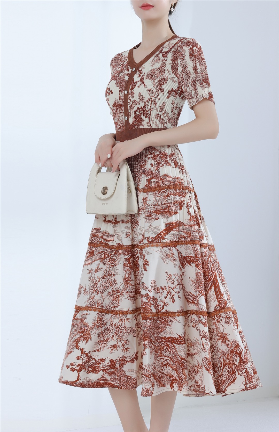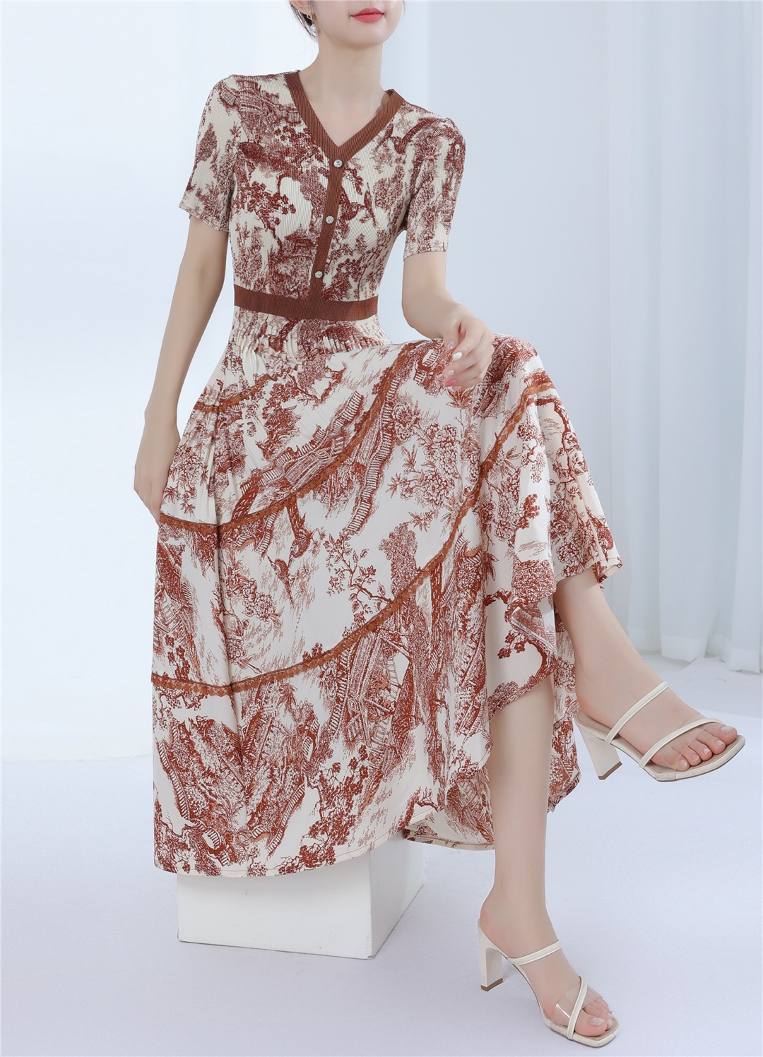 HJ2S97_棠梨褐色/庭芜绿色_连衣裙_春夏_气质中式印花 V 领三宅褶皱显瘦 A 字大摆裙_高级女装_BERNIEELEN 伯妮斯茵