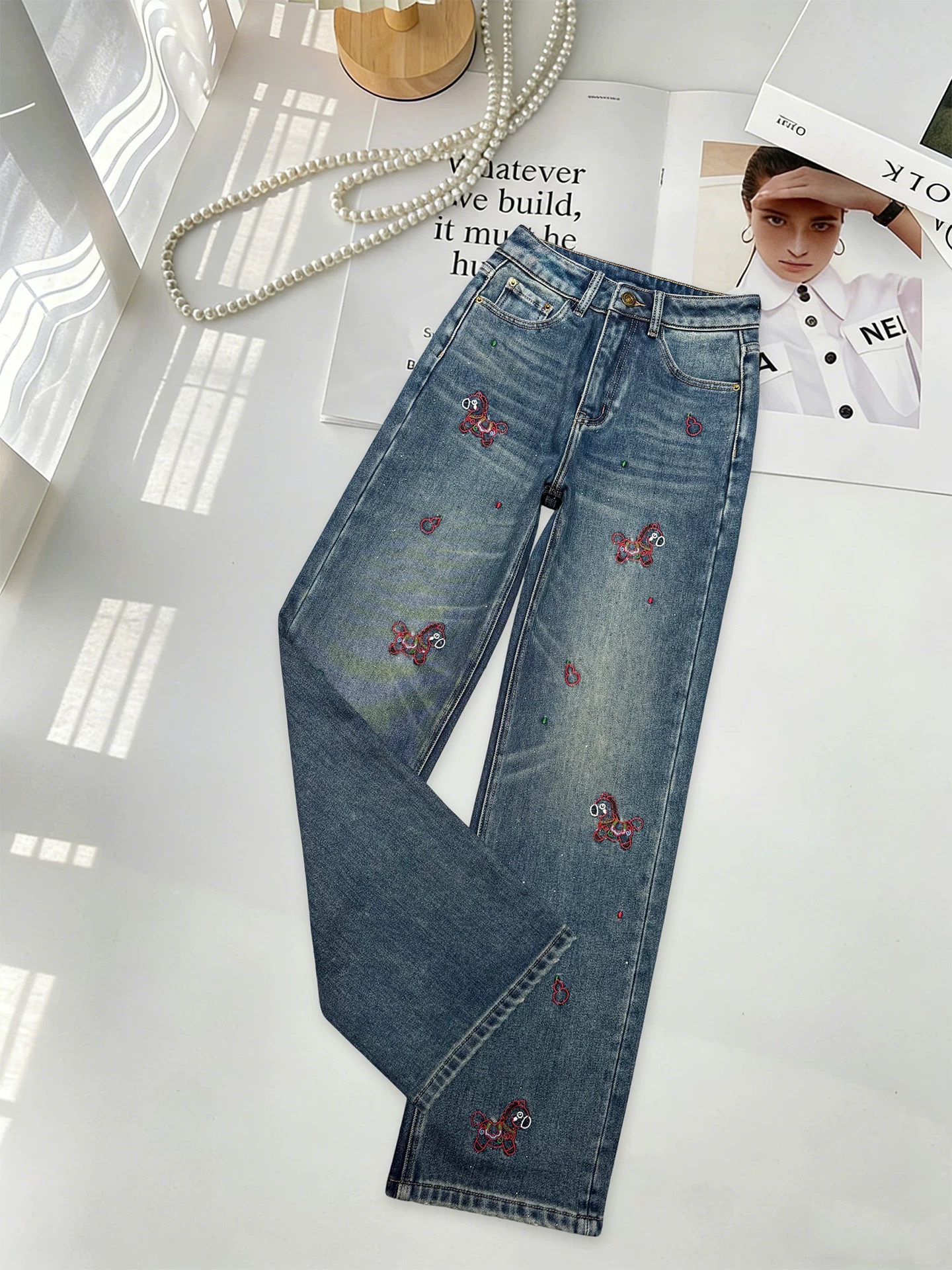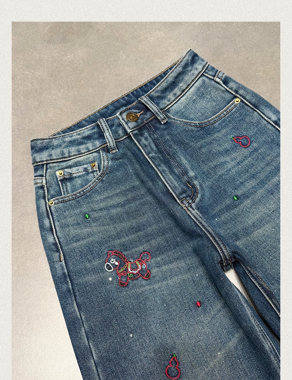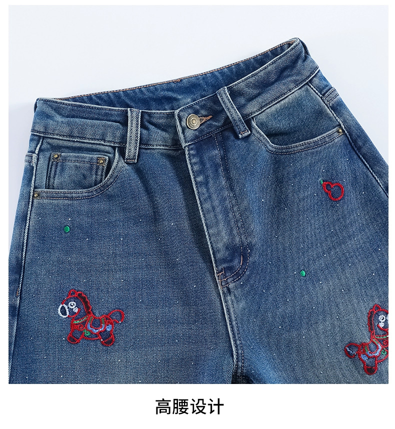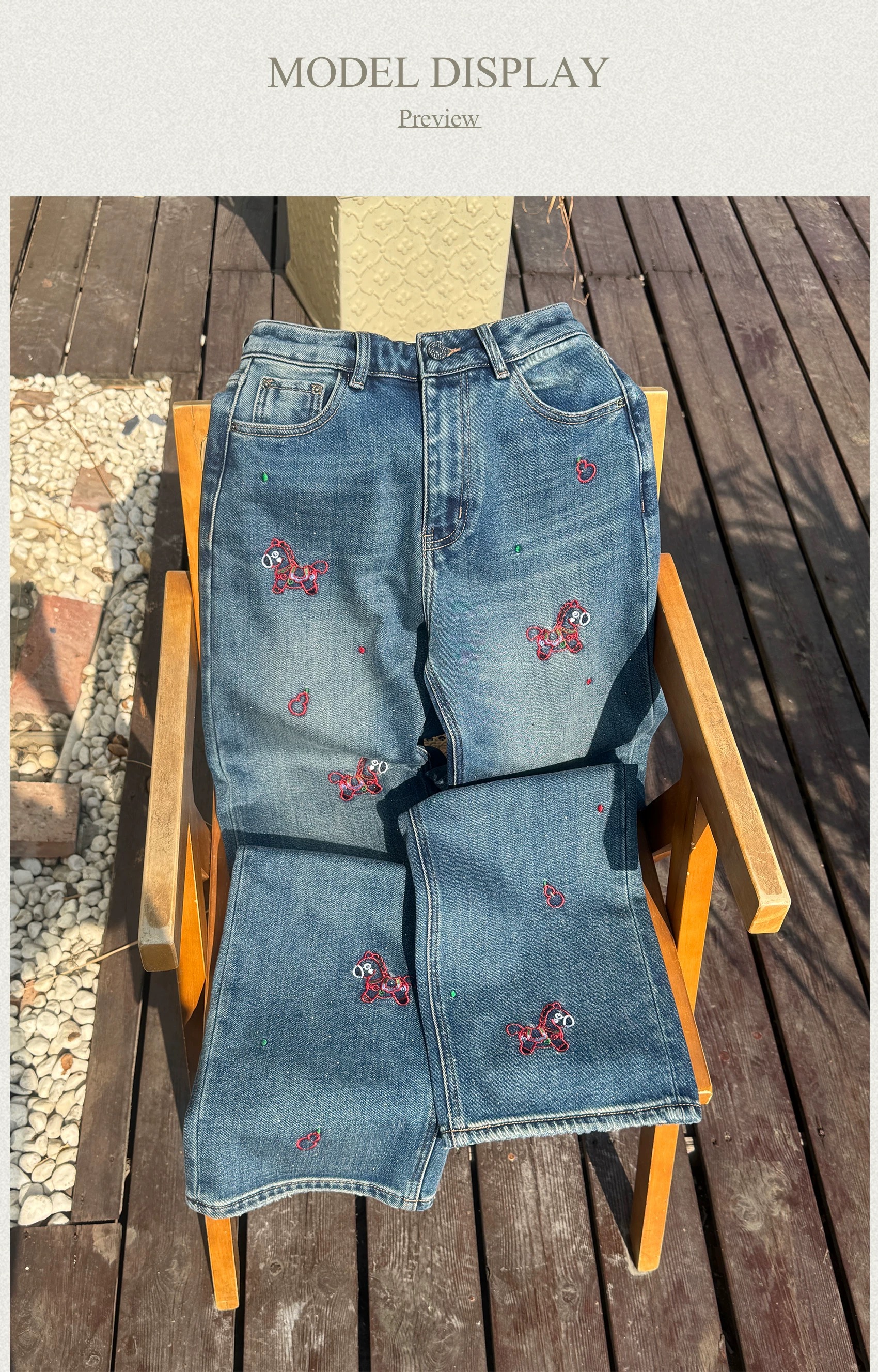 法国Missboudior 鱼骨拼接烫钻满天星阔腿牛仔裤/小马刺绣烫钻阔腿牛仔裤 显高显瘦 宽松舒适