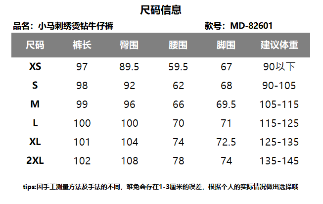 【品名】法国Missboudior 鱼骨拼接烫钻满天星阔腿牛仔裤/小马刺绣烫钻阔腿仔裤 显高显瘦 宽松舒适 【规格】鱼骨拼接烫钻满天星阔腿牛仔裤/小马刺绣烫钻阔腿牛仔裤 【尺码】XL-2XL 【产地】国内 【材质】棉68.3% 聚酯纤维29.5% 粘纤1.7% 氨纶0.5% 【发货包装】独立包装 【发货地】中山 【发货快递】韵达、邮政随机发 【补邮费地区】新疆、西藏+15元 【发货时效】48-72小时,周末节假日顺延 |