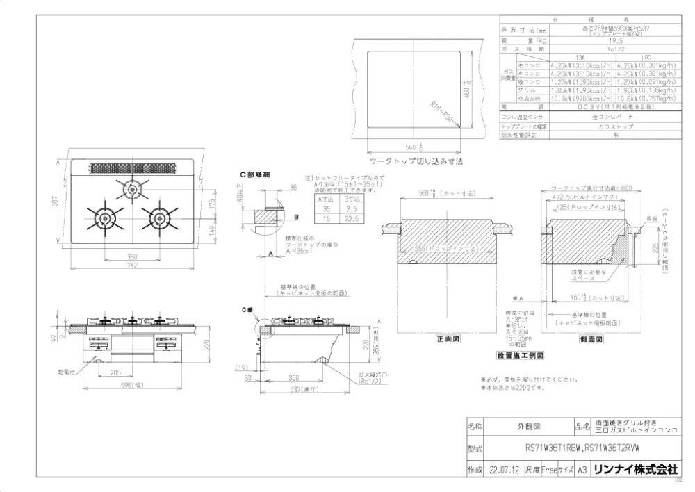 日本林内SENCE三眼烤箱燃气灶75cm玻璃/无框丝滑银 RS71W36T2RVW