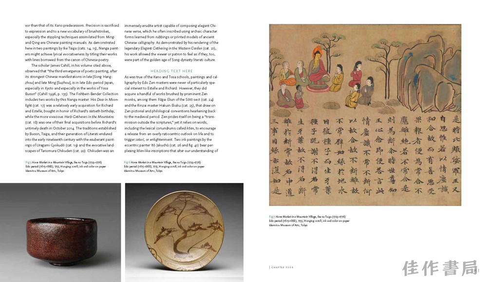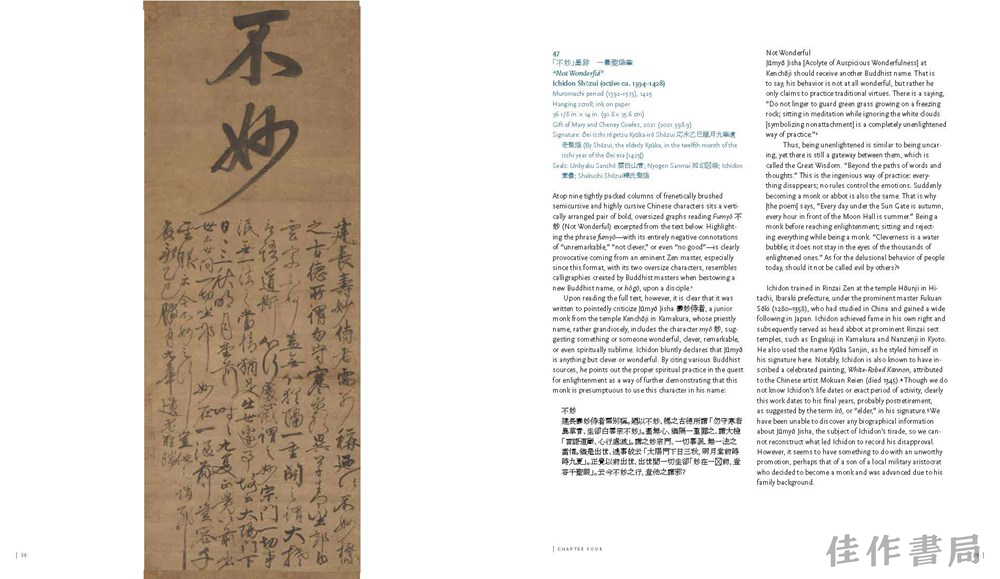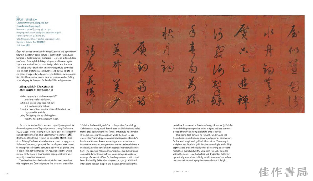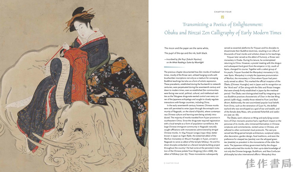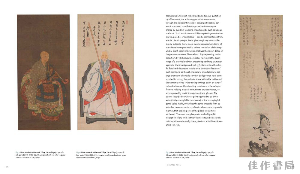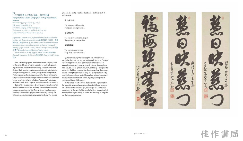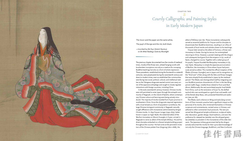 在东亚文化中,诗歌、绘画与书法的融合,被誉为“三绝”,是艺术表达的巅峰。这本华美的书籍通过大都会艺术博物馆(The Metropolitan Museum of Art)玛丽与切尼·考尔斯收藏(Mary and Cheney Cowles Collection)中的100多件作品——包括挂轴、屏风、手卷和画册——探索了日本艺术长达千年的发展历程。约翰·T·卡彭特(John T. Carpenter)生动讲述了这些相互关联的艺术门类的历史,并展示了中日艺术家之间在艺术创作中的思想交流,这些作品既包含用中日两种语言书写的诗歌,也有日本禅僧以中国书法风格创作的书法作品,还有描绘中国文学与传说场景的日本绘画实例。书中许多作品,包括日本诗体、中国诗句以及禅宗佛教格言,均为首次被解读和翻译,使读者能更好地理解每件作品丰富而多层次的内涵。本书还重点介绍了梦窗疏石(Musō Soseki)、雪村周继(Sesson Shūkei)、慈云院昂公(Jiun Onkō)、良宽大愚(Ryōkan Taigu)、池大雅(Ike no Taiga)以及与谢芜村(Yosa Buson)等大师的才华,颂扬了毛笔书法的魅力及其与绘画图像之间复杂的视觉协同效应。
