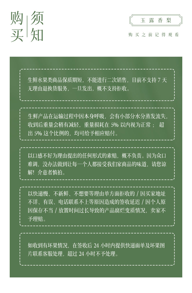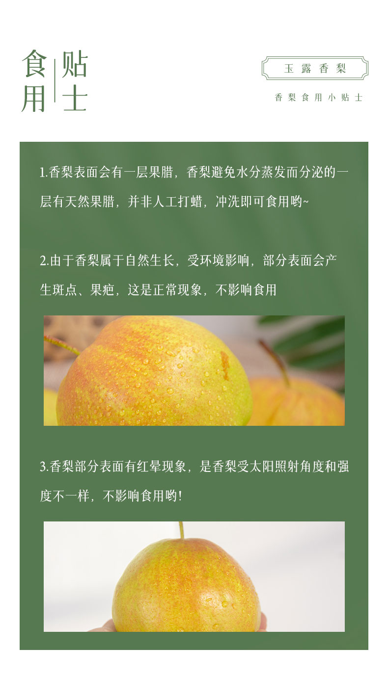 1.玉露香梨属于自然生长,历经风吹雨打,个别果子表皮会有细小疤痕、斑点,不影响食用哦