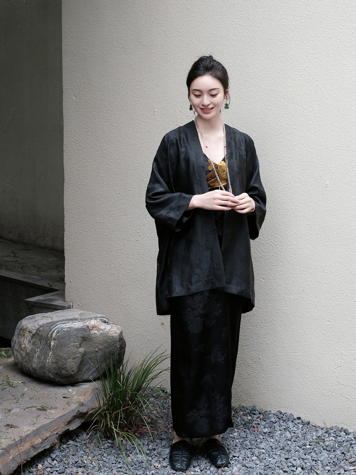 盛唐婧 |桑蚕丝提花宽松百搭T恤-黑色