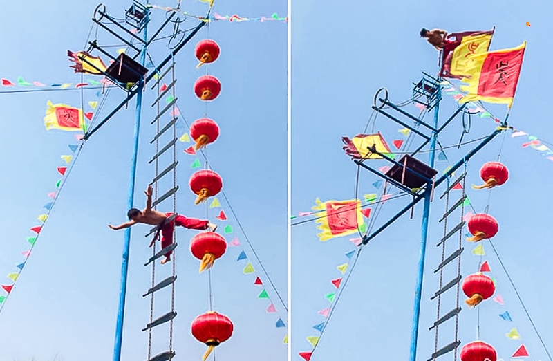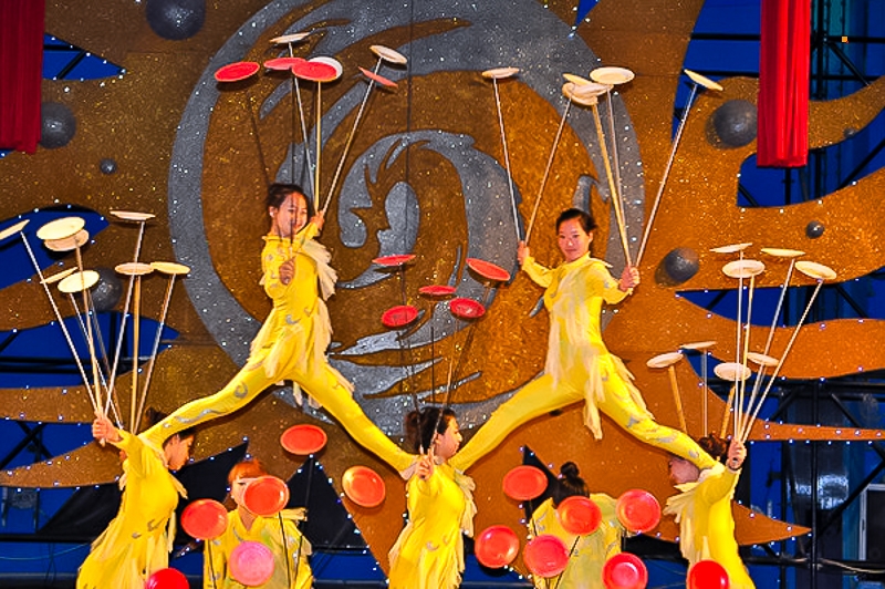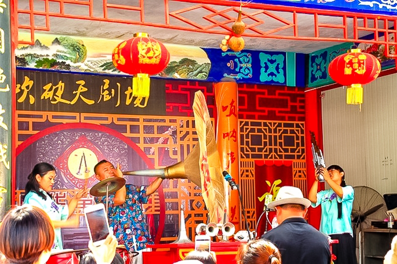 漫步城中可以尽情欣赏各具特色的杂技、马戏、戏法、气功、曲艺、独台戏、拉洋片、驯白鼠等艺术表演,身着清朝服饰的吴桥艺人们,说着当年卖艺求生的语言,把过去艺人四海为家的生活情景展视的淋漓尽致,我们在露天的杂技表演广场,看驯鼠、独台戏、驯猴、吹破天剧场的吹茶壶、鼻吹唢呐和口吃香烟、上刀山、吞剑、等,之后在魔术宫剧场、鬼手剧场和红牡丹剧场看室内表演,以及国术马戏场。