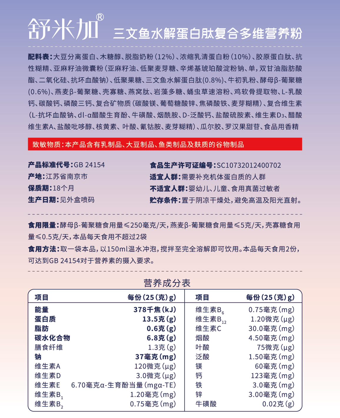 食用方法:取一袋本品,以150ml温水冲泡,搅拌至完全溶解即可饮用。本品每天食用2份可达到GB 24154对于营养素的摄入要求。