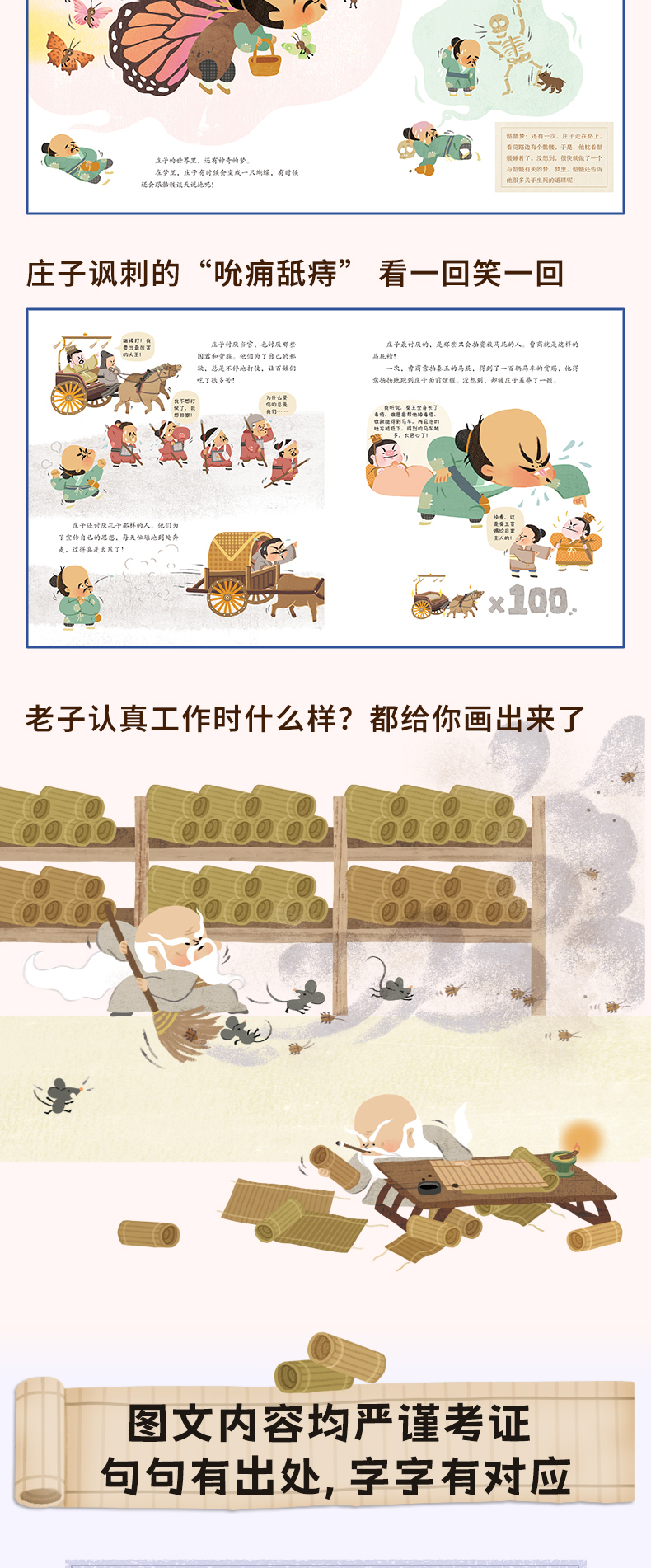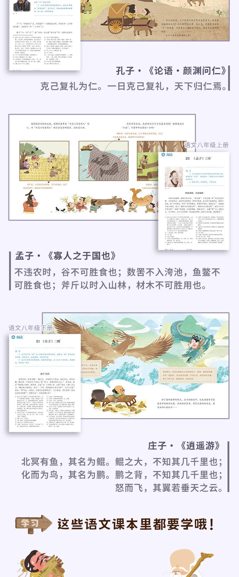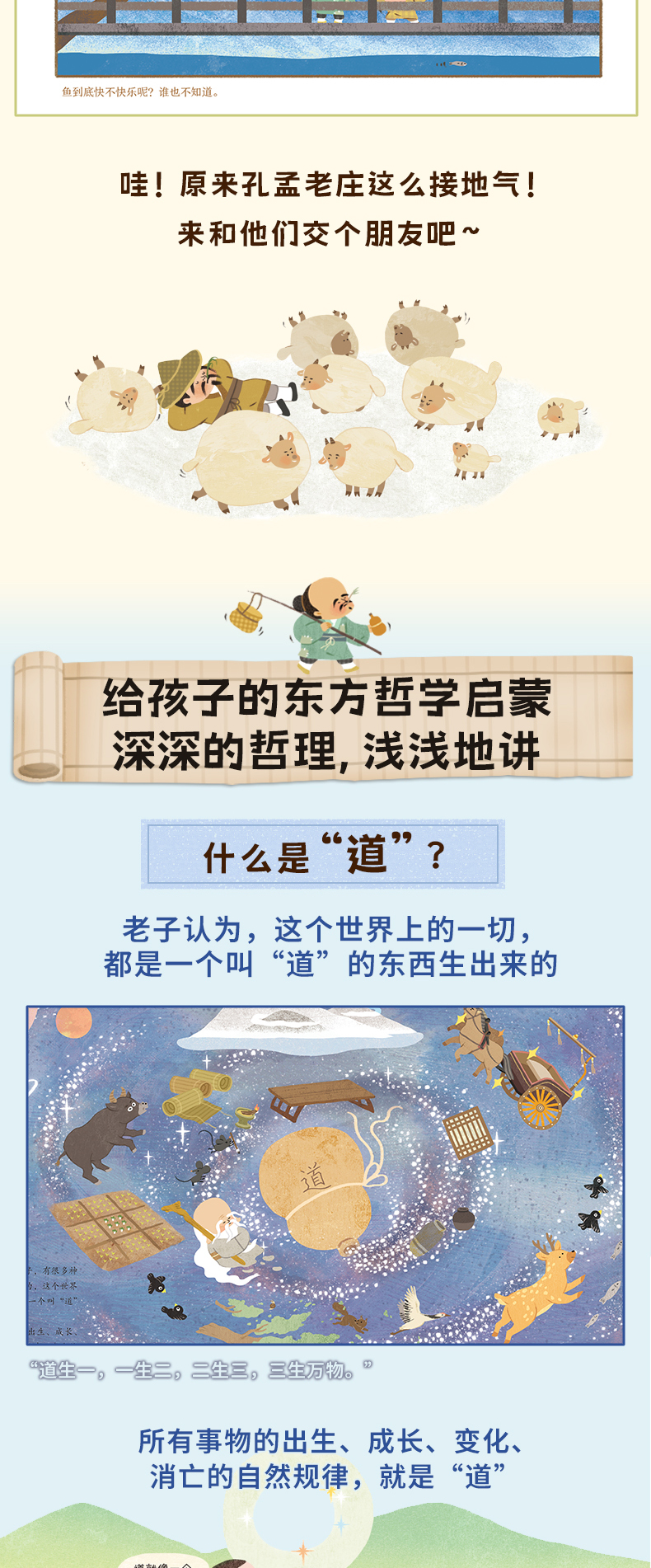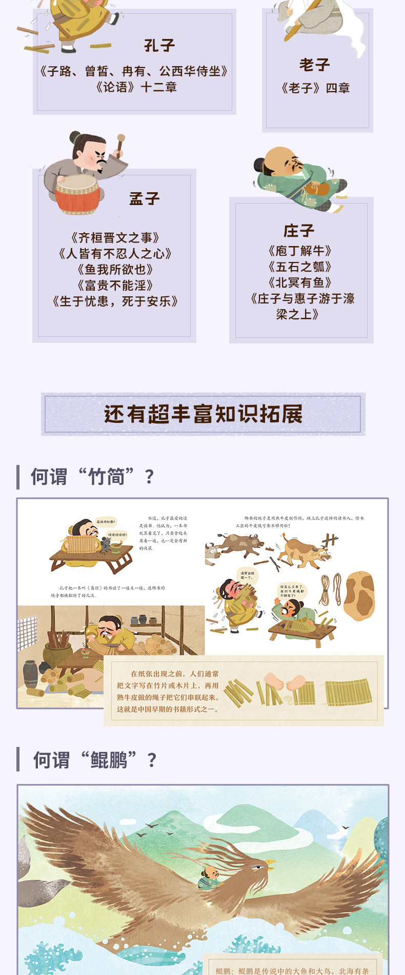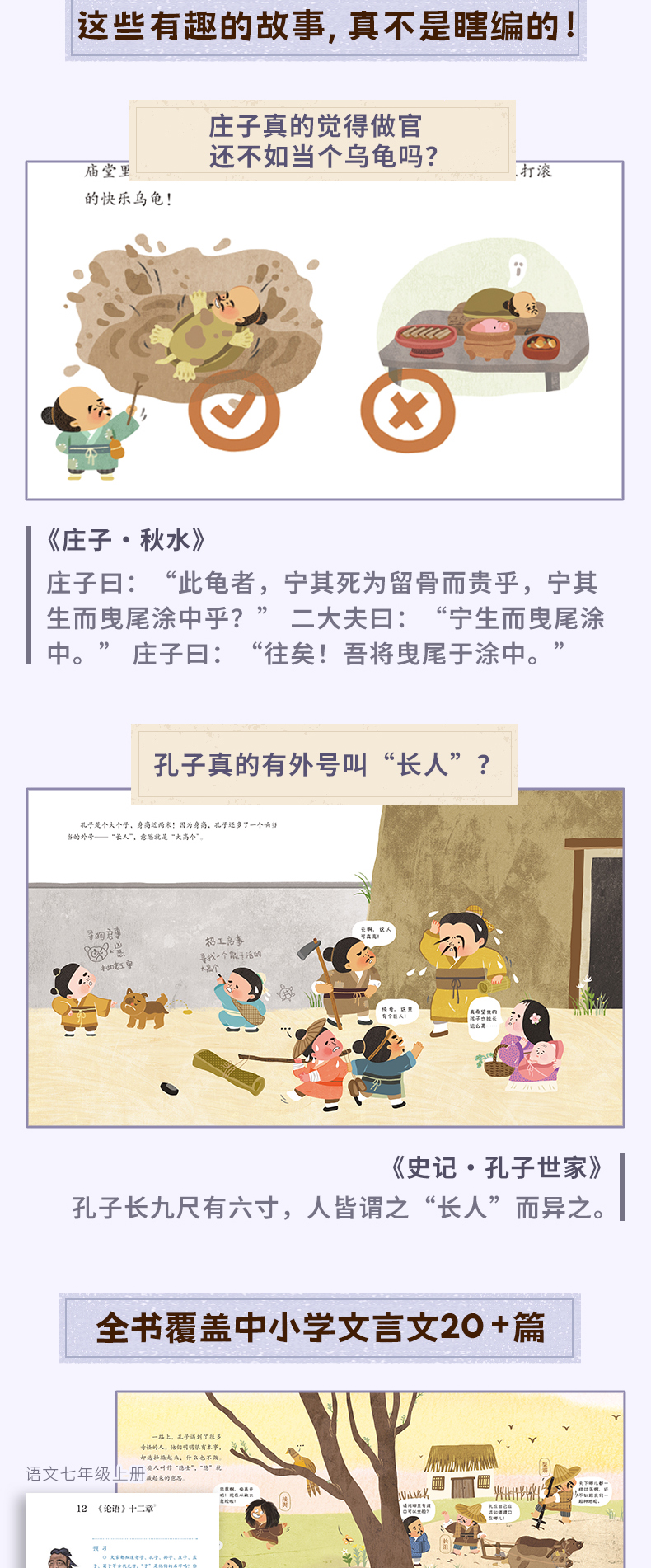 ★ 3. 覆盖了中小学文言文20+篇:对孔孟老庄的学习,贯穿孩子整个学生生涯,大地影响着孩子的未来。与2024年新教材修订“文化育人”功能相契合,不仅涵盖诸子的生平、著作,而且对他们的思想进行了幽默丰富的图像呈现,让孩子们能穿越时空感受中华优秀文化的伟大。