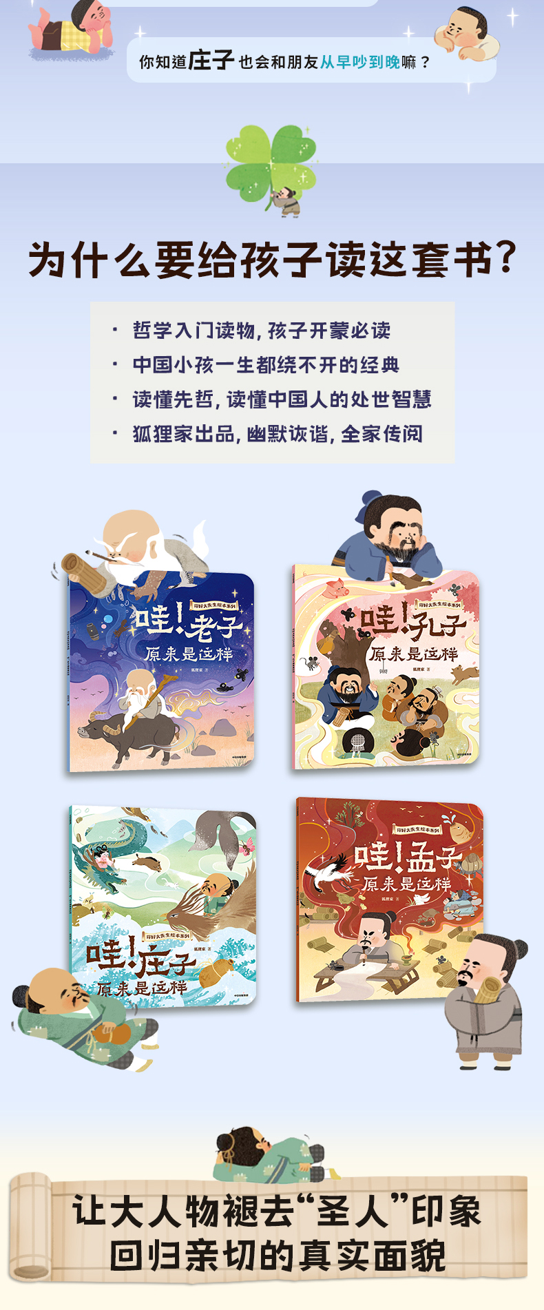 中国小孩一生绕不开,让先贤思想滋养今天的孩子们的精神内核。这是一套让历史大人物孔子、孟子、老子、庄子褪去“圣人”印象,回归亲切的真实面貌,颠覆你印象的东方哲学启蒙书!几千年来,是孔孟老庄塑造了中国人的底层人格,他们的言行思想既是上学课文,也是人生典。这套绘本以轻盈幽默的讲述方式、漫画感十足的萌趣视觉,将这些思想价值娓娓道来,让孩子们懂得生存的智慧和处世的方法。每本有可以让孩子和爸爸妈妈一起来讨论的话题:怎么样面对夸奖和批评?如何理解生命和死亡?为什么要学会主动思考?100+跨页场景手绘,100+典故故事,附赠互动音频故事,让孩子轻松读典,快乐长智慧!
