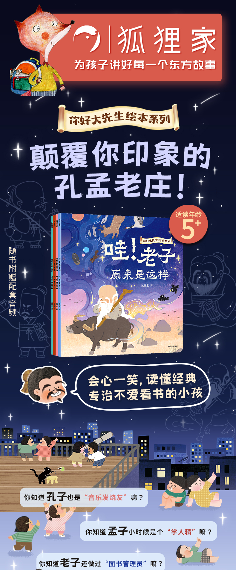 ★ 1. 千锤百炼:狐狸家品牌创始人阮凌自带队,倾全公司力量,耗时1825天(5年时间)倾心打造的重磅原创绘本系列。★ 2. 主题稀缺+形式新颖:市场有很多给5岁+孩子的古诗词绘本,但是讲先秦诸子的故事和思想的绘本却非常稀缺。这套书以孩子们喜爱的方式,将诸子思想中对孩子成长有益的内容,传达给孩子们,帮助他们理解、吸收甚至重述先哲智慧的思想精华。