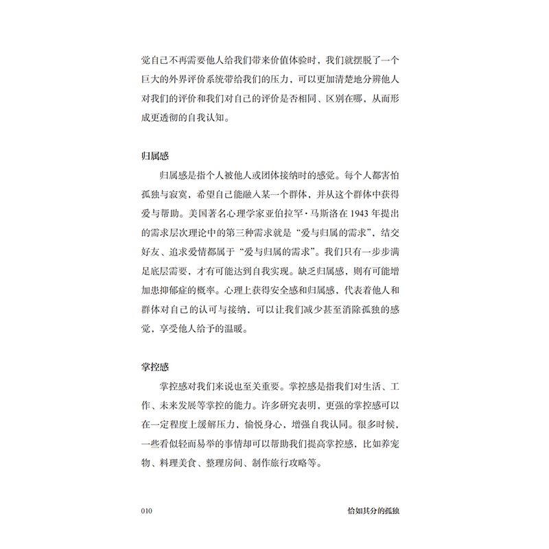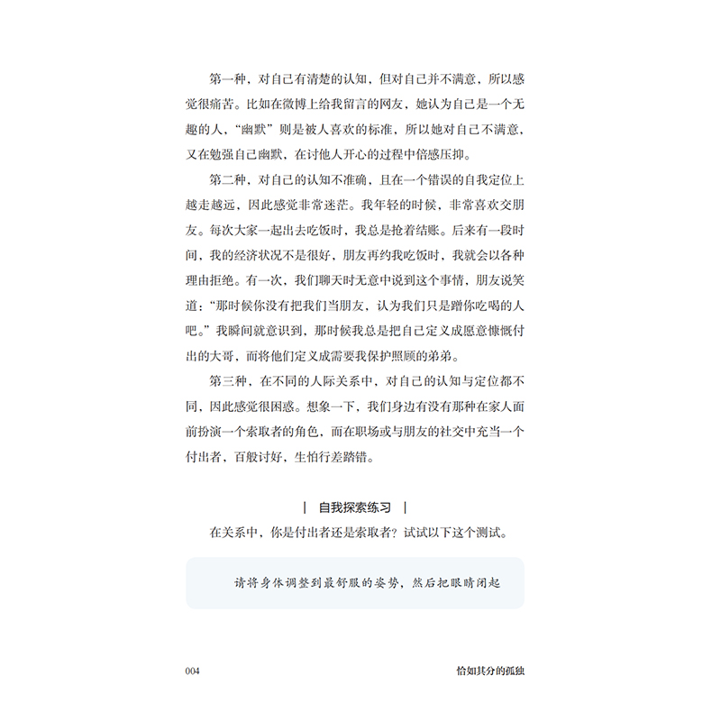 【前言】孤独,是个伪命题,是个自相矛盾的概念。在精神分析的视角下,除非你的内在有恒常稳定的客体,否则你无法抵达孤独,或者说安于孤独。但孤独本指独自一人,若是有了这样一个内在客体的存在,孤独又何以成为孤独?这段话读起来有点儿拗口,也似乎有些哲学的味道,但这并不是一本哲学书,而是一本心理学读物。所以,下面我来试着解释一下上面这段话:人之所以能够忍受孤独,主要得益于在童年时获得了父母的积极照料,拥有如此体验的人最终会将这些照料内化为对自我的关爱与陪伴。比如生活中你会看到一些照顾洋娃娃的孩子,他们会给洋娃娃穿衣喂饭,;哎呀,你冷了,那我给你盖被子;哎呀,你生病了,那我带你看病打针这样的行为呈现,就代表这个孩子的内在已经有了一个照顾自己的客体出现,她正在将她妈妈和她的关系呈现在她和洋娃娃的关系上:在我照顾洋娃娃的那一刻,我是一个好妈妈,而洋娃娃是那个曾经被妈妈照顾的自己。你可以观察一下,一般来说,妈妈如何对待自己,孩子便会如何对待洋娃娃。再往后发展,孩子对待洋娃娃的方式,也会成为孩子对待自己的方式。若是孩子长大成人有了自己的孩子,那么这个方式也会成为她对待孩子的方式。如此传承下去,若是未经觉察和改变,这些无形的方式会像传家宝一样一代代传承下去。很多时候,我们无法抵达恰如其分的孤独,是因为我们一直想寻找一个好的客体来弥补曾经的缺失。我们纠结于过去,紧攥着曾经经历的一些创伤或痛苦不肯放手。精神分析学家弗洛伊德曾说:;未被表达的情绪永远不会消失,它们只是被活埋了,有朝一日会以更丑陋的方式爆发出来。这里的;未被表达的情绪,背后藏着;无法接纳的过去。我们缺乏对过去的表达,缺乏被看见,被理解,被接纳。所以我们拒绝拥有过去,但同时也很难拥有未来,于是我们时常感到孤独,又时常想回避孤独,无法享受孤独,无法抵达孤独。这也正是我研究关系心理学、从业心理咨询师的初衷:当我们能够在一段关系中,被一个鲜活的客体接纳与镜映,我们便能拥有前行的勇气与力量。我的另一本书《走出原生家庭》的封面上写着一句我很喜欢的话:;原生家庭带给你的是创伤还是礼物,取决于你的选择。当有一天我们不再选择与过去纠缠,我们就获得了自由,就拥有了未来,就学会了善待自己,就获得了开篇所说的那个恒常稳定的客体。这本书里有很多关于我自己的故事,也有很多我陪伴他人重新拥抱过去的故事。或许你也能从中看到自己的影子。像所有传家宝一样,如果我们都能在自我探索的路上觉察与调整,并获得积极照料自己或他人的能力,那将是整个家庭的幸事,甚至是人类的幸事。此书部分内容来自我直播课的分享,言之甚少,远不足以成为系统的知识类读物,更无法承诺读后有疗愈效果;但若能偶尔引你拊髀深省,那将是我的幸事。愿你此生能拥有恒常稳定的他人,也愿你能成为别人心中恒常稳定的他人,终究有能力抵达恰如其分的孤独。最后,感谢光尘及出版社的编辑老师们为此书做出的巨大贡献!