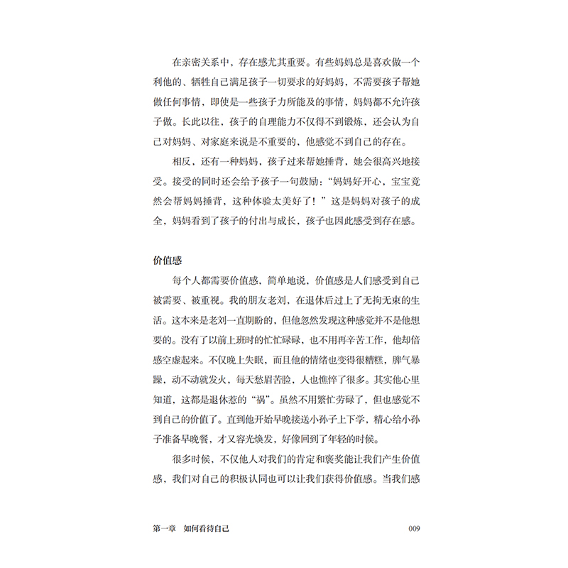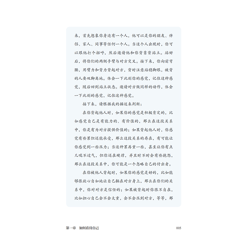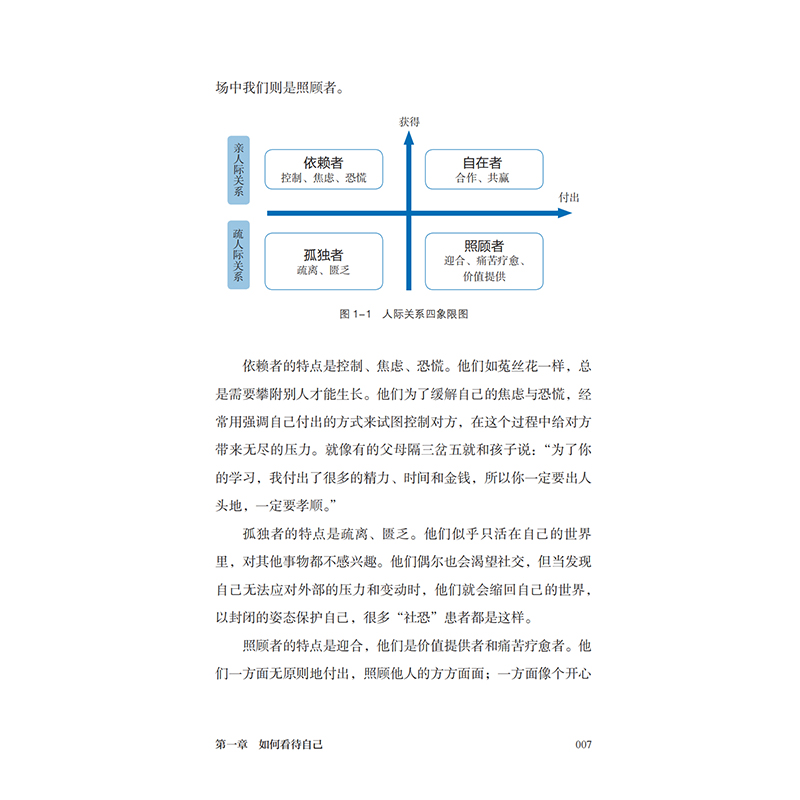 目 录第一章 如何看待自己第一节 你对自己的定义,决定了你的关系 / 003第二节 在关系中,你属于哪种模式 / 013第三节 了解真实的内在自我 / 022第四节 接纳一个完整的自己:自卑与自尊 / 034第二章 如何看待他人第一节 忽视 / 045第二节 讨好 / 057第三节 讨厌 / 070第四节 嫉妒 / 078第五节 厘清关系中间的角色 / 089第三章 重新面对冲突第一节 自我价值感冲突 / 103第二节 内疚感冲突 / 111第三节 安全感与控制欲的冲突 / 119第四节 自给自足与被照顾的冲突 / 132第五节 独立与依赖的冲突 / 141第四章 重新认识孤独第一节 为什么认识很多人,但还是感到孤独 / 153第二节 为什么牺牲这么多,依然不被认同 / 165第三节 建立有效社交,看见关系中的你我 / 176第四节 告别无效社交,减少自我内耗 / 186第五章 真正的自我接纳第一节 如何从自我挑剔转向自我接纳 / 197第二节 如何建立一段健康的关系 / 216第三节 你如何爱自己,别人就如何爱你 / 223第四节 如何做出人生的关键选择 / 233第五节 如何寻找生命中的合伙人 / 241第六章 心灵的慰藉第一节 什么样的人更容易幸福 / 253第二节 怎样的独处能让人获得滋养 / 262第三节 如何与外在世界相处 / 271