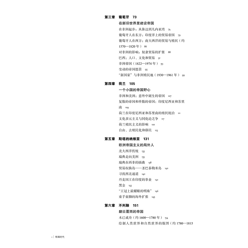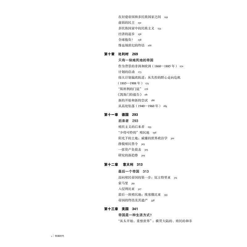《帝国时代》有13章,每章都由一位专家撰写,且采用一种编年史的写作路径,从地缘政治的、经济的、社会的或是文化的视角检视了一系列特定的帝国:从16世纪之前便开始在世界范围内扩张的欧洲强国——如葡萄牙、西班牙、英国、法国、比利时和荷兰这种“古典”的和扩张性的海外帝国,还有斯堪的纳维亚国家所建立的不那么知名的前哨,以及如德国和意大利这样短命的帝国后来者。在这些例子之外,还增加了奥地利—匈牙利这个陆上帝国、沙皇俄国、奥斯曼苏丹国和美国。本书集中讨论帝国扩张和收缩的模式与周期,推动扩张的意识形态以及一些殖民扩张中反过来对宗主国家所造成的影响。