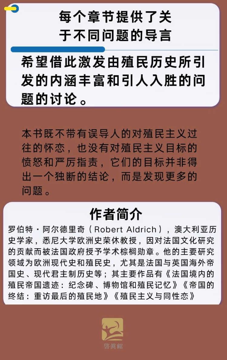 罗伯特·阿尔德里奇(Robert Aldrich),澳大利亚历史学家,悉尼大学欧洲史荣休教授,因对法国文化研究的贡献而被法国政府授予学术棕榈勋章。他的主要研究领域为欧洲现代史和殖民史,尤其是法国与英国海外帝国史、现代君主制历史等;其主要作品有《法国境内的殖民帝国遗迹:纪念碑、博物馆和殖民记忆》《帝国的终结:重访最后的殖民地》《殖民主义与同性恋》。