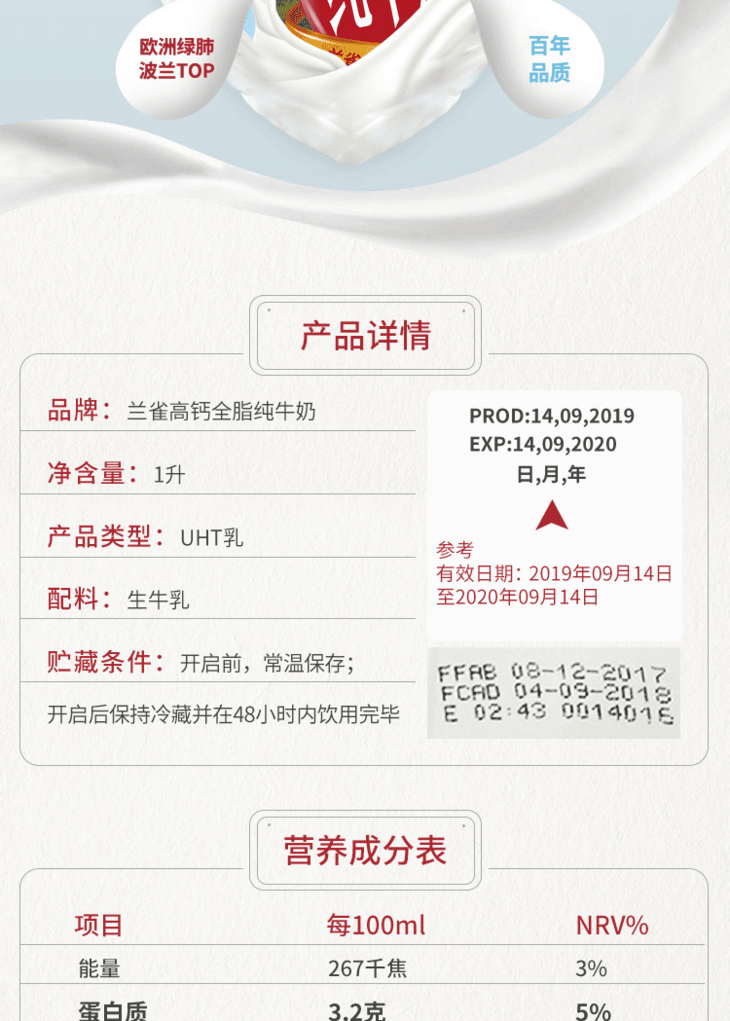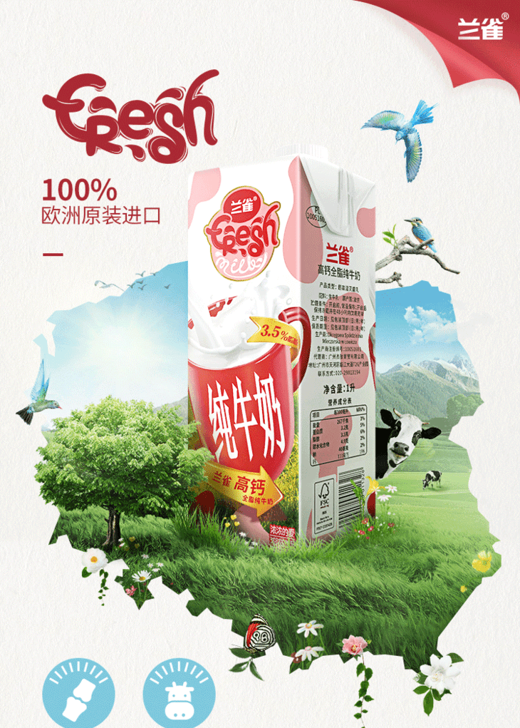 【备用】【整箱】波兰进口兰雀唯鲜系列全脂纯牛奶1L*12盒