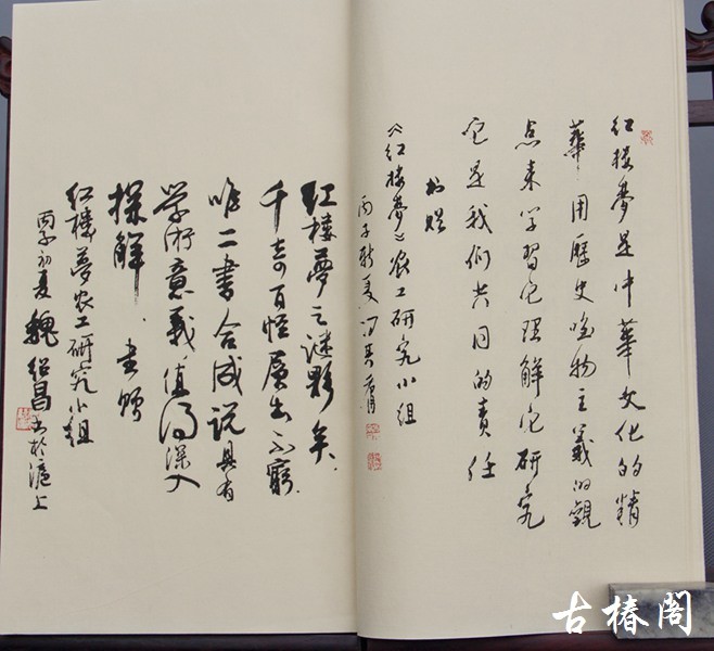 该书宋锦团花为函,绚丽夺目,花绫为面,大方得体; 真丝书签,古朴典雅,耿绢包角,气韵十足。成书高29厘米,宽18.5厘米,用纸原是古椿阁二十年前库存安徽泾县特质手工宣纸,色泽浅黄,古色古香。