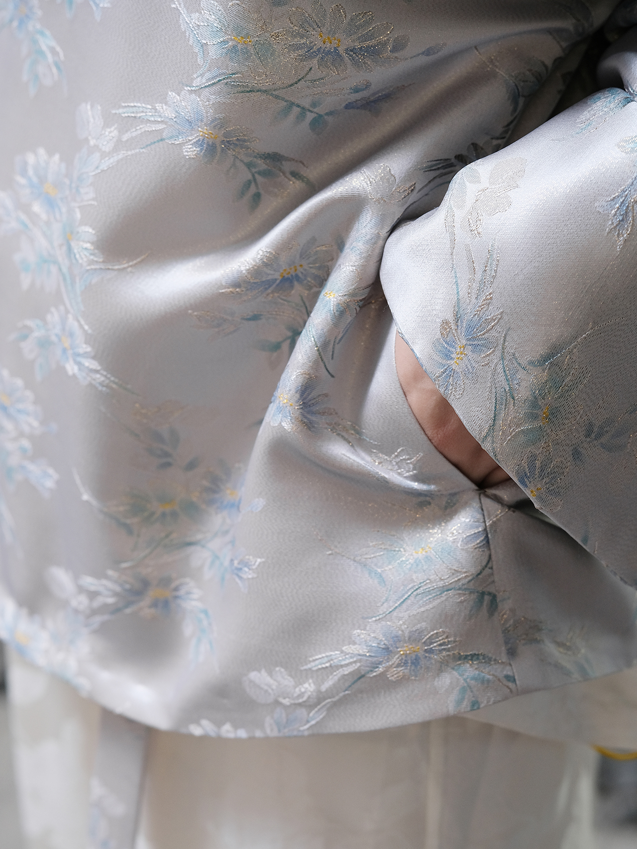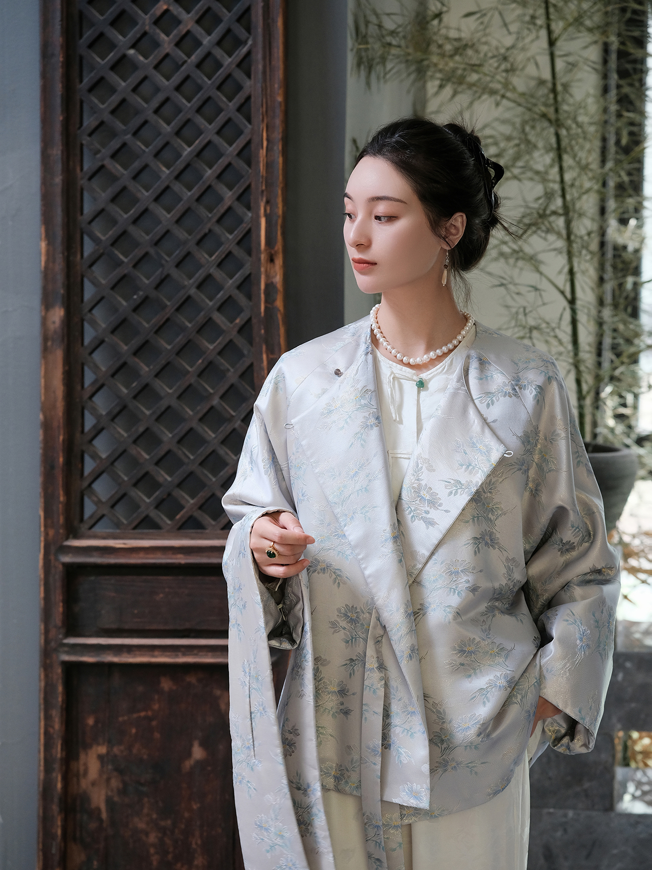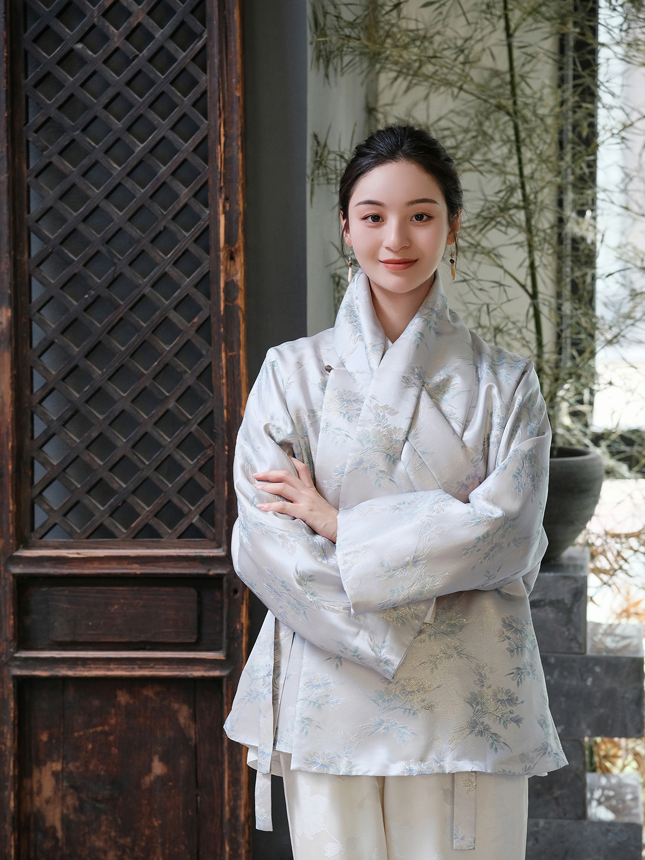 盛唐婧 |圆领团花丝麻提花宽袖上衣-白色