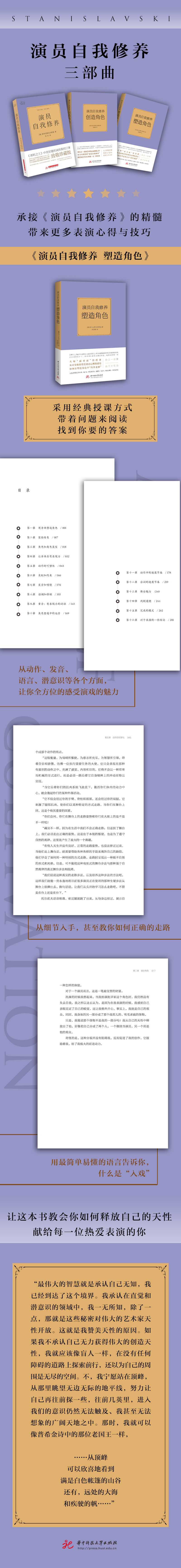 《演员自我修养:塑造角色》,它承接上一部《演员自我修养:创造角色》,是以戏剧学校师生课堂对话形式写就的日记体著作。全书从用身体塑造角色、装扮角色、角色和角色类型、动作的可塑性、发音与唱歌、语调和停顿、角色塑造中的远景、动作中的速度节奏、舞台魅力、戏剧道德等多方面讲述表演的方法和技巧。这不仅是一部经无数表演工作者成功检验的关于演员职业、责任与使命的工具书,更是一部关于演员与社会相结合,提升与完善演员艺术修养、道德修养的人生巨著。