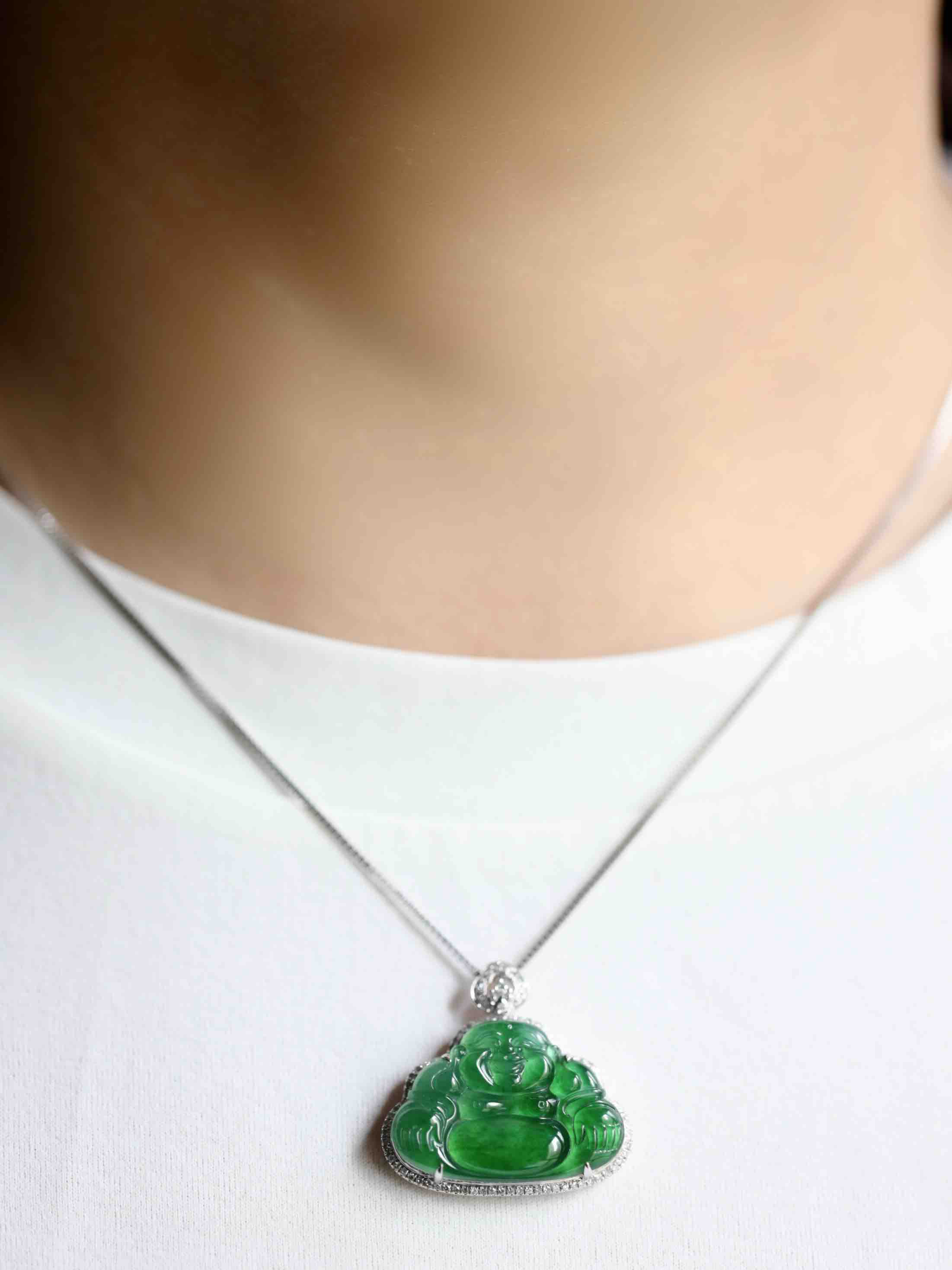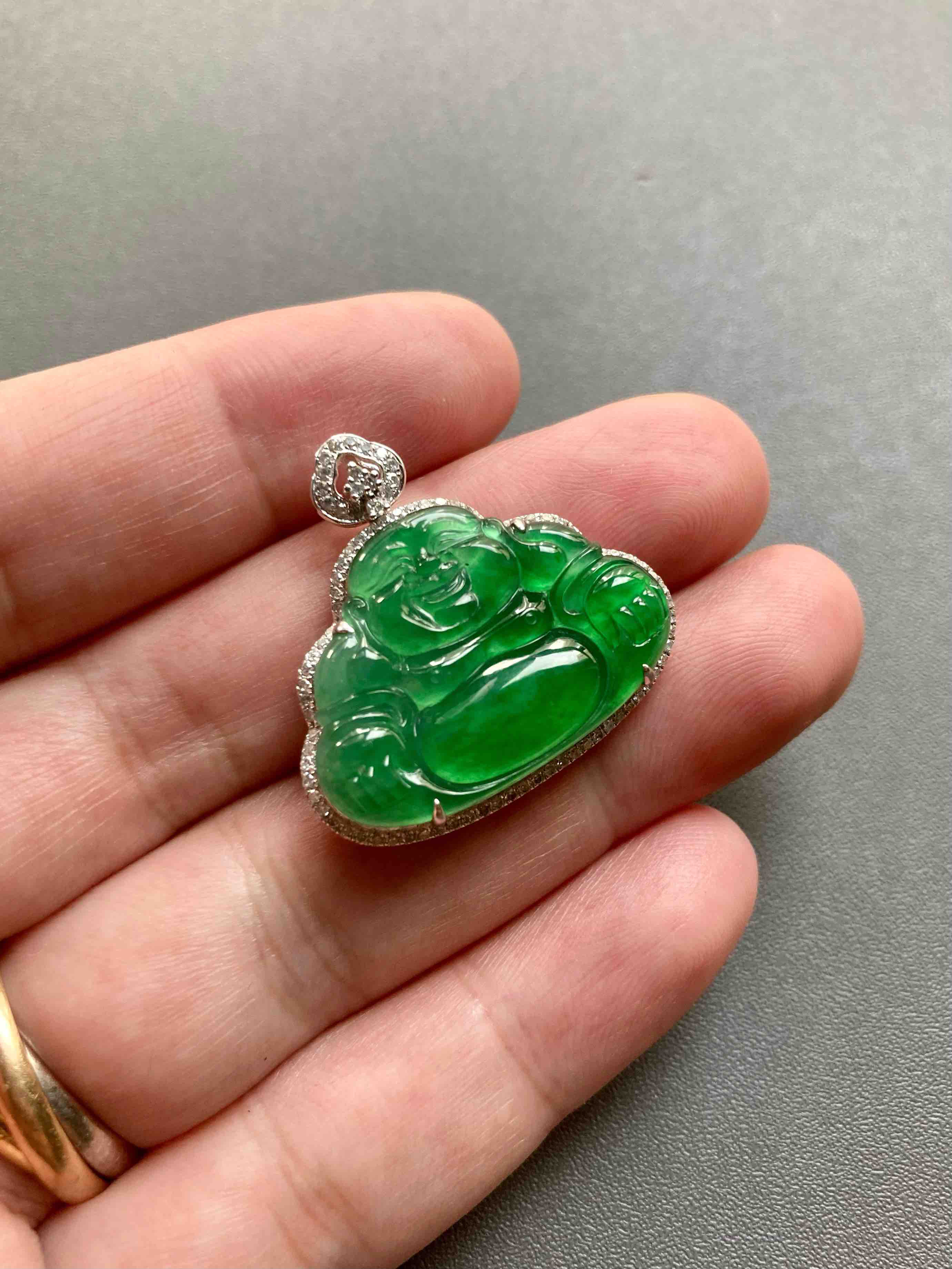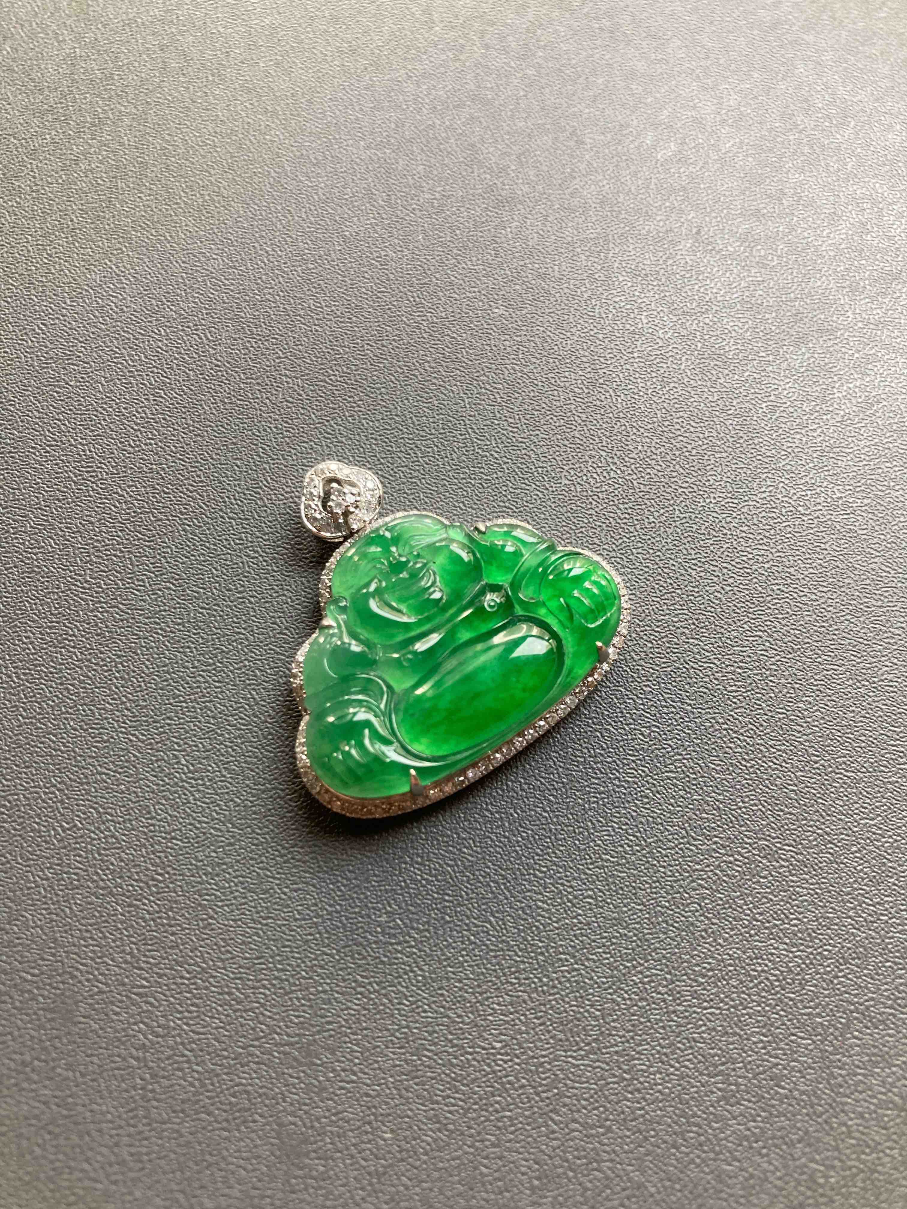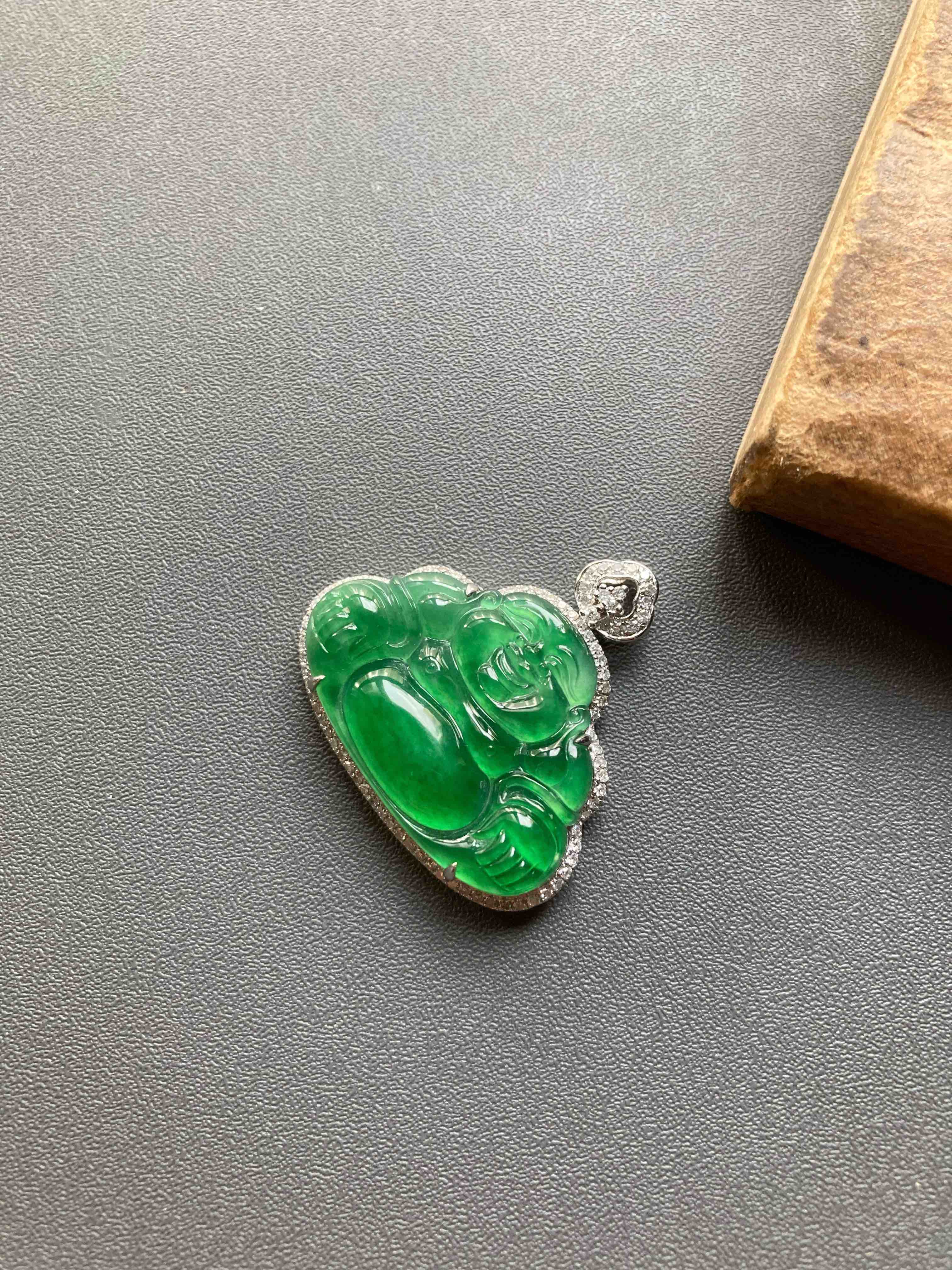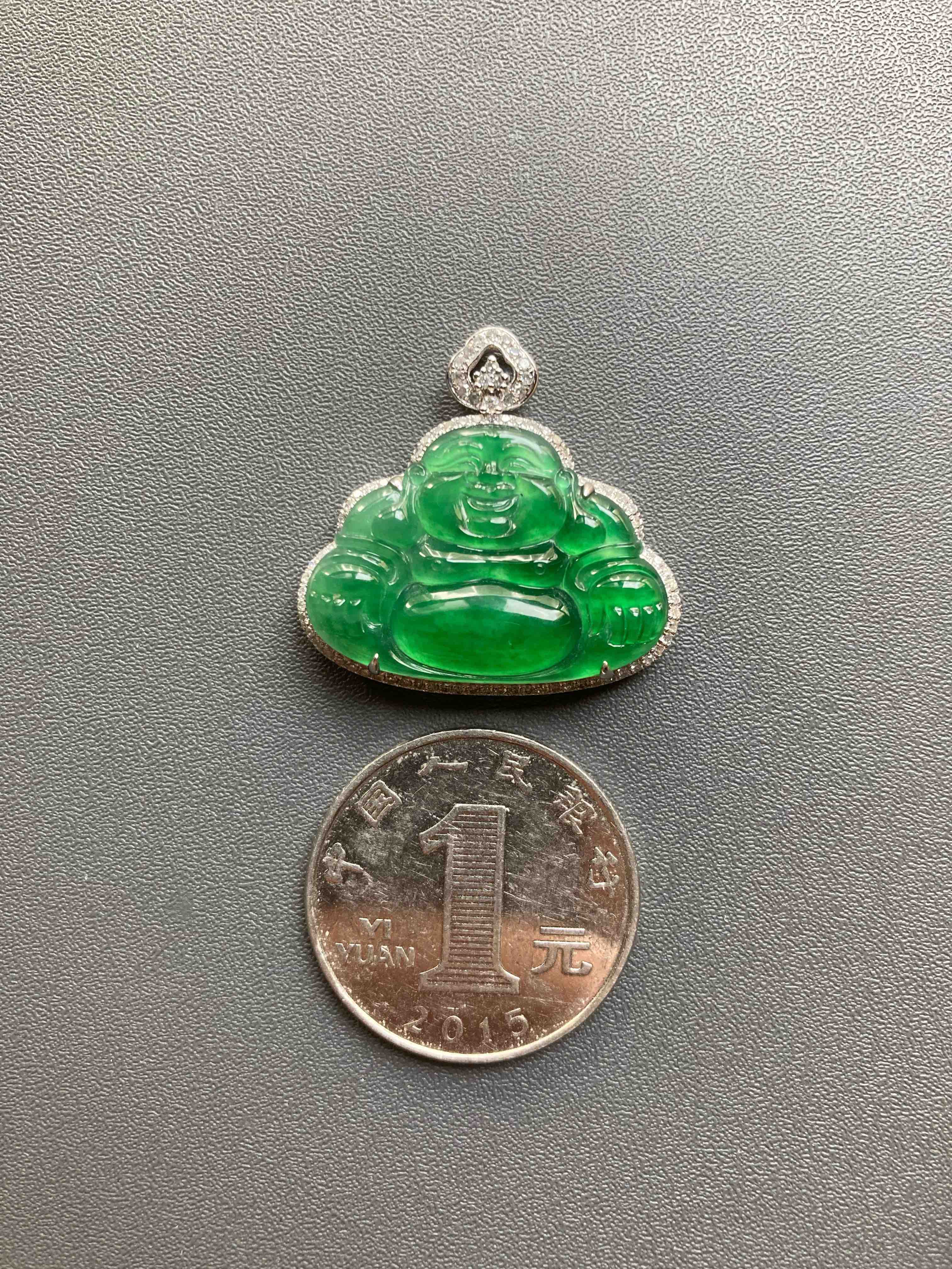 高冰种阳绿翡翠大弥勒佛18k白金钻石镶嵌