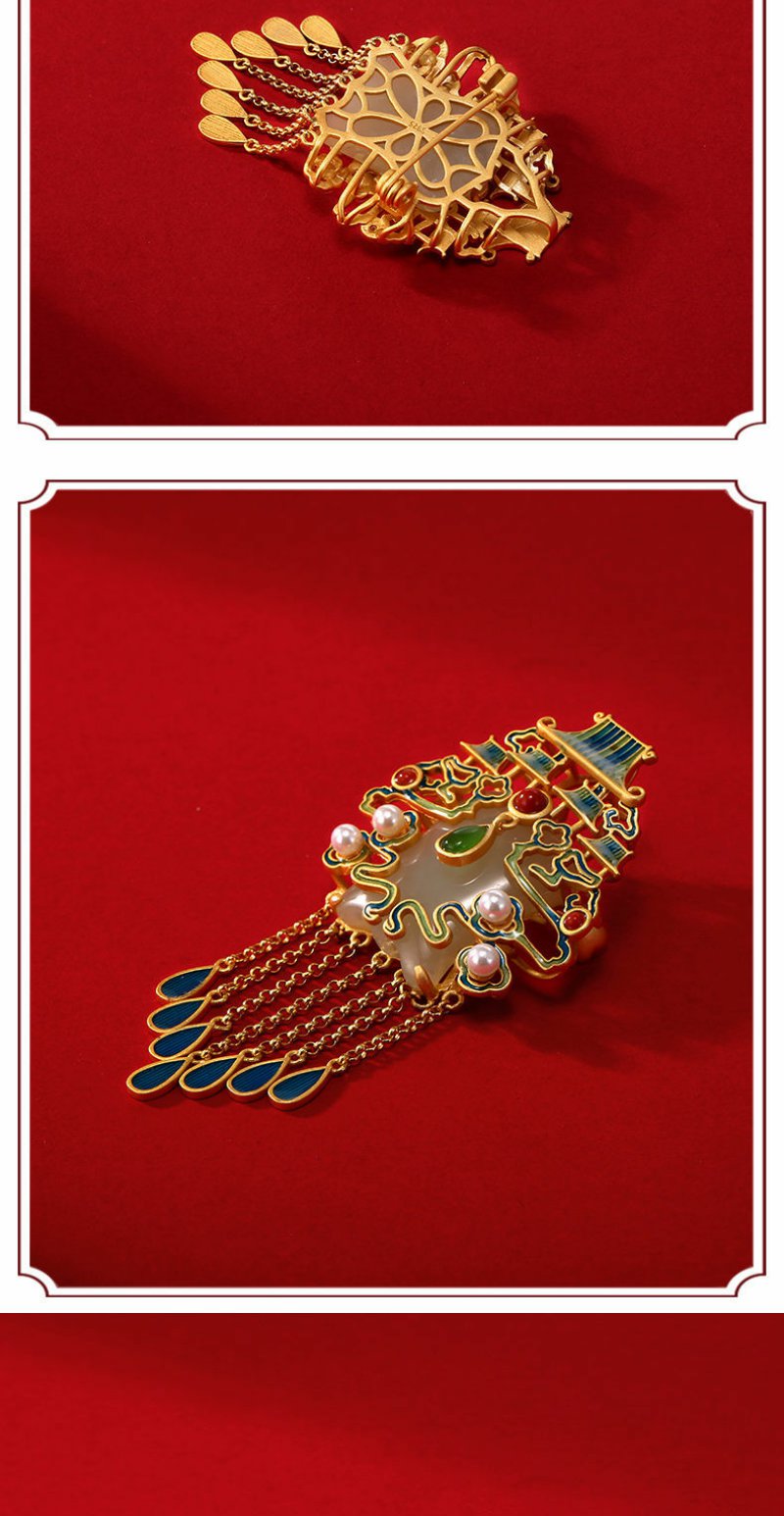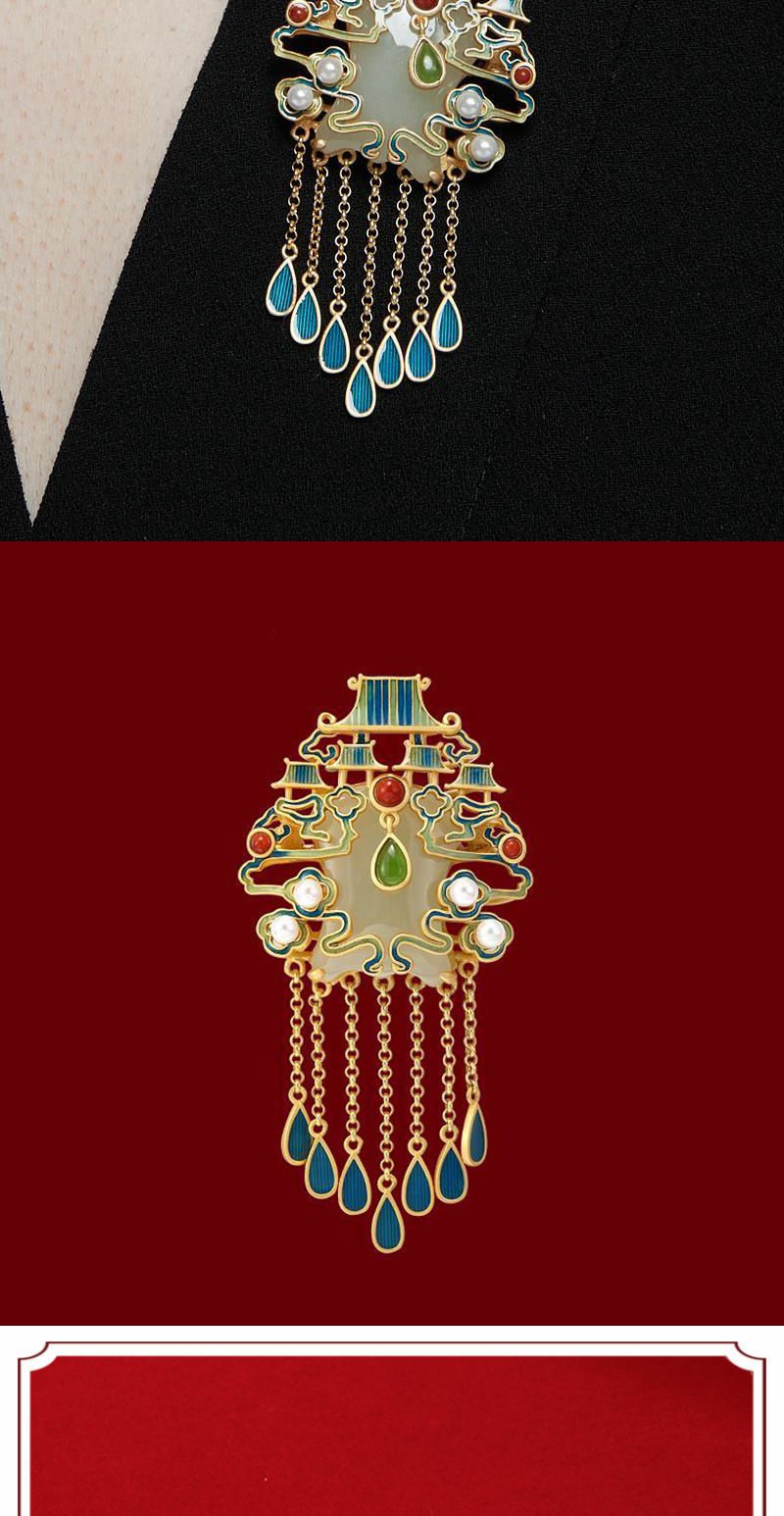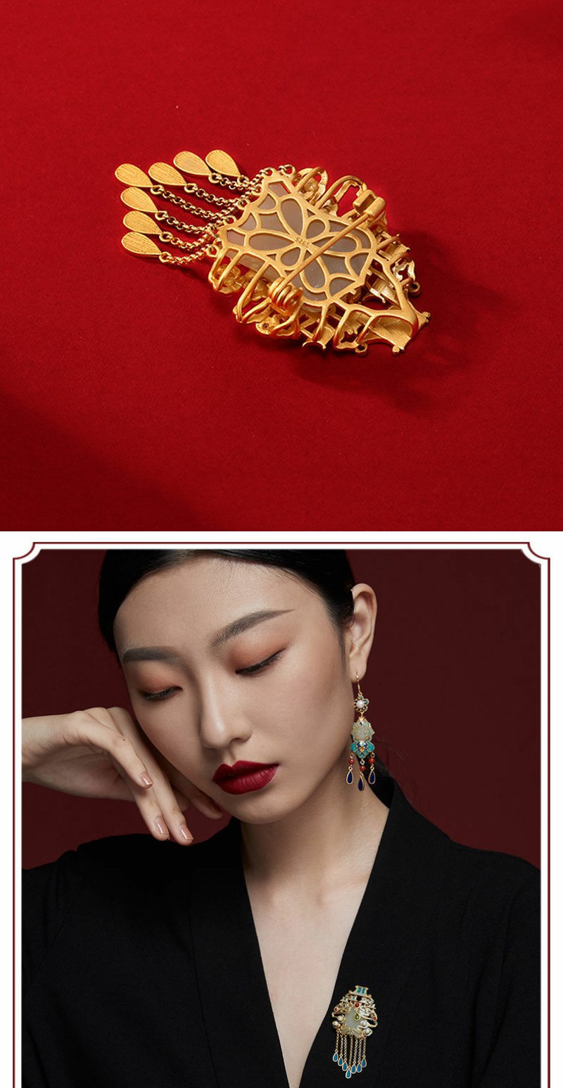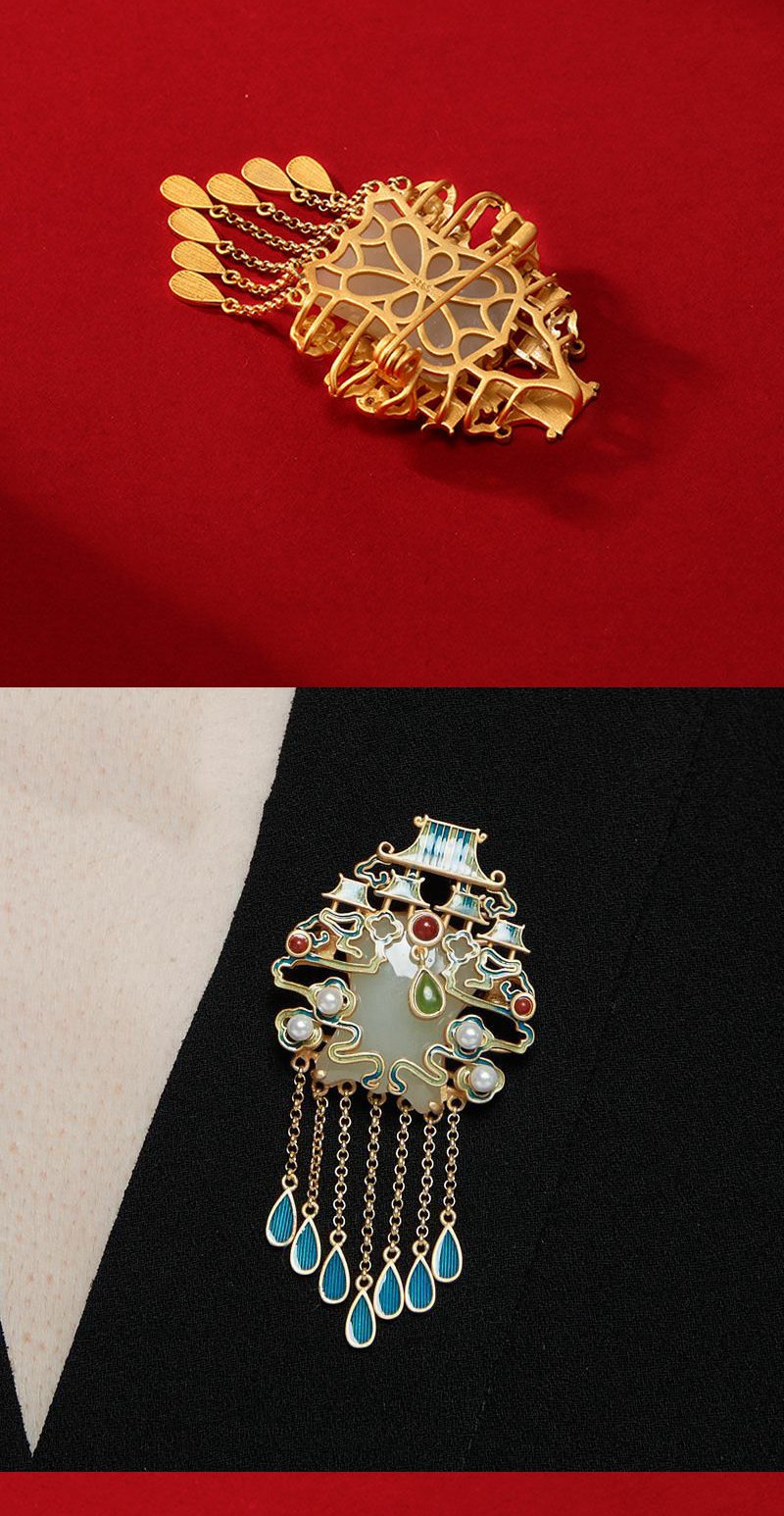 天然和田玉南天门胸针镶S925纯银复古流苏胸花奢华冷珐琅胸针饰品