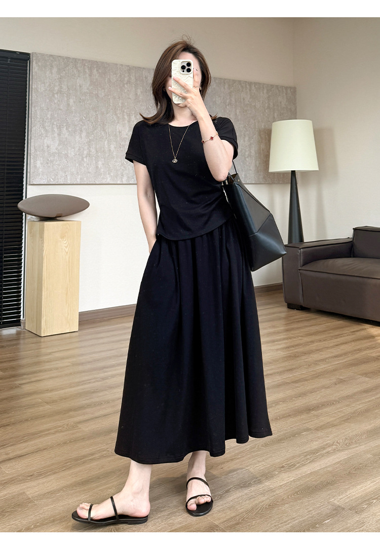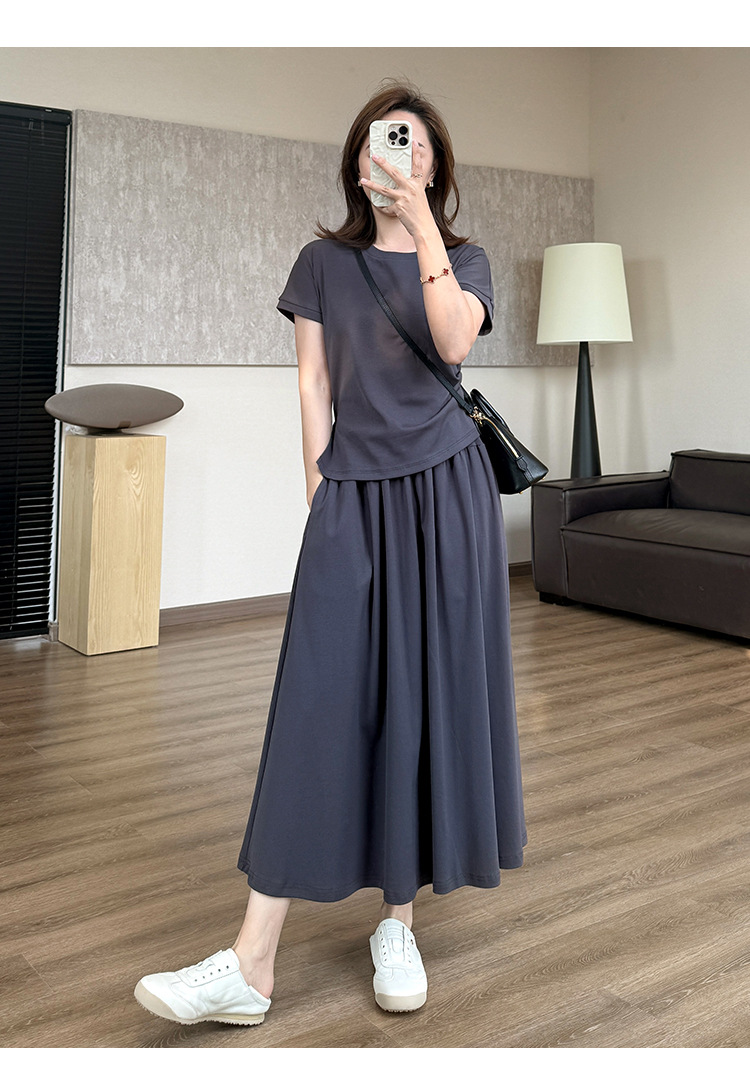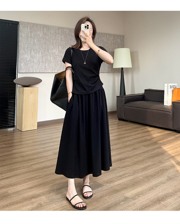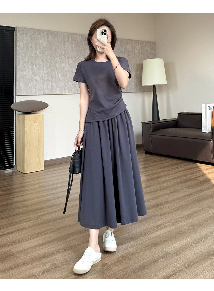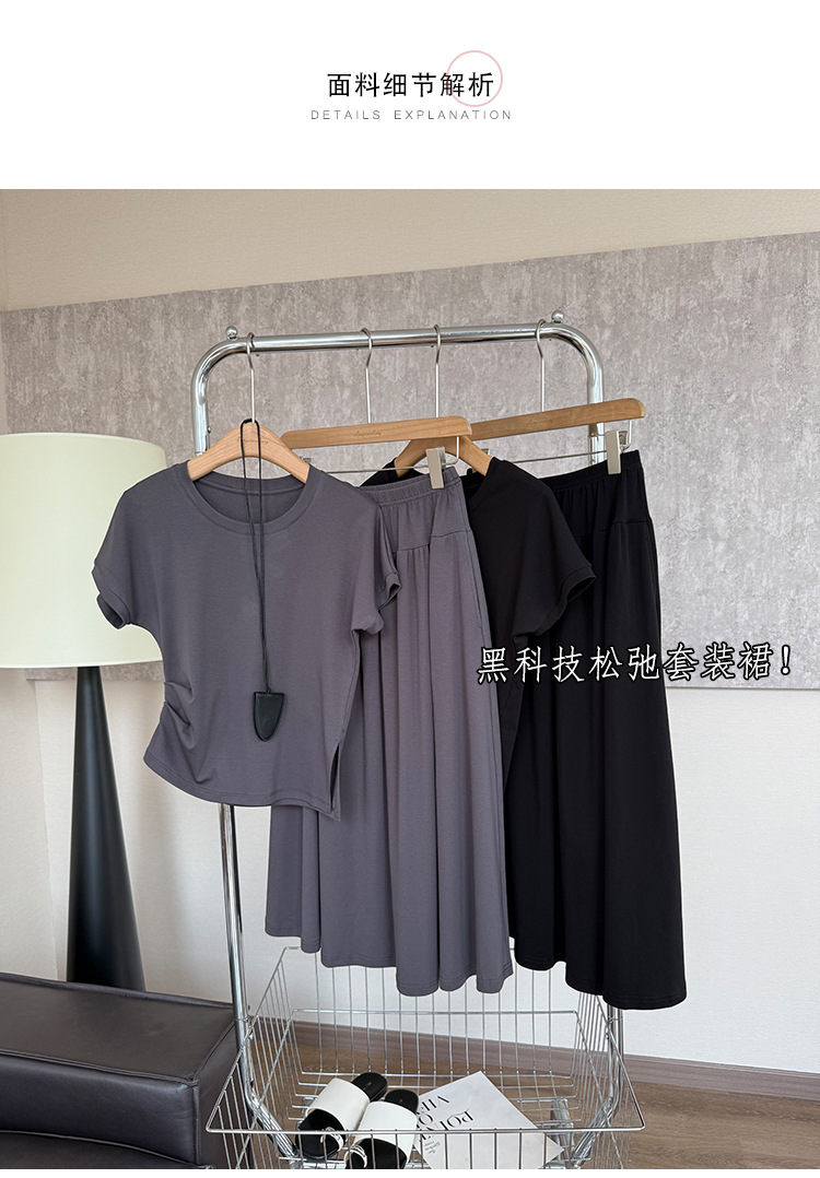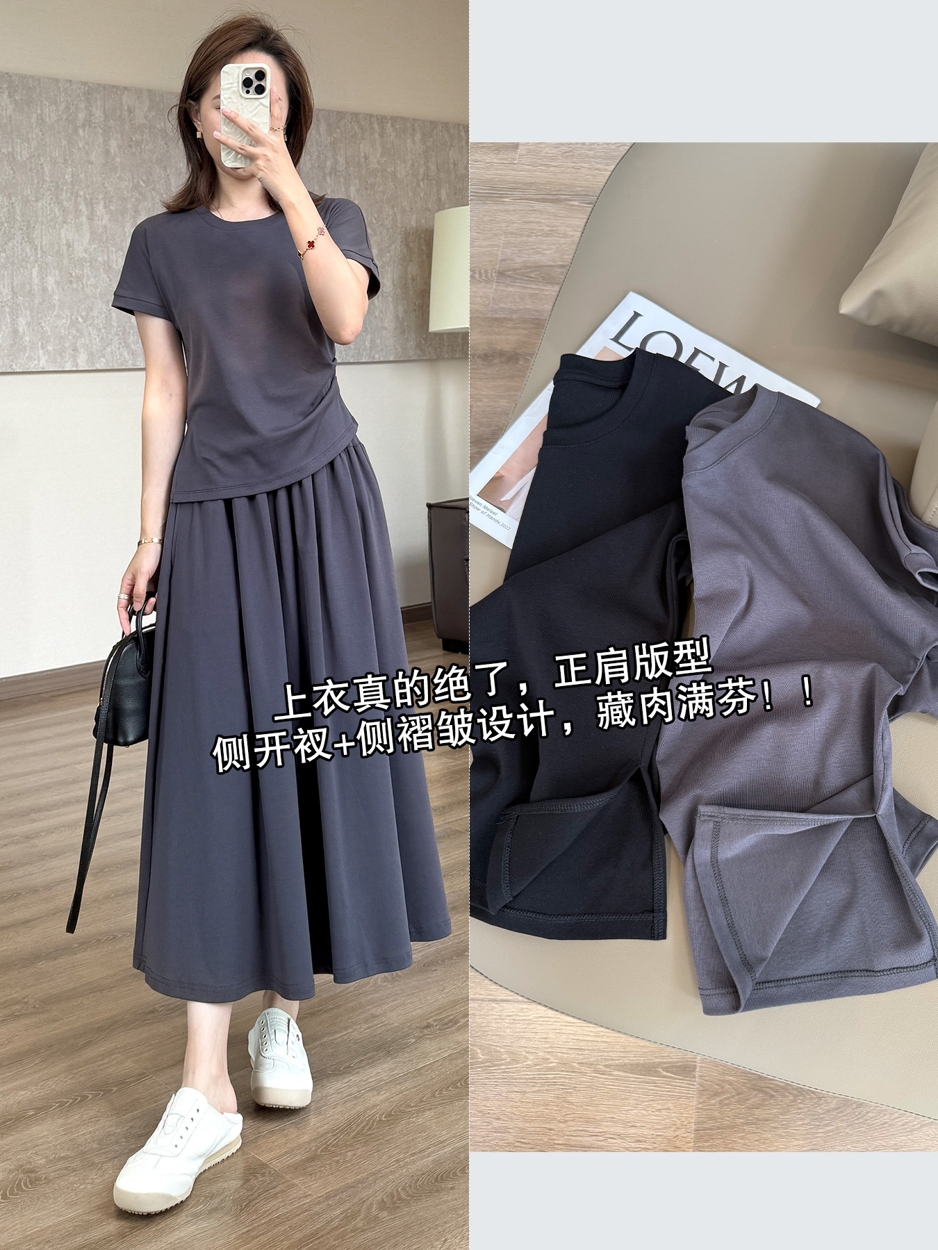 重塑腰线松弛套装裙!2025遮肉收腰开叉短袖T垂感口袋A字裙T裙