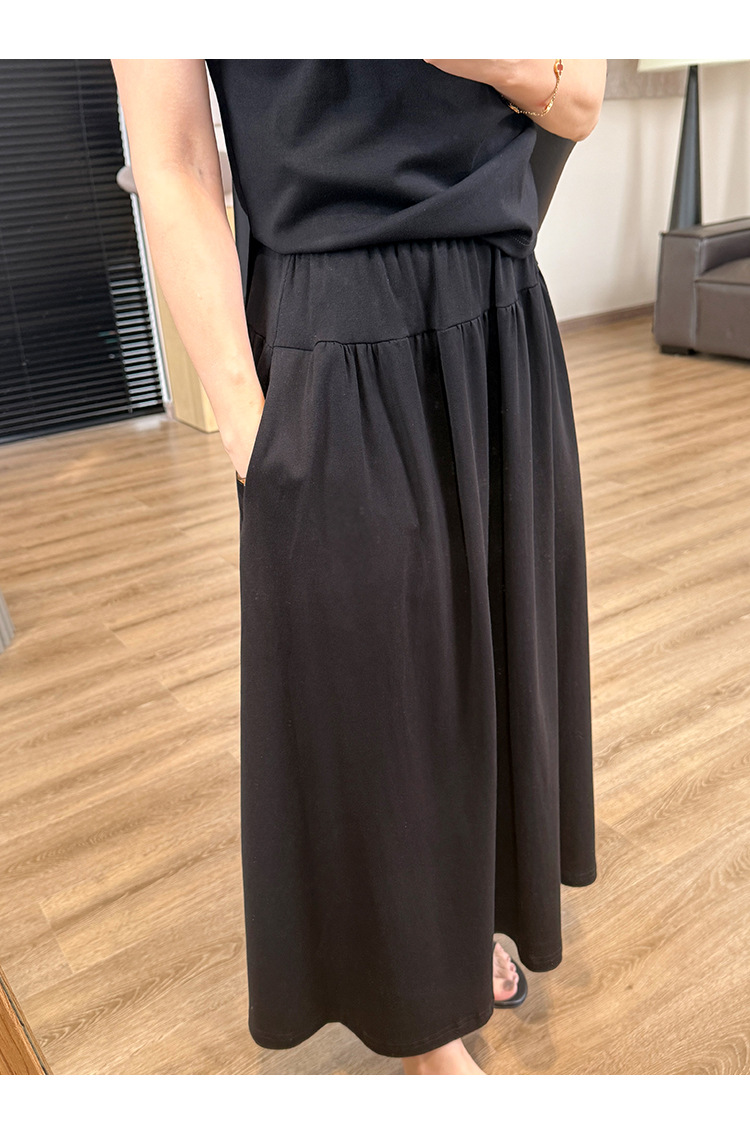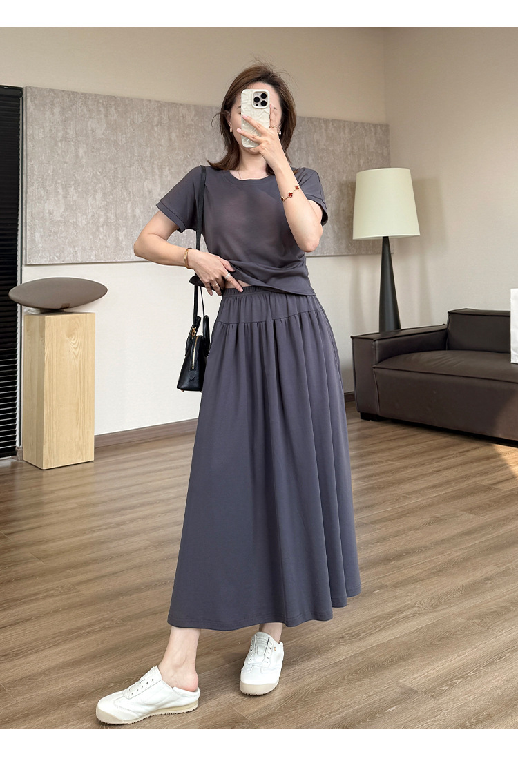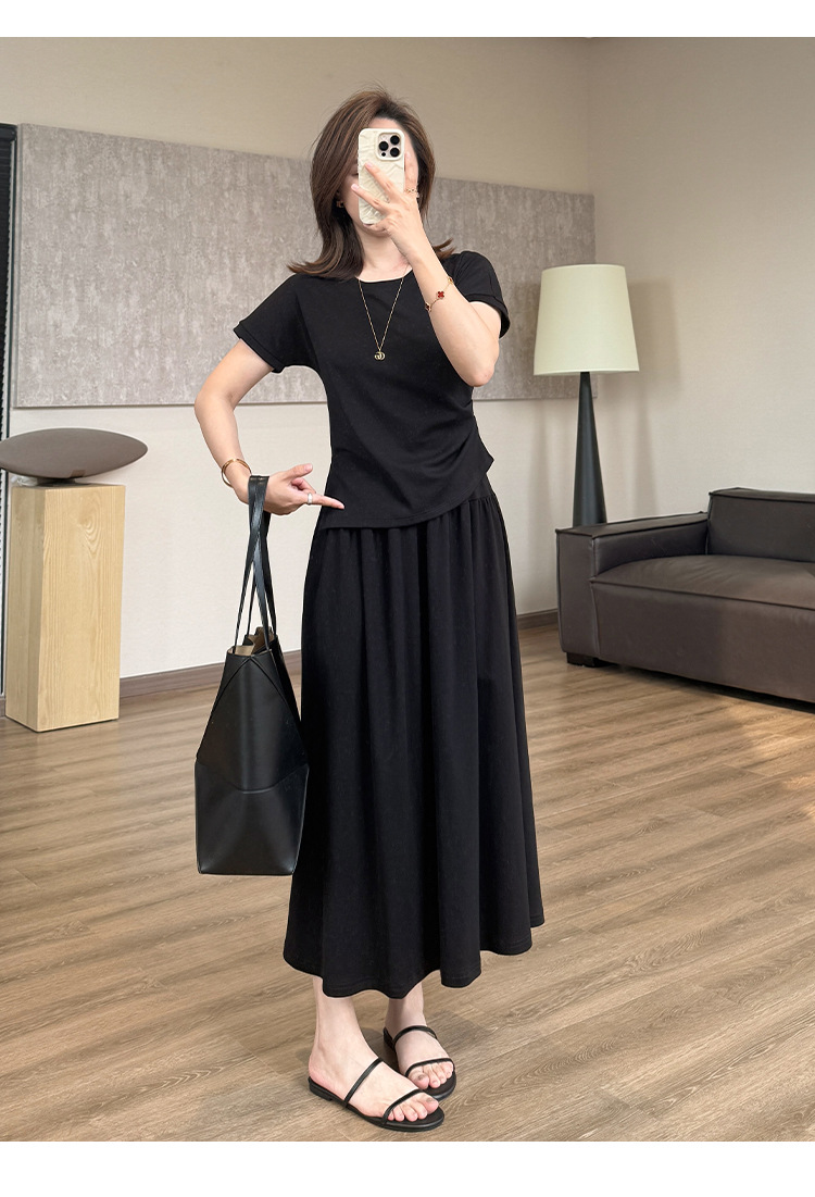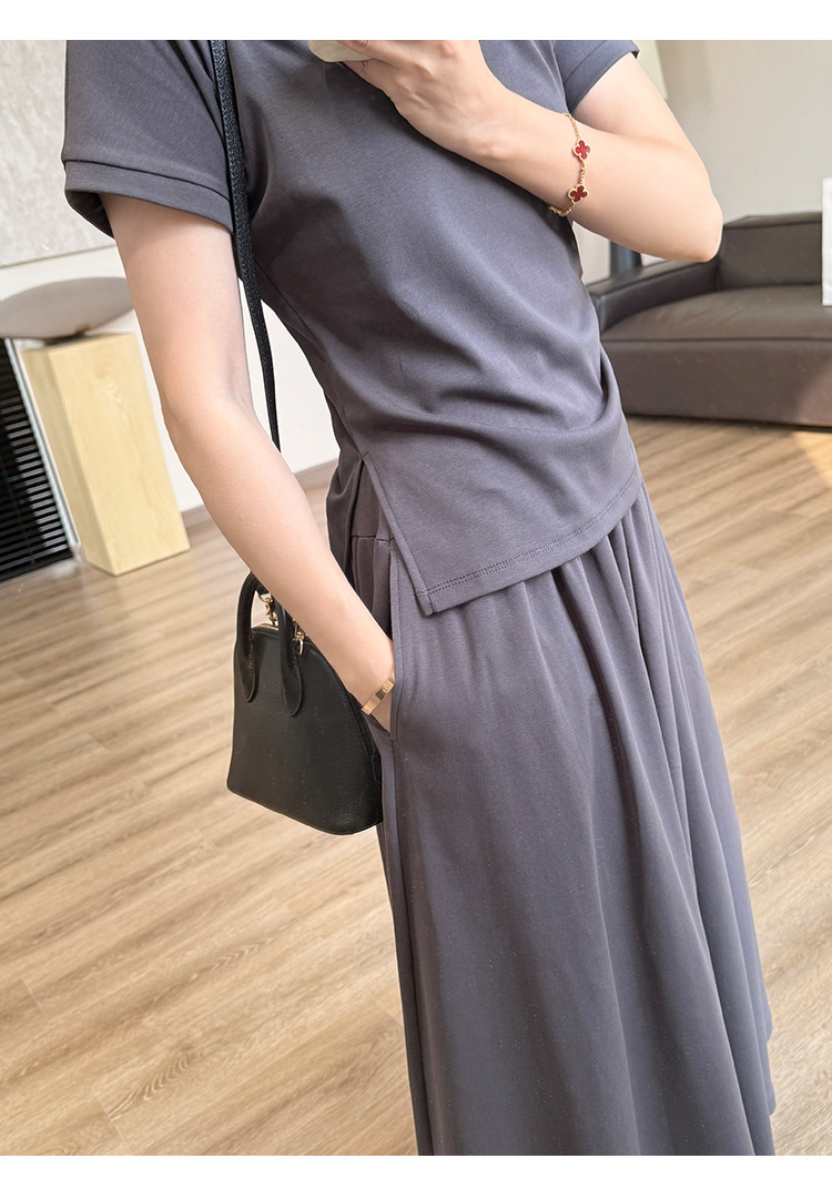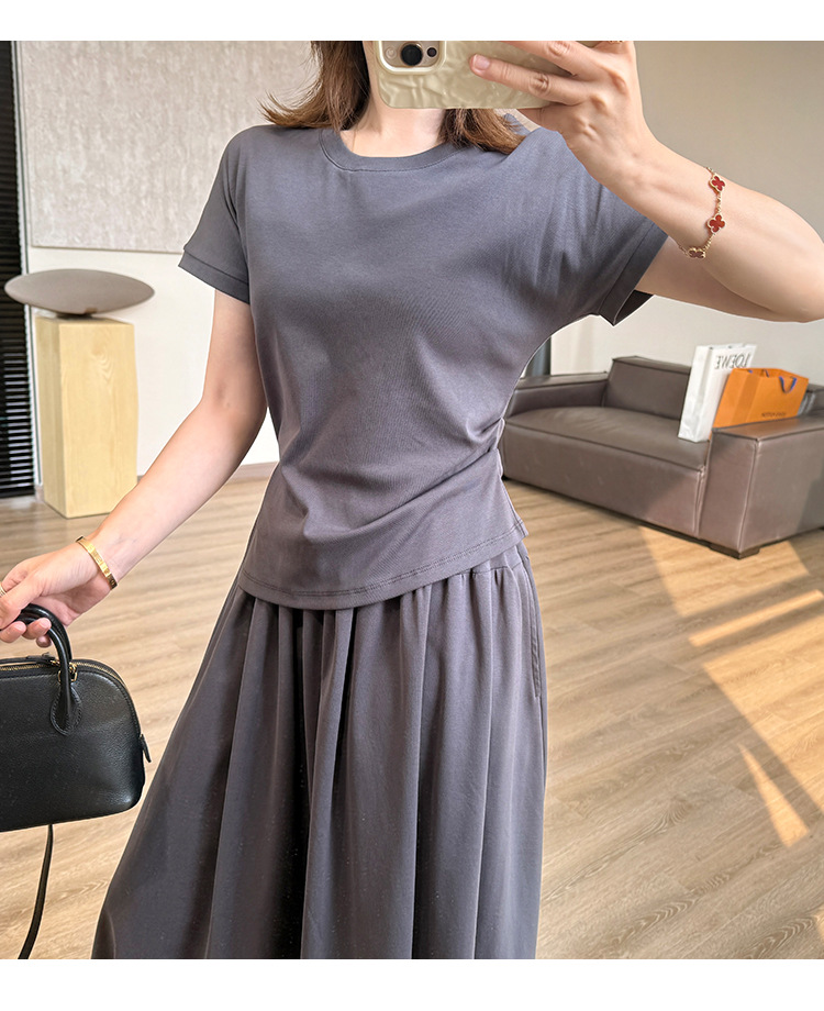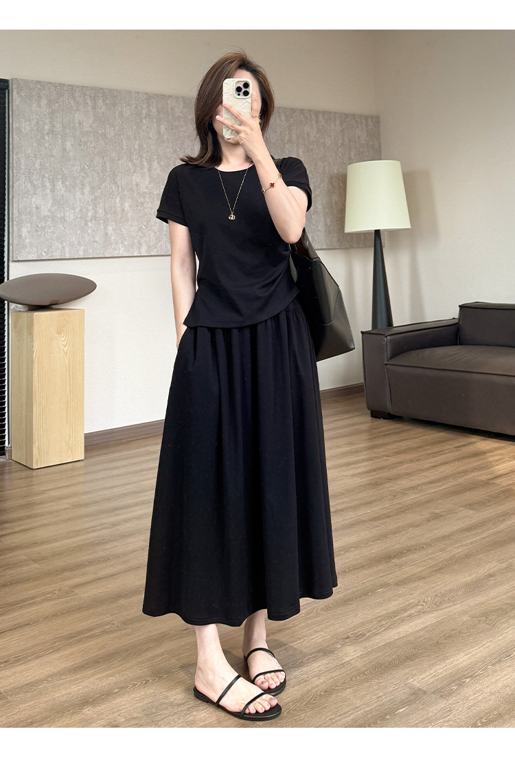 重塑腰线松弛套装裙!2025遮肉收腰开叉短袖T垂感口袋A字裙T裙