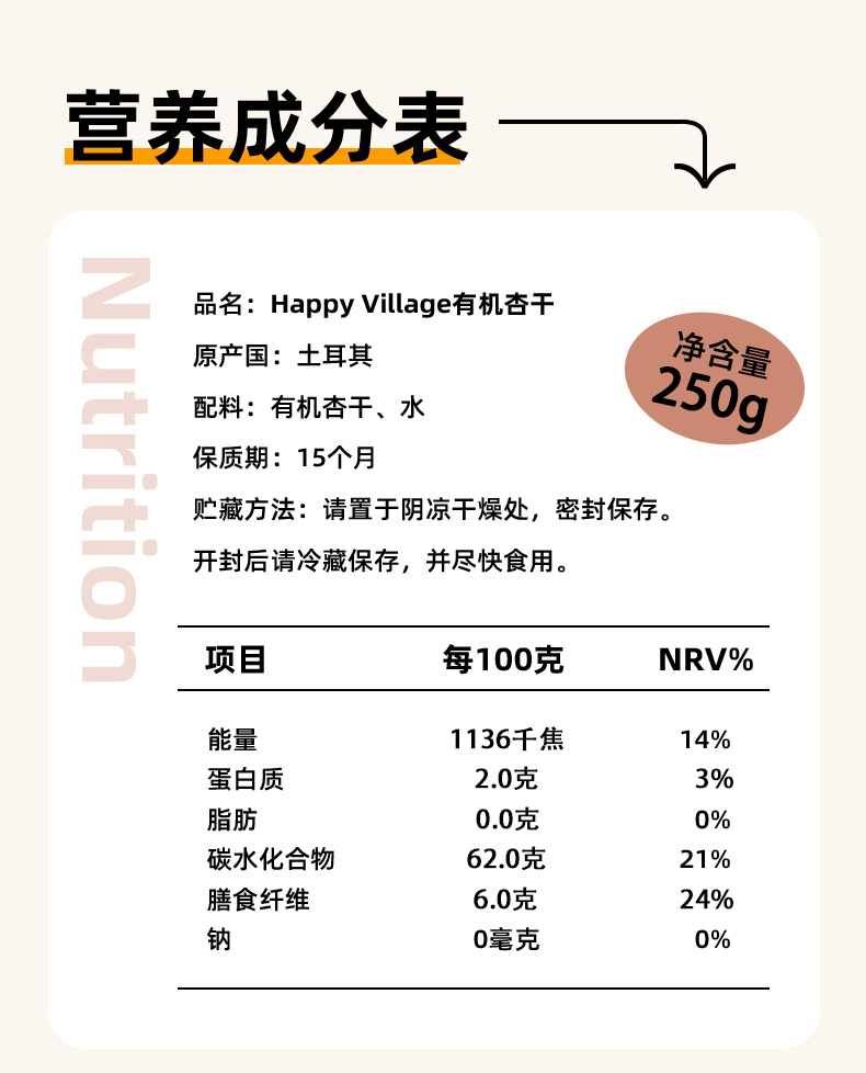 【品名】Happy Village 有机无花果干/有机杏干 土耳其原装进口 饱满大颗 肉质软糯 250g/袋 【规格】无花果干/杏干:250g/袋 【产地】土耳其 【保质期】15个月 【发货包装】独立包装 【发货地】深圳 【发货快递】中通 【不发货区域】港澳台 【发货时效】48-72小时,周末节假日顺延 |