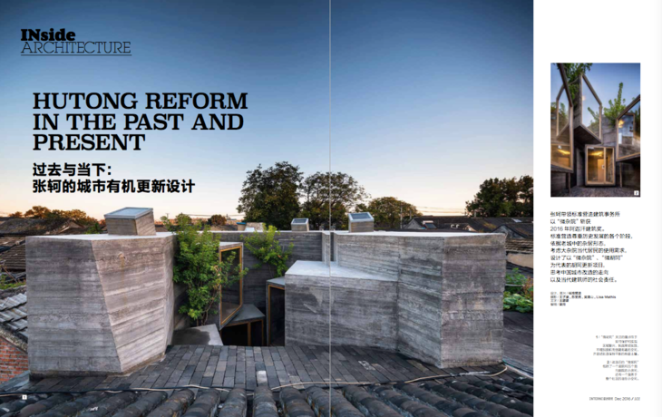 张轲带领标准营造建筑事务所以“微杂院”斩获2016年阿迦汗建筑奖。标准营造尊重历史发展的各个阶段,依据老城中的杂居形态,考虑大杂院当代居民的使用需求设计了胡同更新项目,思考中国城市改造的走向以及当代建筑师的社会责任。