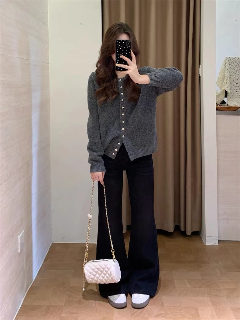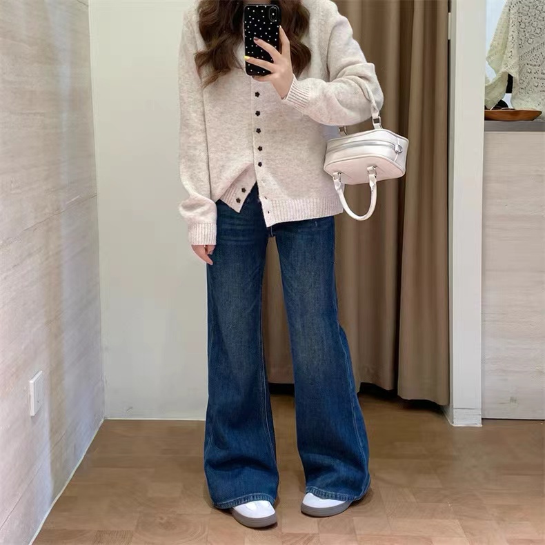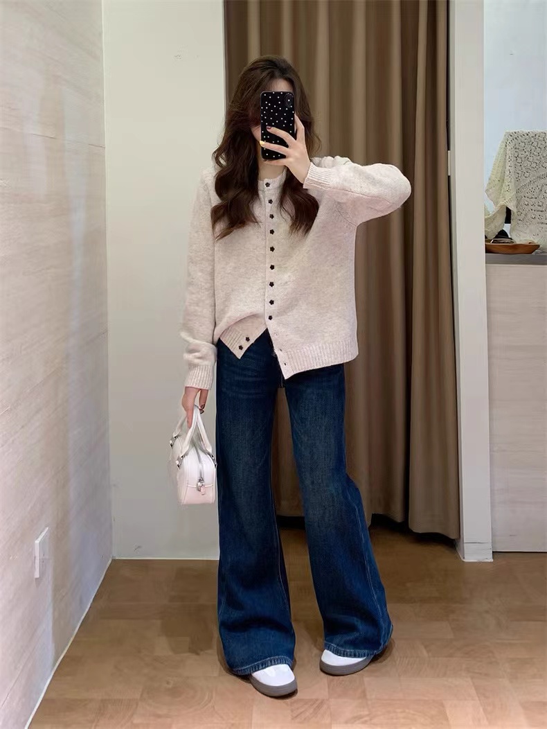 高定立裁的微宽松款 单是调整版型就试了五六个版本 终版对梨形身材尤其友好在微宽松的基础上融入微喇设计 不紧绷不包身却能勾勒出流畅曲线藏肉又显身材 裤腿磨白工艺 利落不突兀 提升整体精 致感 中腰线设计hen懂搭配配短上衣自带小辣感 搭长上衣又能突出裤子的利落线条不挑身材不挑风格 洗水工艺geng是用心软化了牛仔原本的硬挺感 摸起来柔软舒服上身穿丸荃没压力