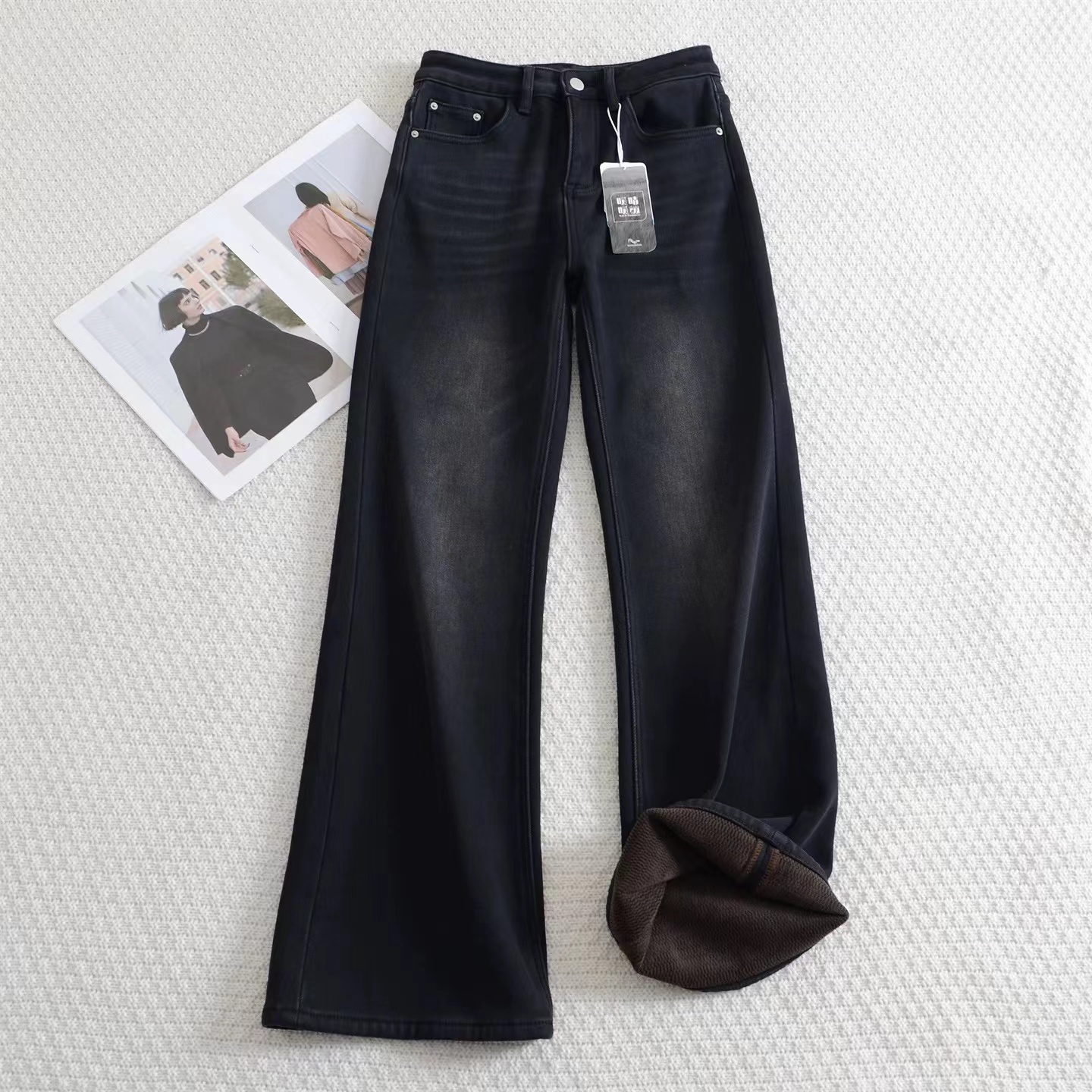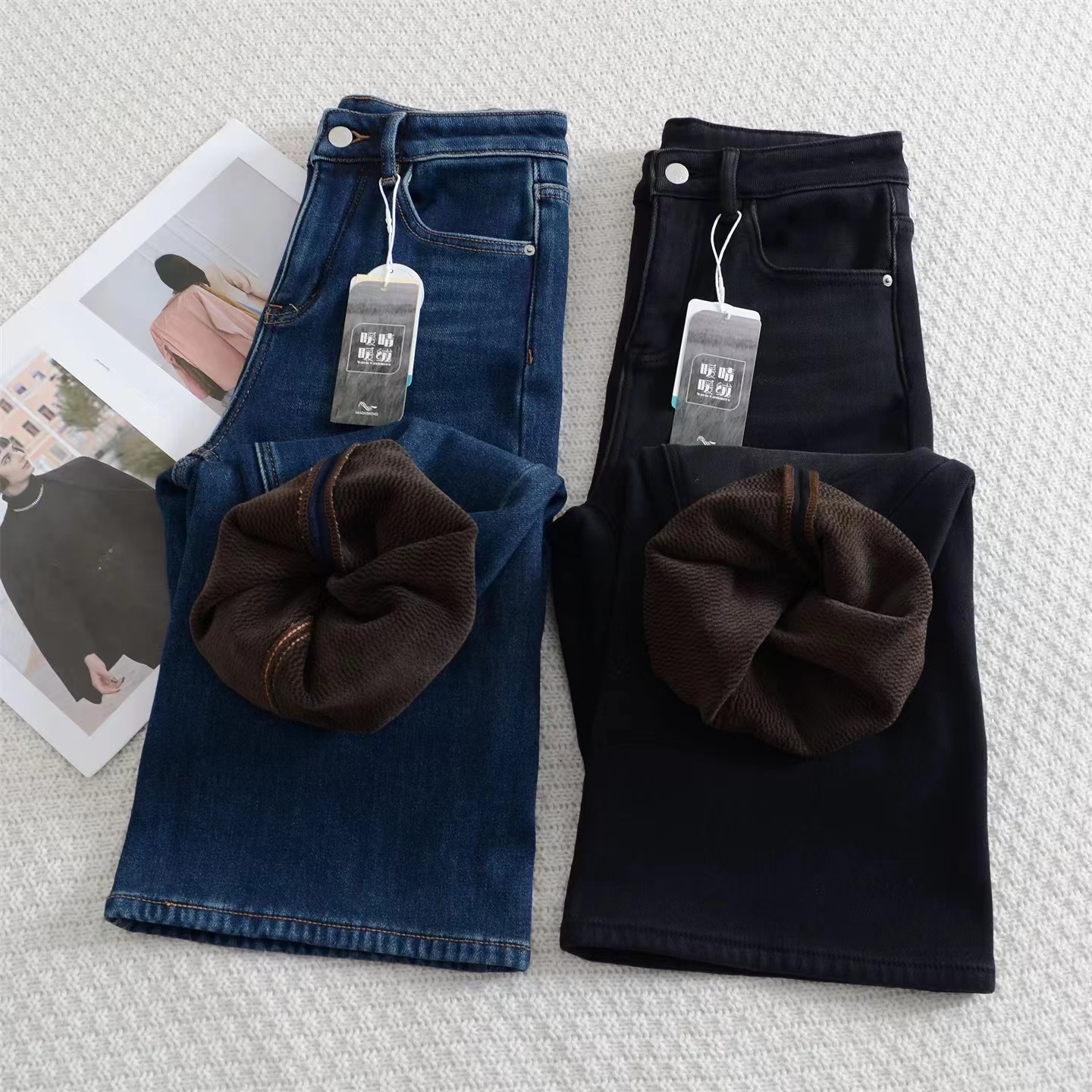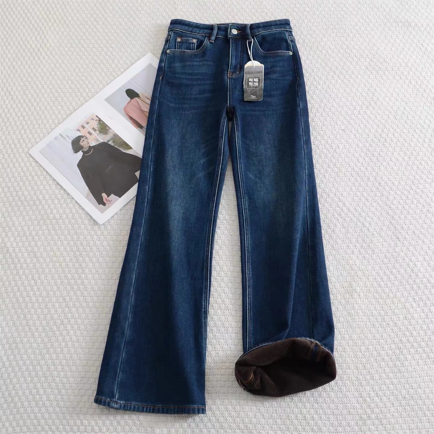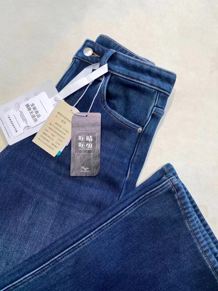垂坠感强 久坐不易起皱面料厚度丸荃可以一条过冬!上身完全不怕臃肿,wan荃看不出是加绒的裤子!牛仔裤的工艺细节展现精湛做工侧缝包边,内缝双针走线纽扣,拉链都选用YKK品pai正品辅料经久耐用,而且拉合顺畅~面料/Fabric