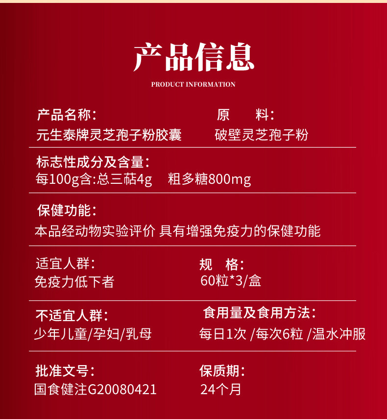 元生泰 破壁灵芝孢子粉胶囊 0.25g/粒*180粒/盒 增强免疫力中老年人营养滋补保健品