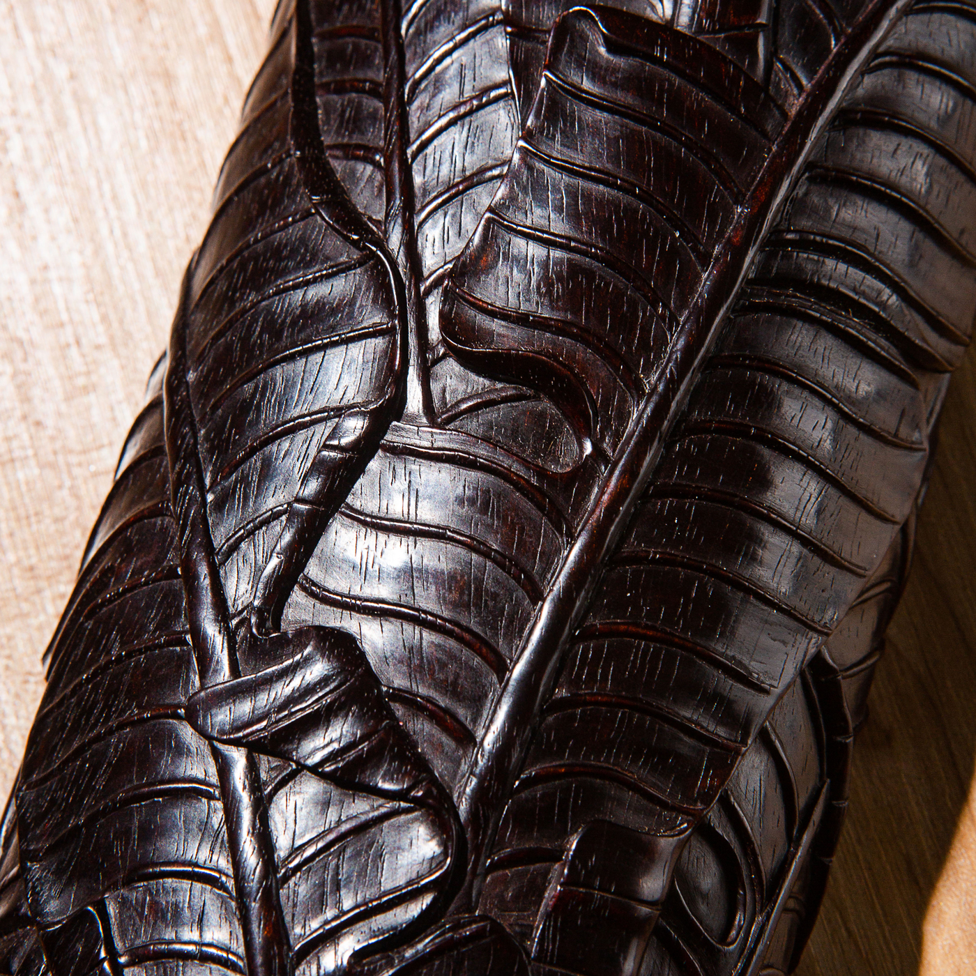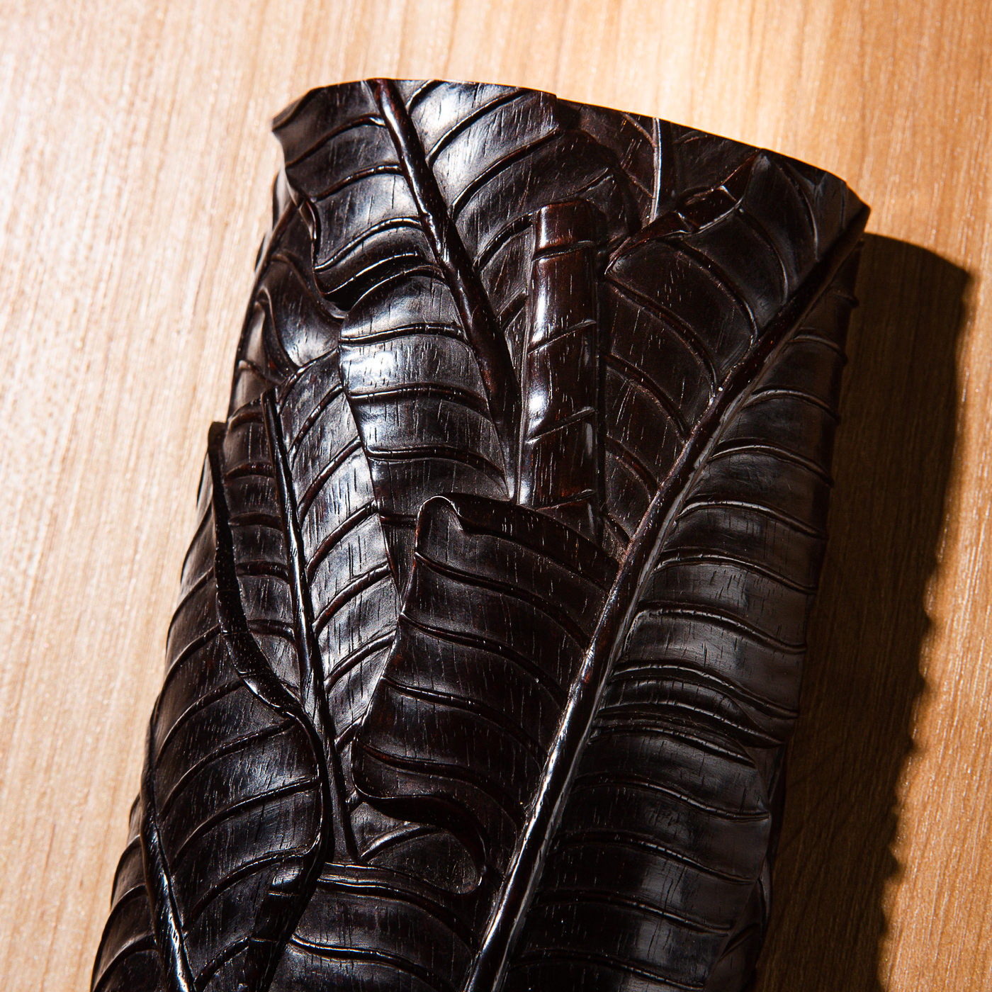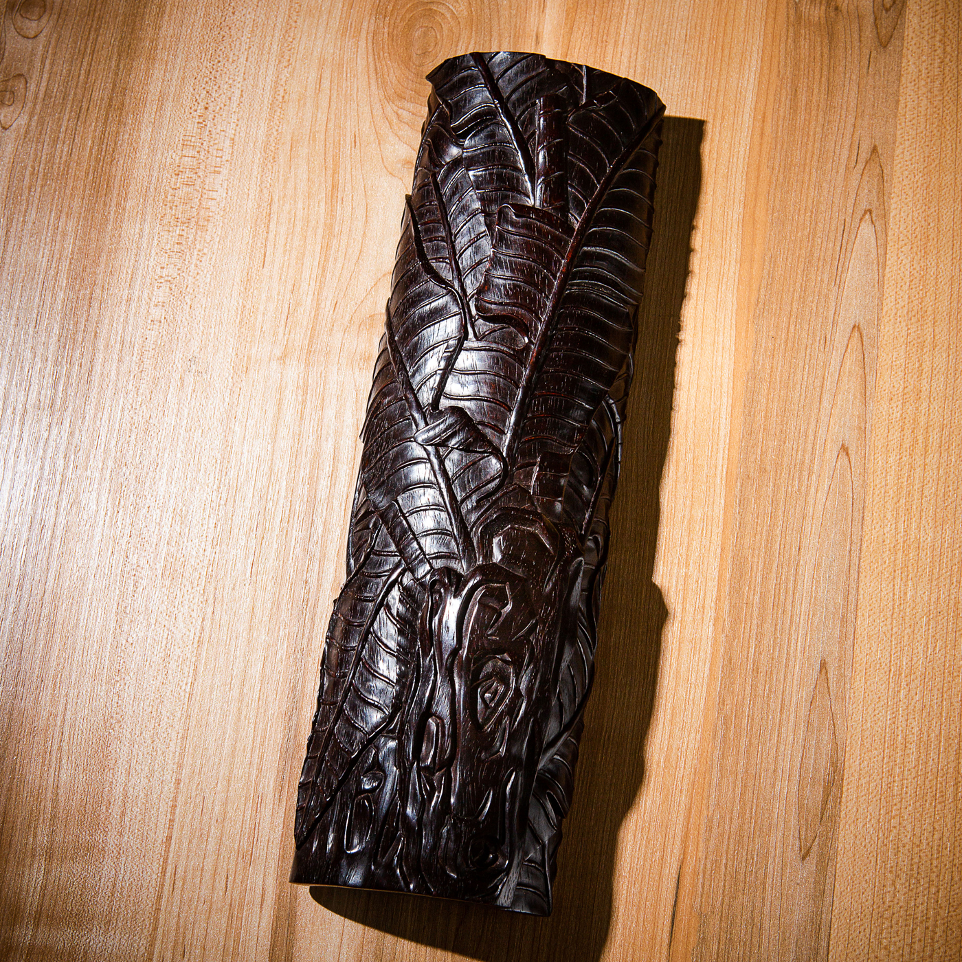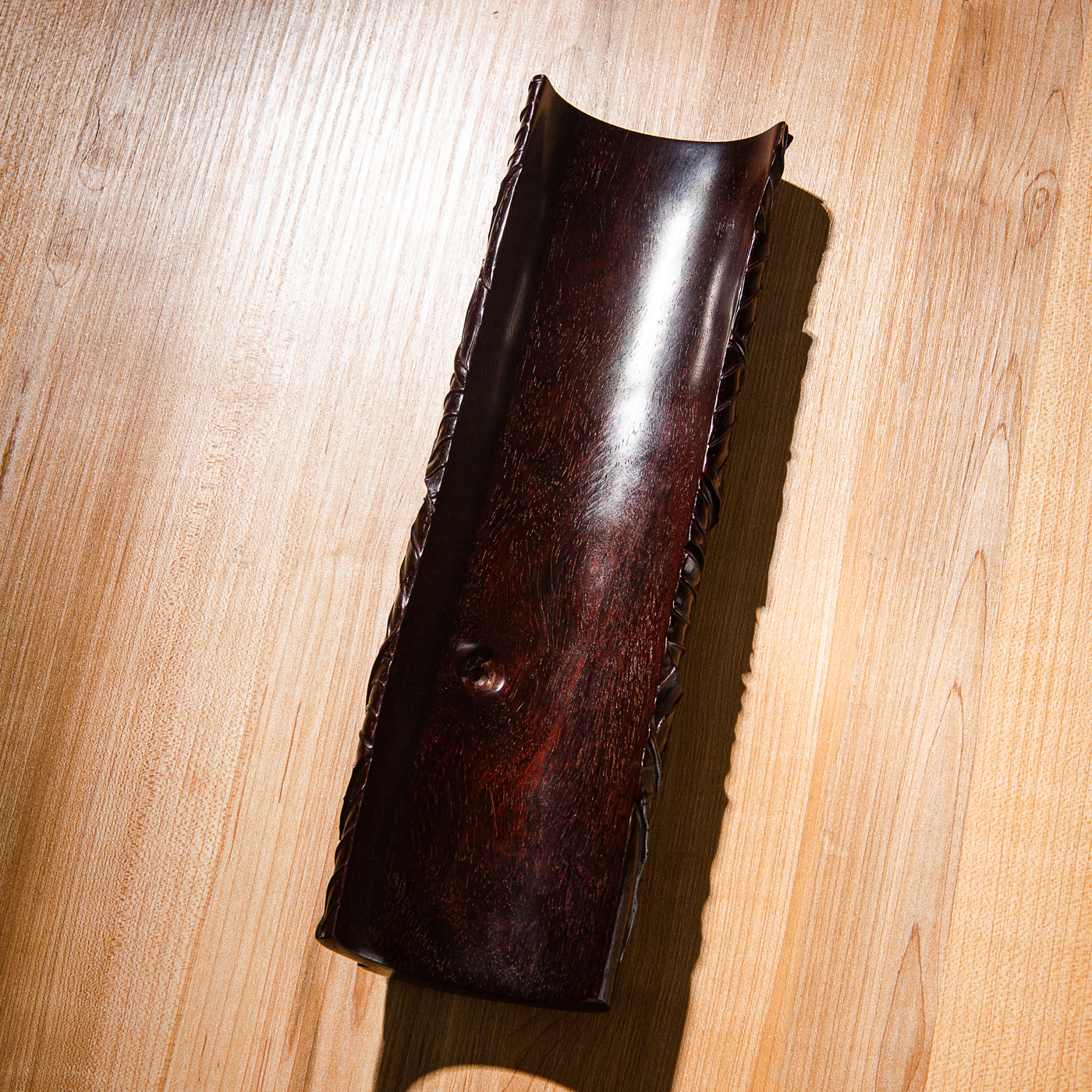 紫檀雕“蕉叶怪石”大臂搁,雕工精细繁复,构图精妙,老料颜色沉稳古穆,包浆莹润,器型典雅,为不可多得之佳品。