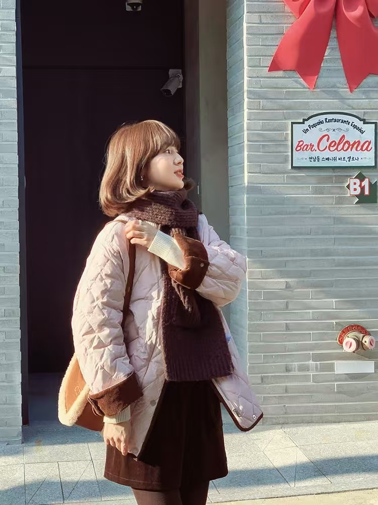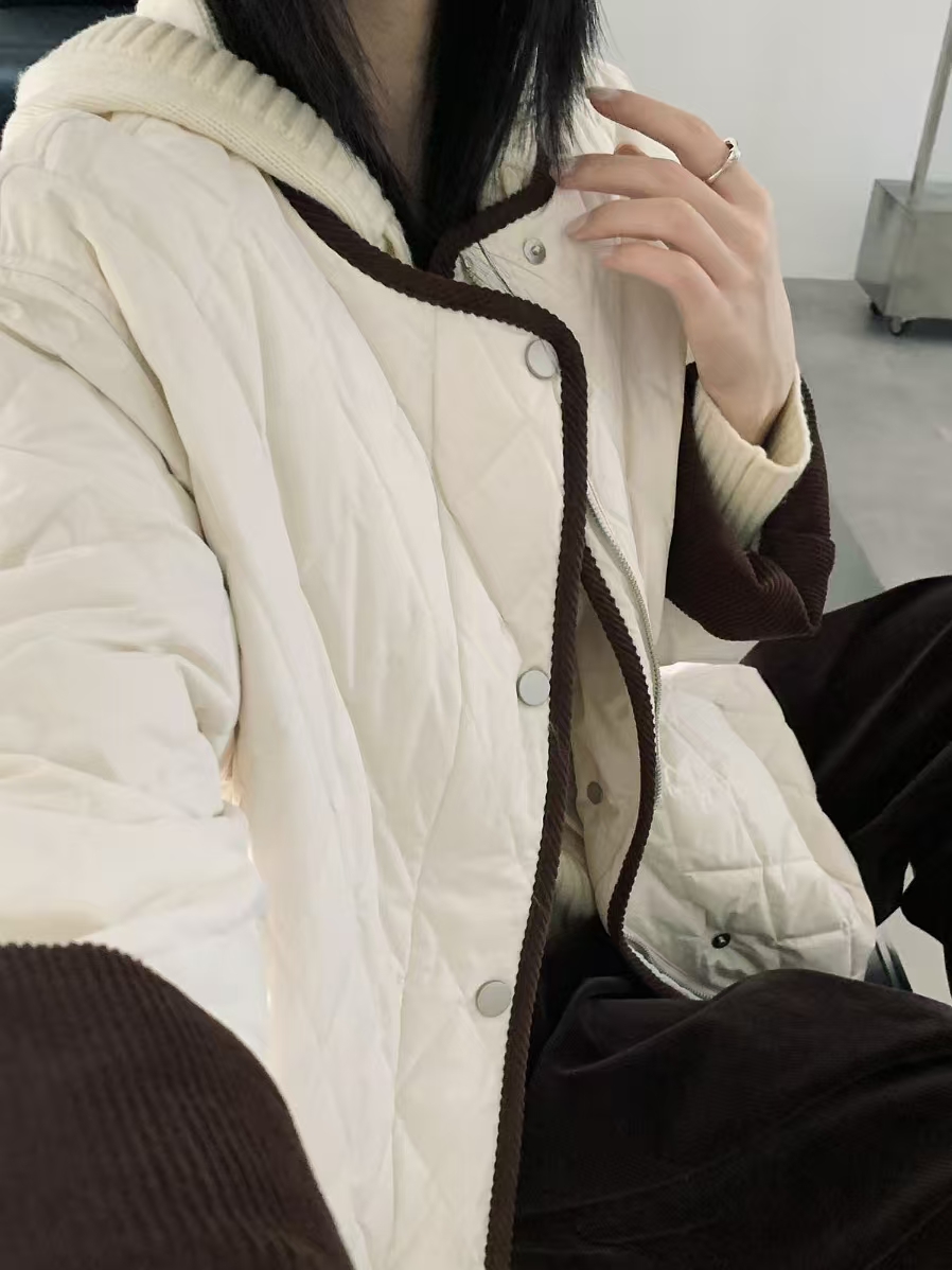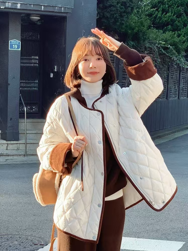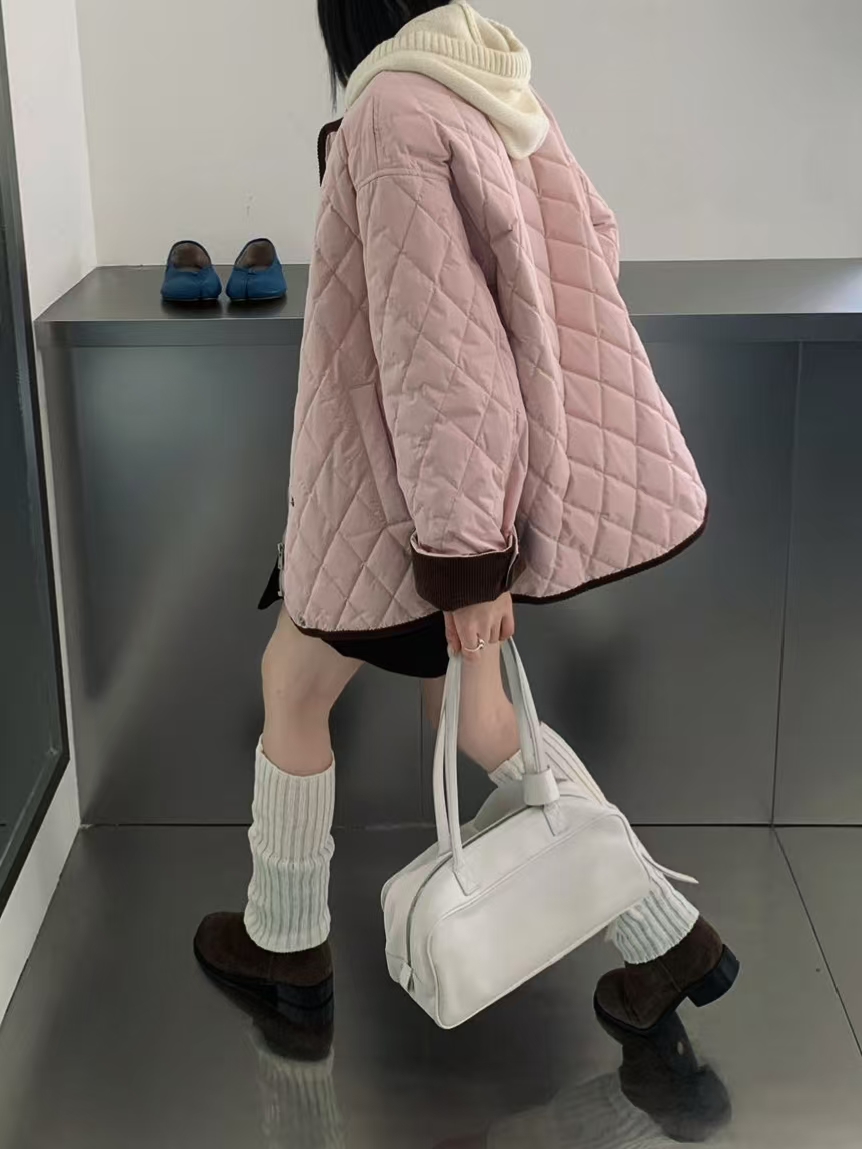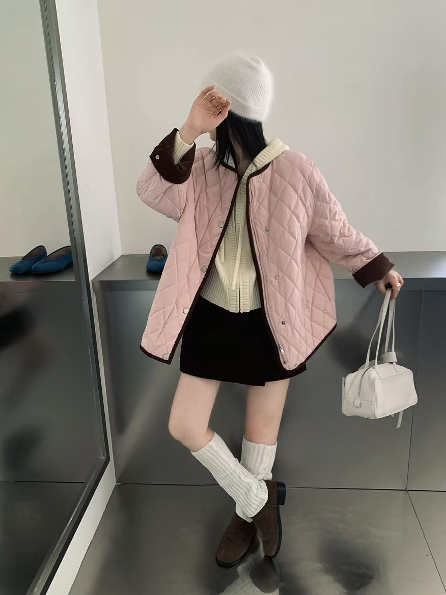 [特价]韩系灯芯绒撞色圆领中长款 90 白鸭绒羽绒服女 粉色 / 米白色 2510022
