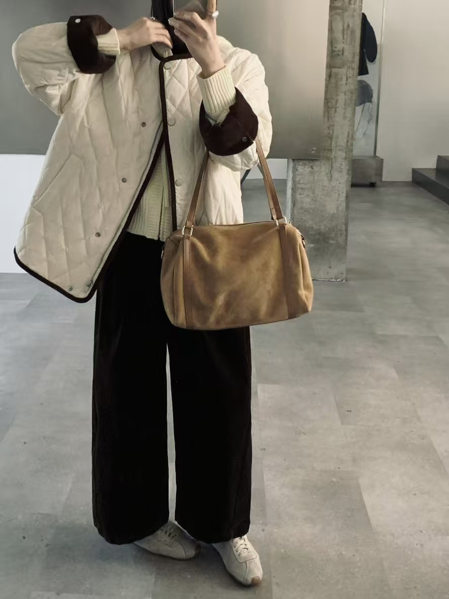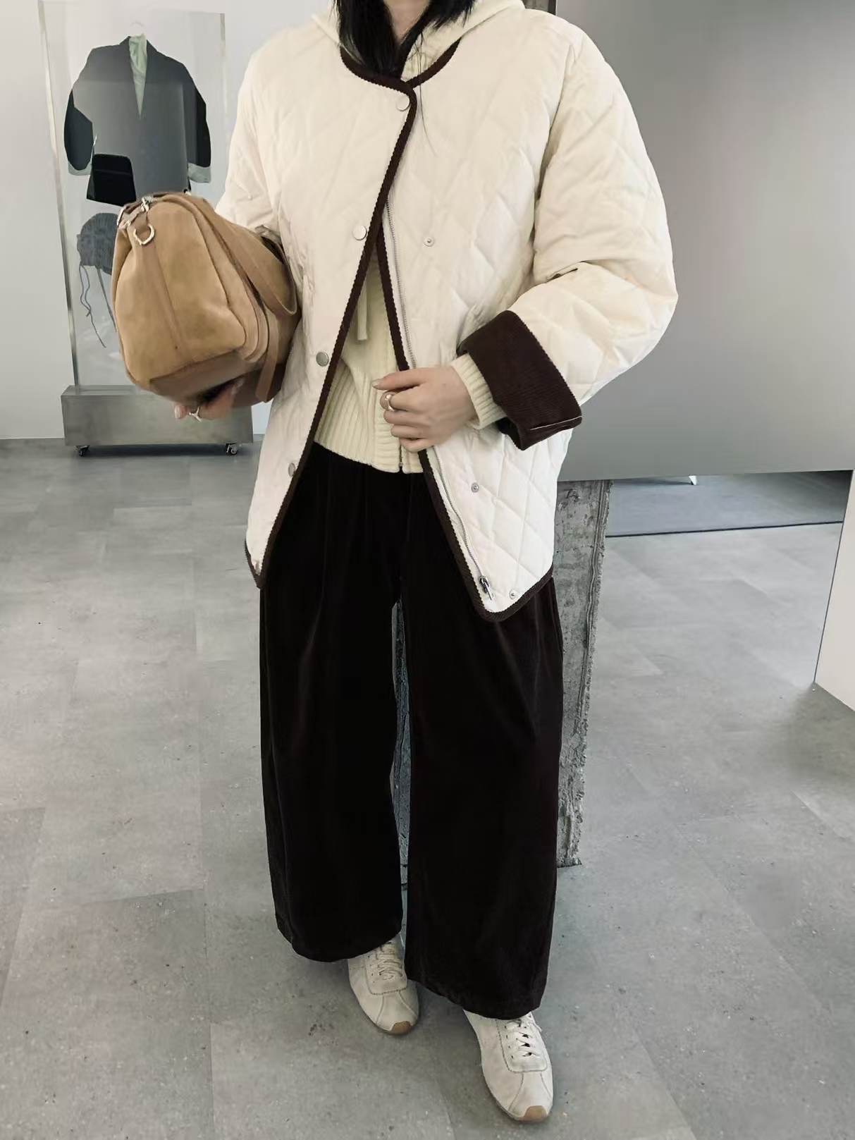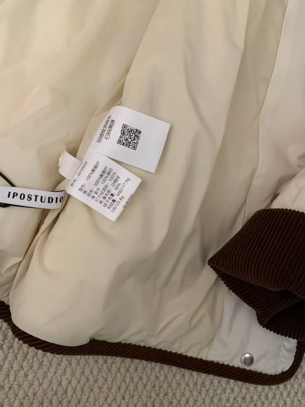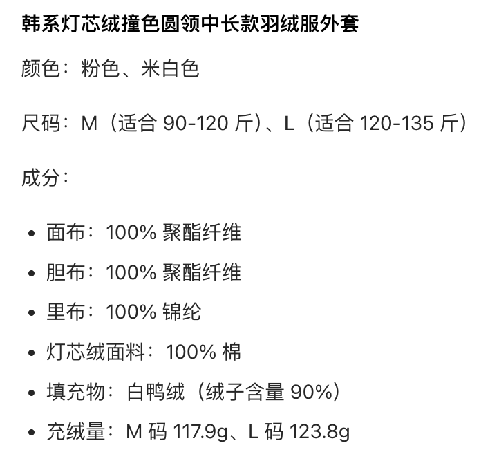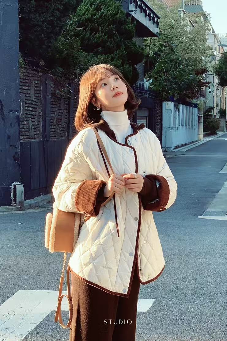 [特价]韩系灯芯绒撞色圆领中长款 90 白鸭绒羽绒服女 粉色 / 米白色 2510022