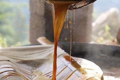 即将凝固的红糖舀入模具
