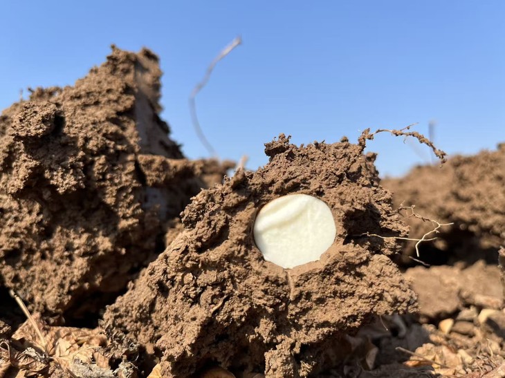 灌水后深层土壤有的区域瓷实、有的区域松软;土壤密度和硬度有不同,因此山药在自然生长过程中,会出现密度差异现象。
