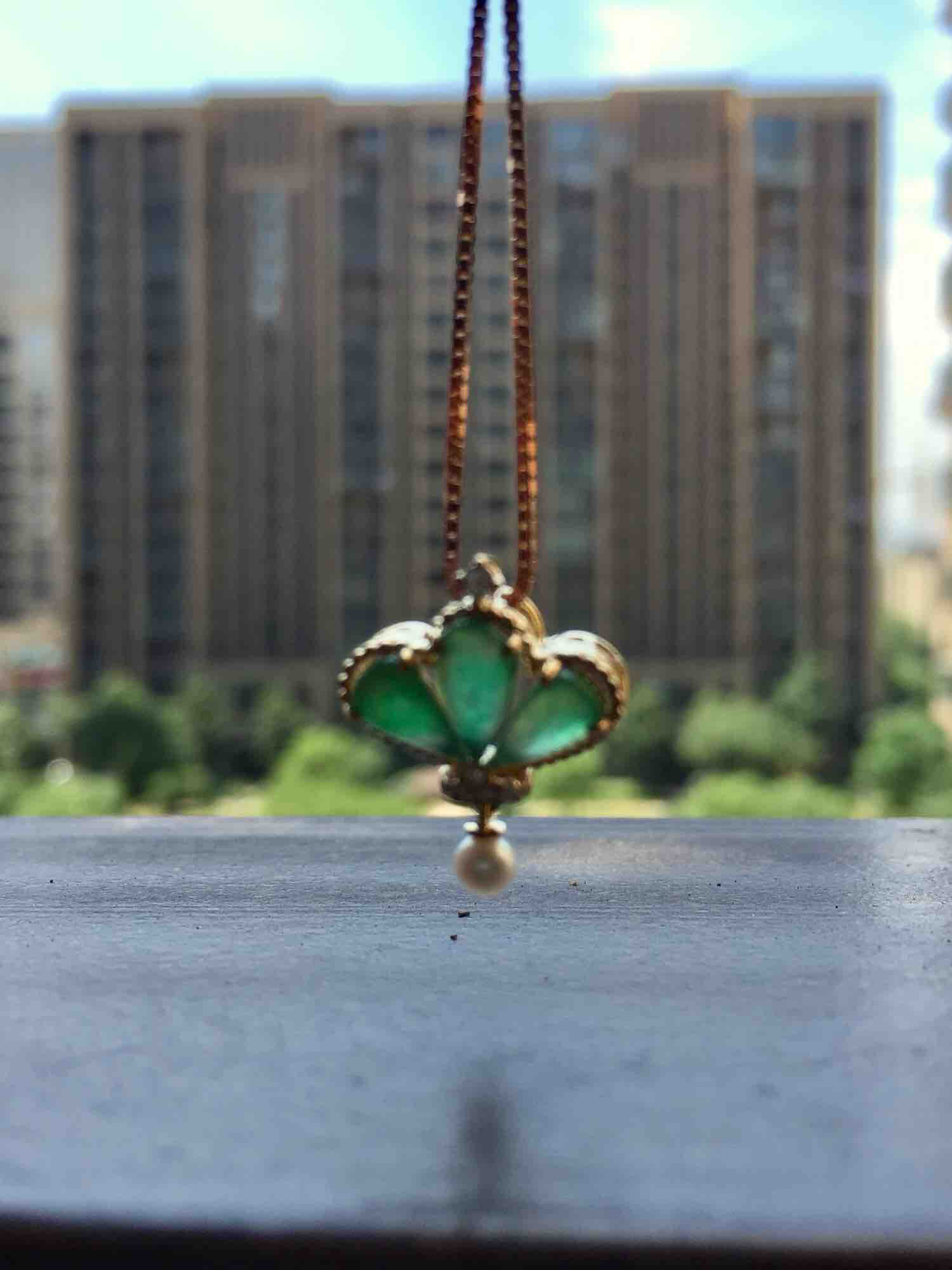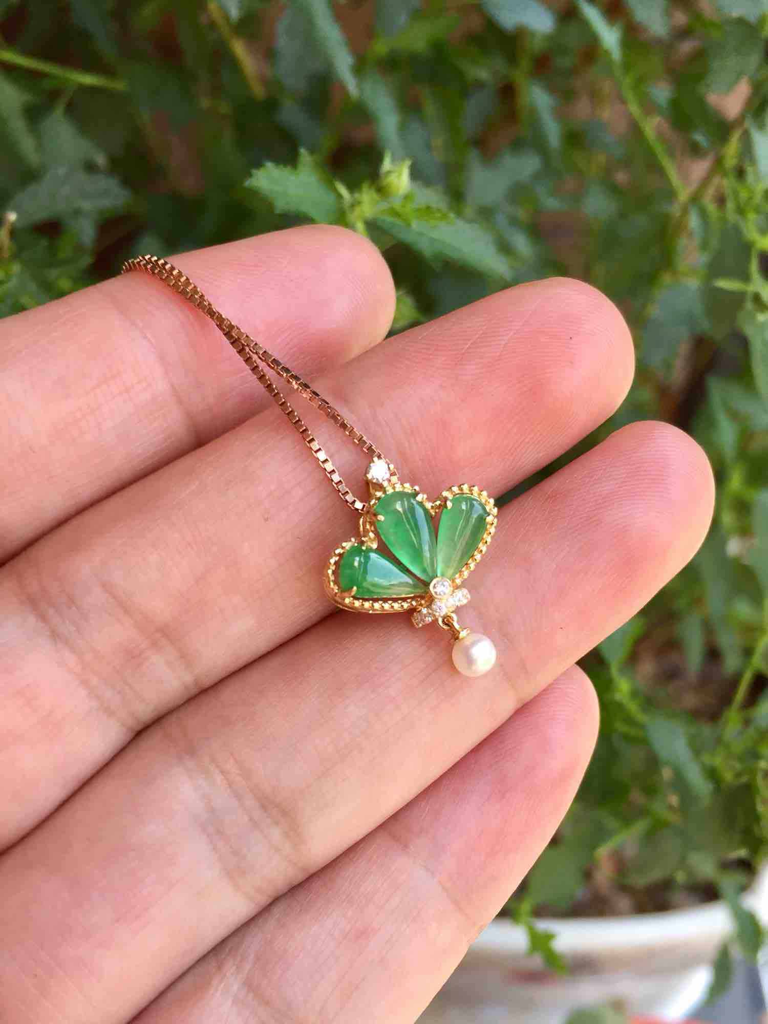 新古典气质,设计师款,是皇冠还是扇子,特别的漂亮宝贝,水滴长7.6mm,镶嵌后18.2×13.8×6.2mm。三粒高冰种阳绿翡翠水滴镶嵌而成,种水晶莹剔透,荧光四射,阳绿艳丽,搭配18k黄金镶嵌,钻石珍珠点缀,气质优雅,夏日颈间迷人风景线,精品推荐