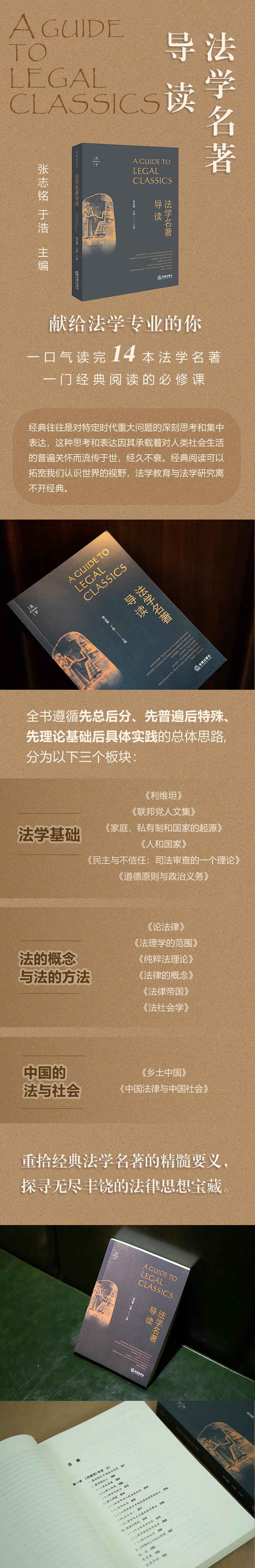全书遵循先总后分、先普遍后特殊、先理论基础后具体实践的总体思路,共分为“法学基础”“法的概念与法的方法”“中国的法与社会”三个板块,分别介绍了《利维坦》《联邦党人文集》《家庭、私有制和国家的起源》《人和国家》《民主与不信任:司法审查的一个理论》《道德原则与政治义务》《论法律》《法理学的范围》《纯粹法理论》《法律的概念》《法律帝国》《法社会学》《乡土中国》《中国法律与中国社会》共14本法学经典著作。