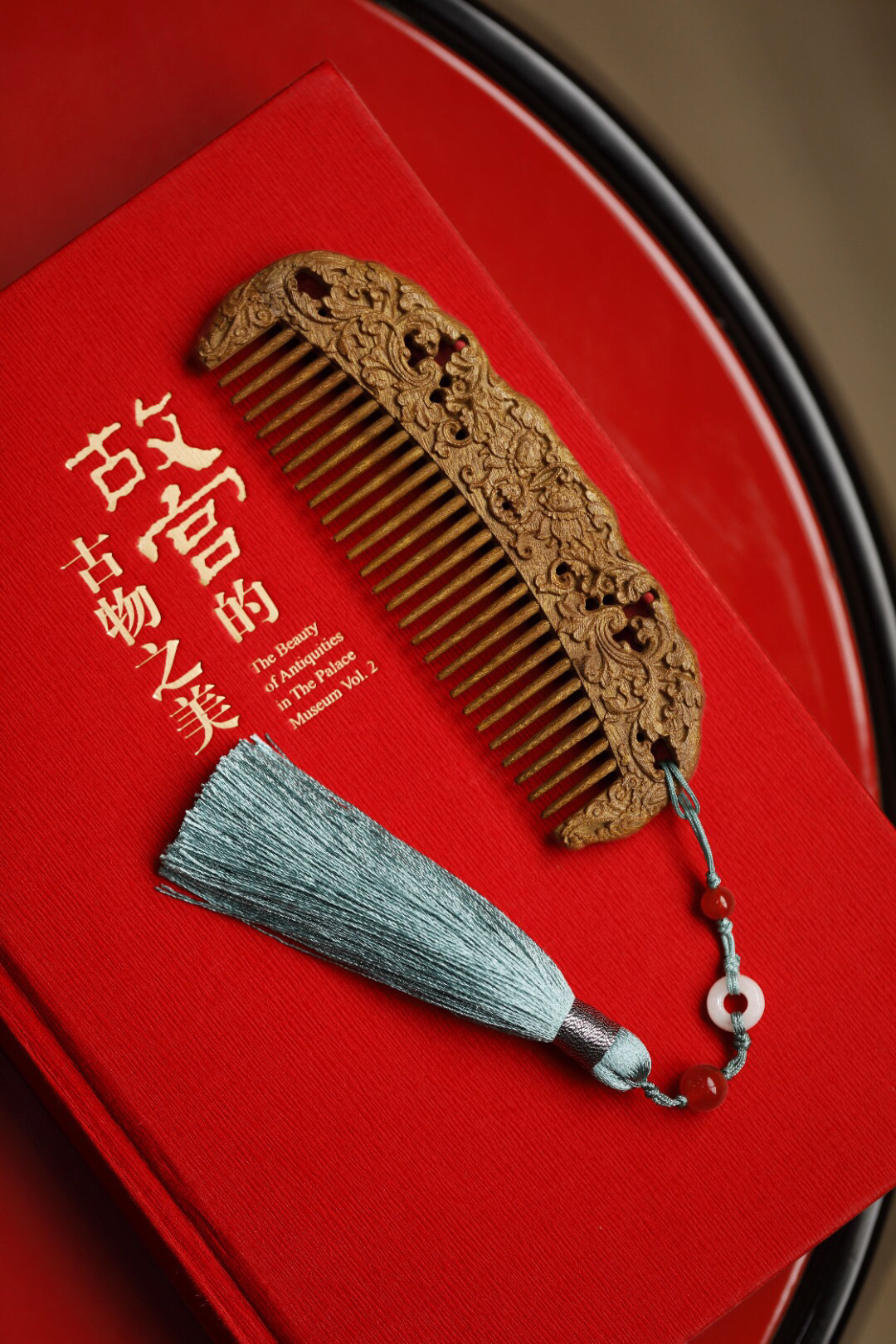 金丝楠【西番莲纹】木梳 金丝楠为质,双面镂雕西番莲纹, 千目打磨,U型梳齿滑润细腻, 配上吊坠,更是优雅动人, 执于手中,木香悠然不绝, 梳齿圆滑,一梳百顺。