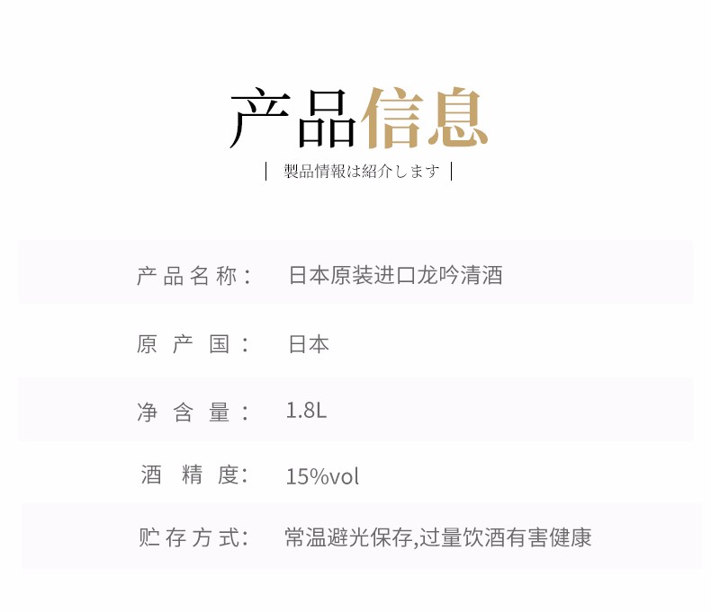 原装进口龙吟清酒1.8L奥飞騨日式上选清酒