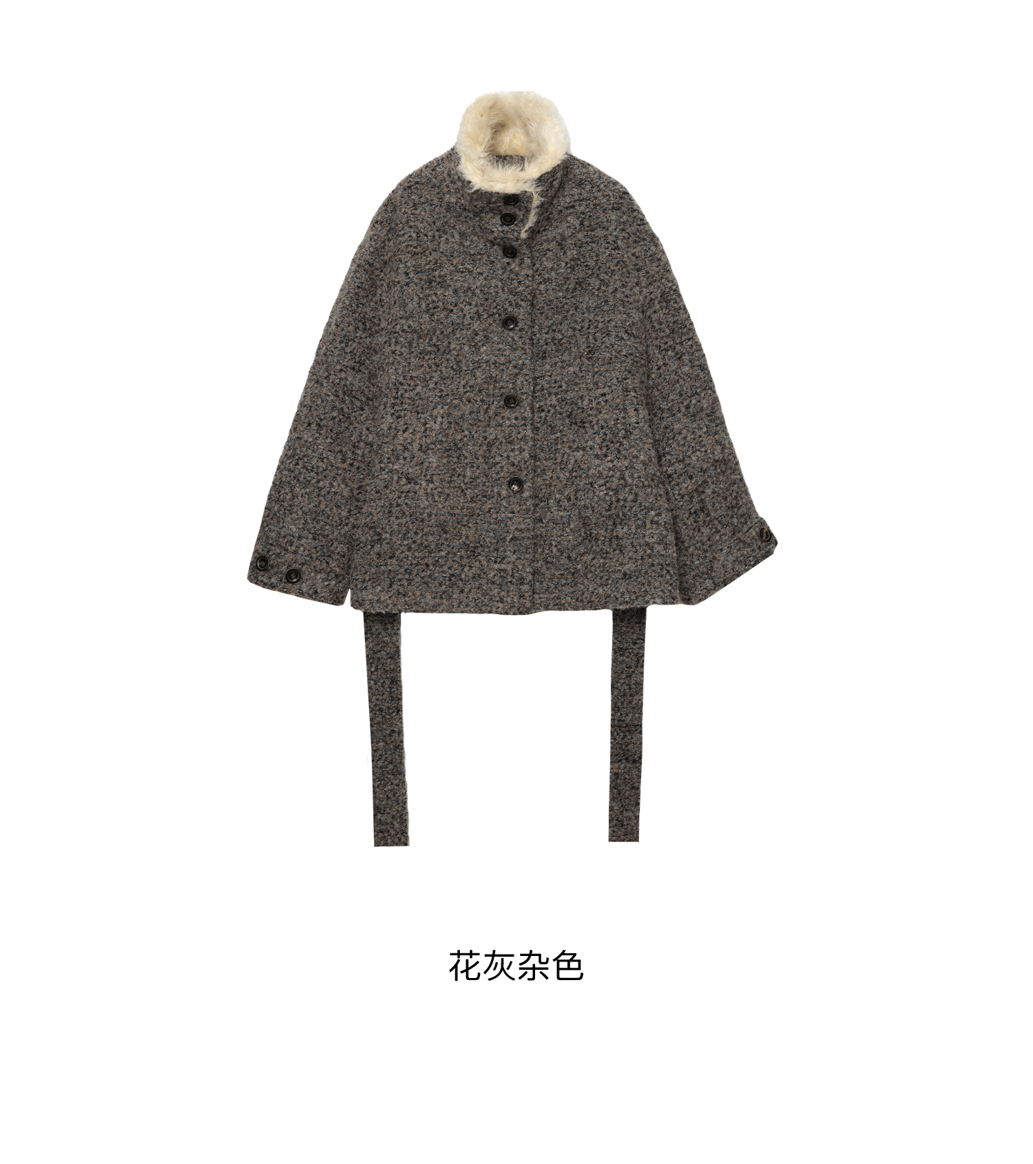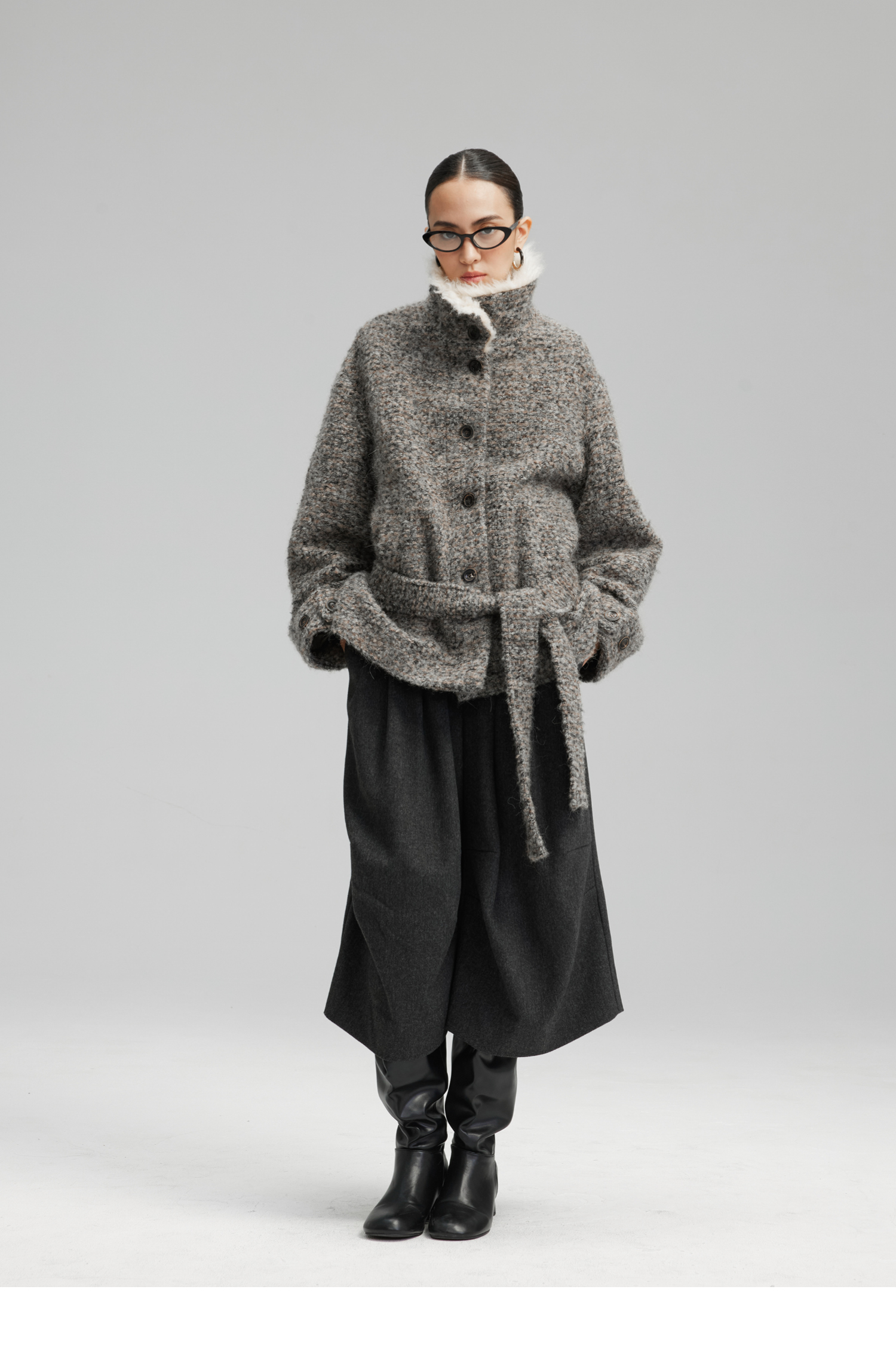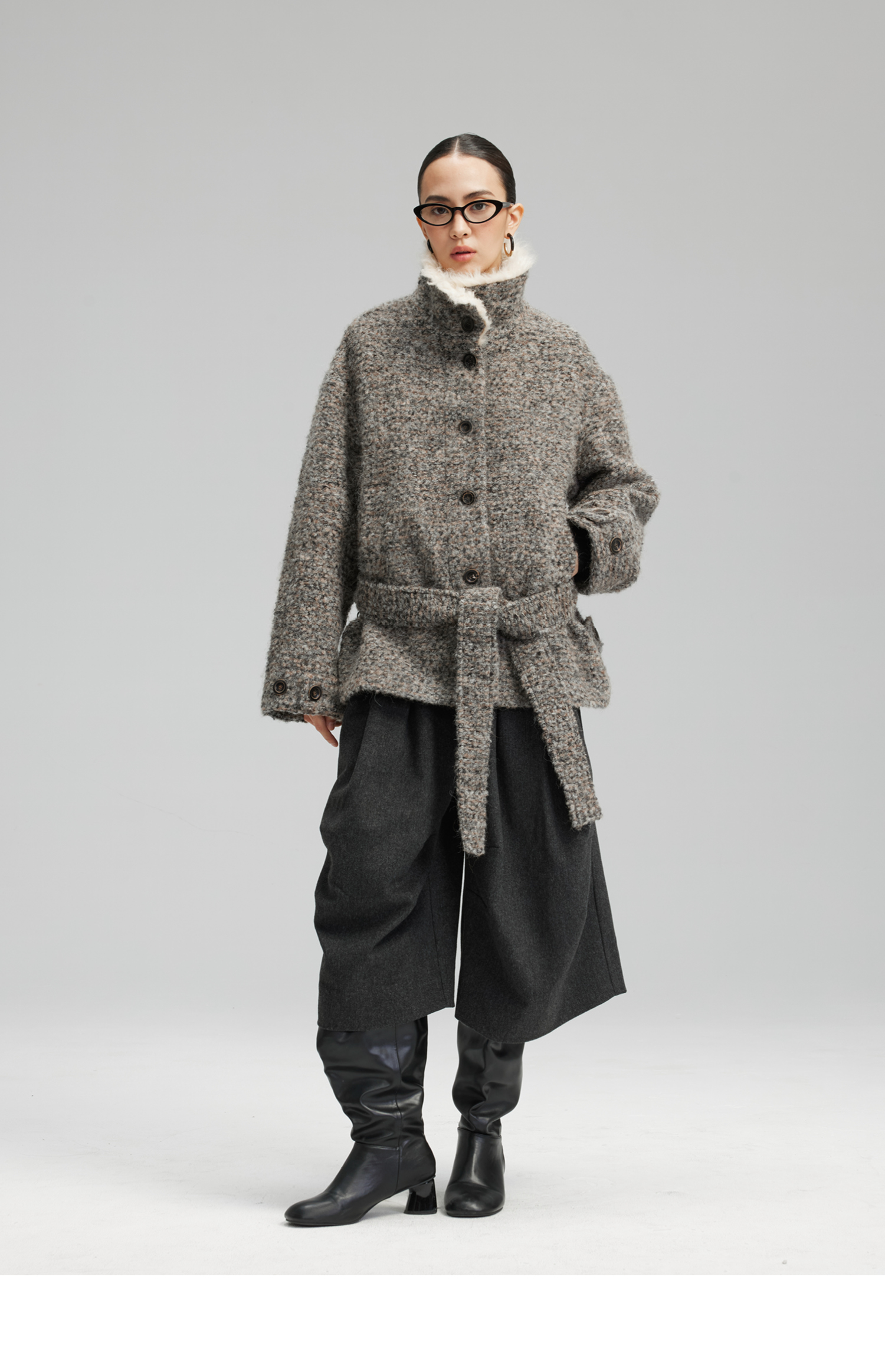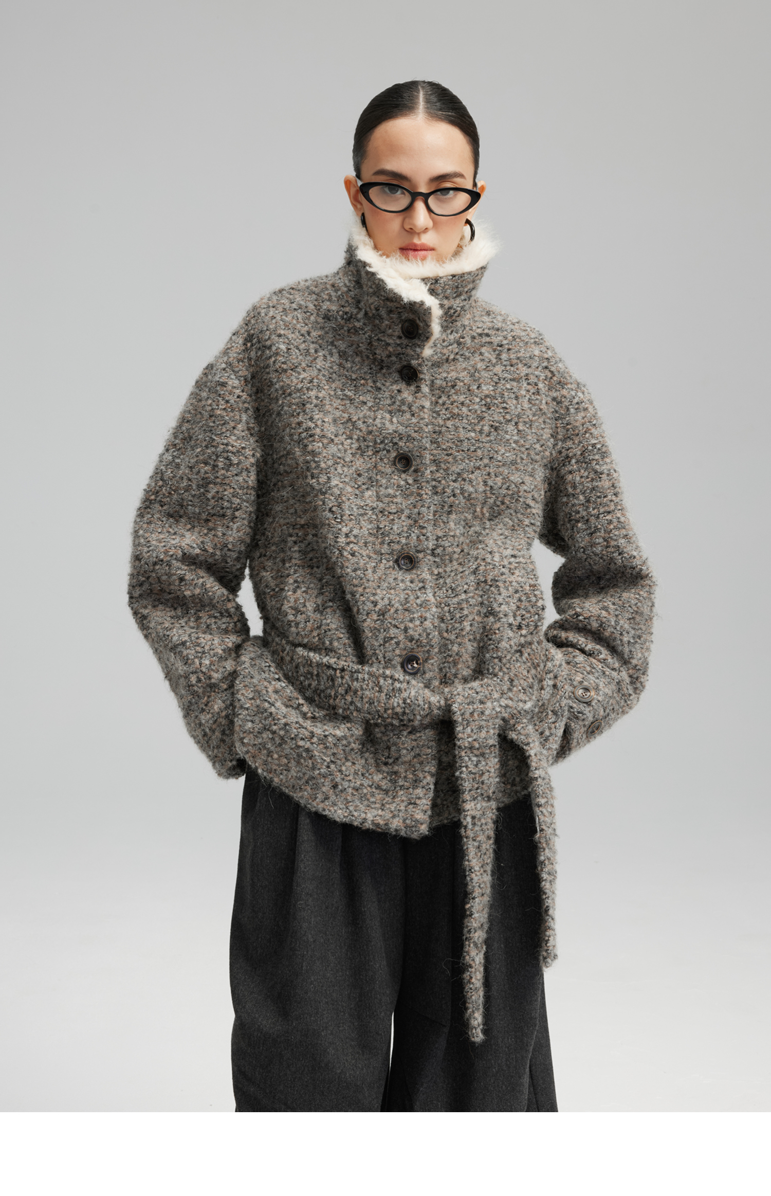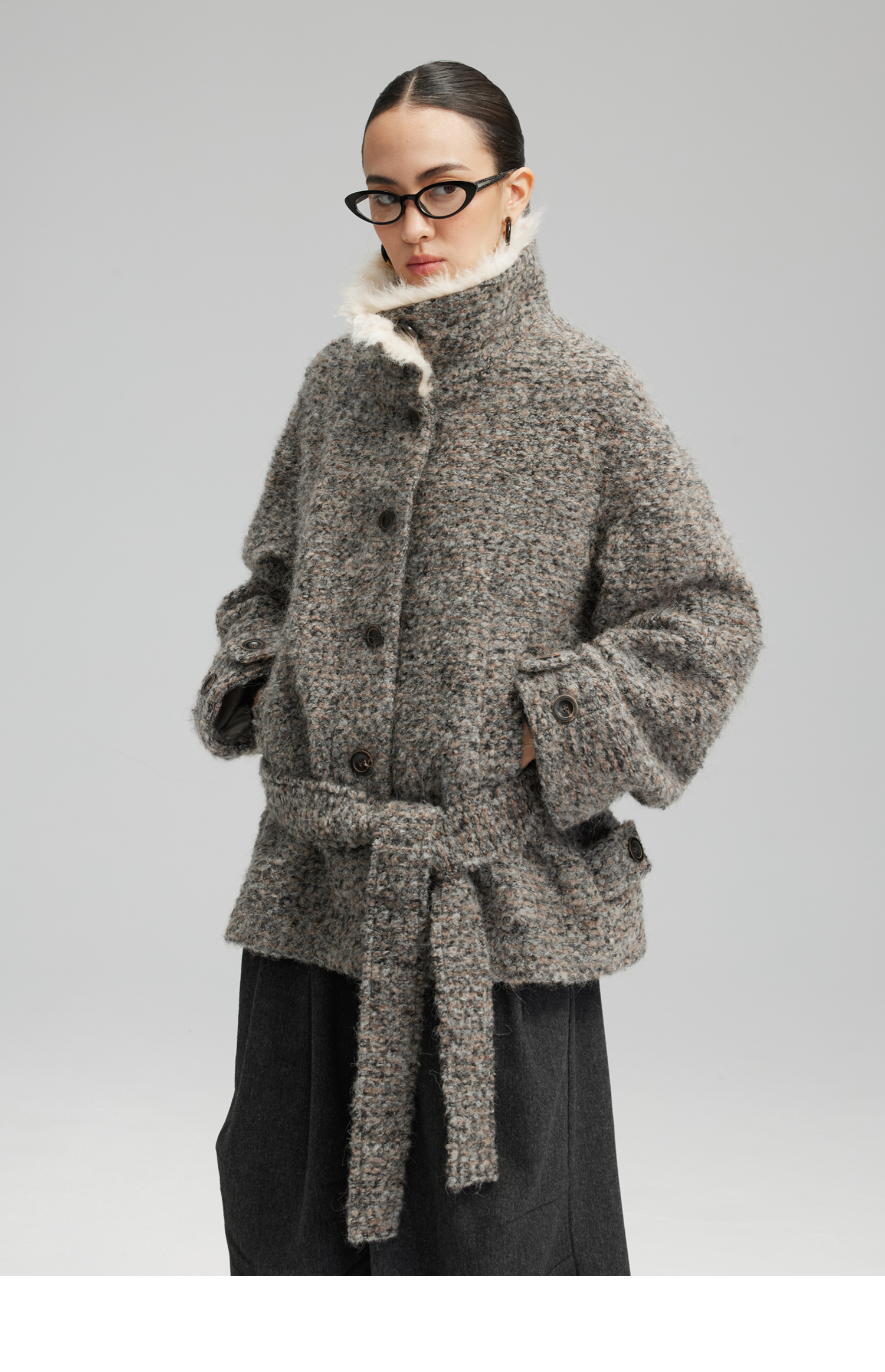 素舶 羊驼毛绵羊毛混纺杂色圈圈毛立领短款系带毛呢外套