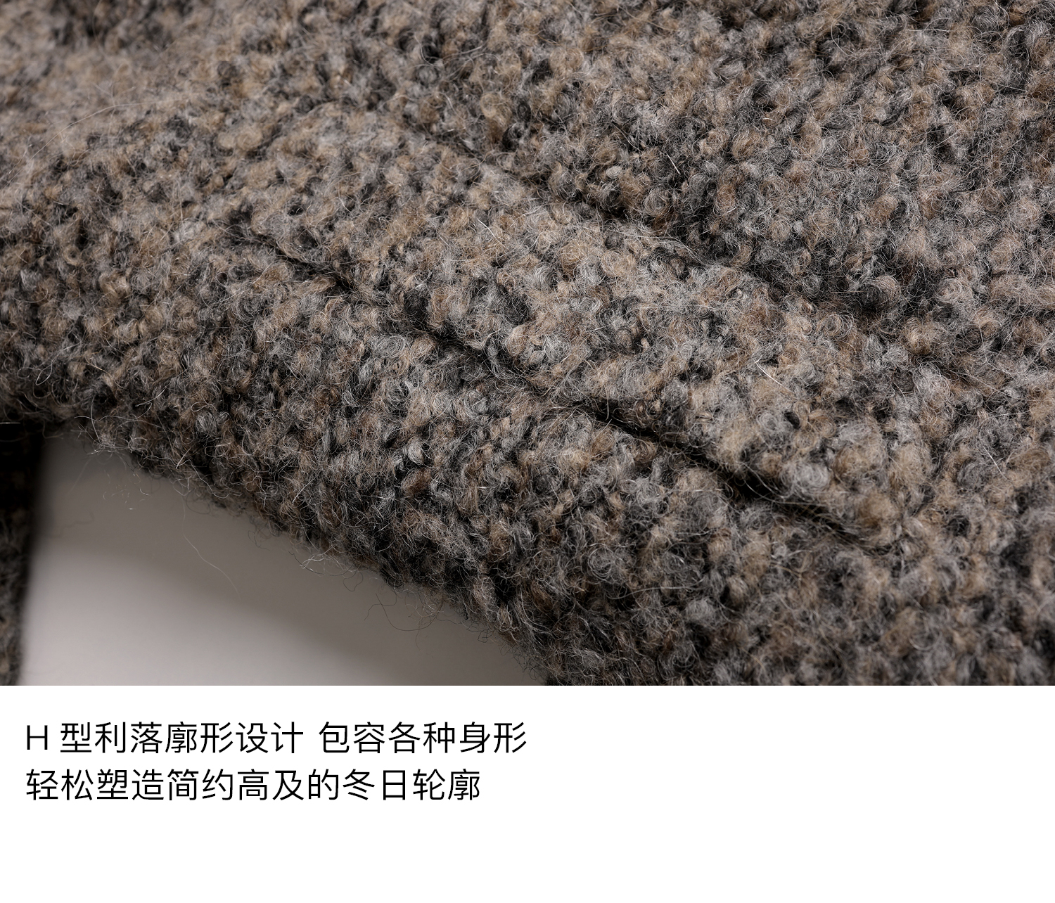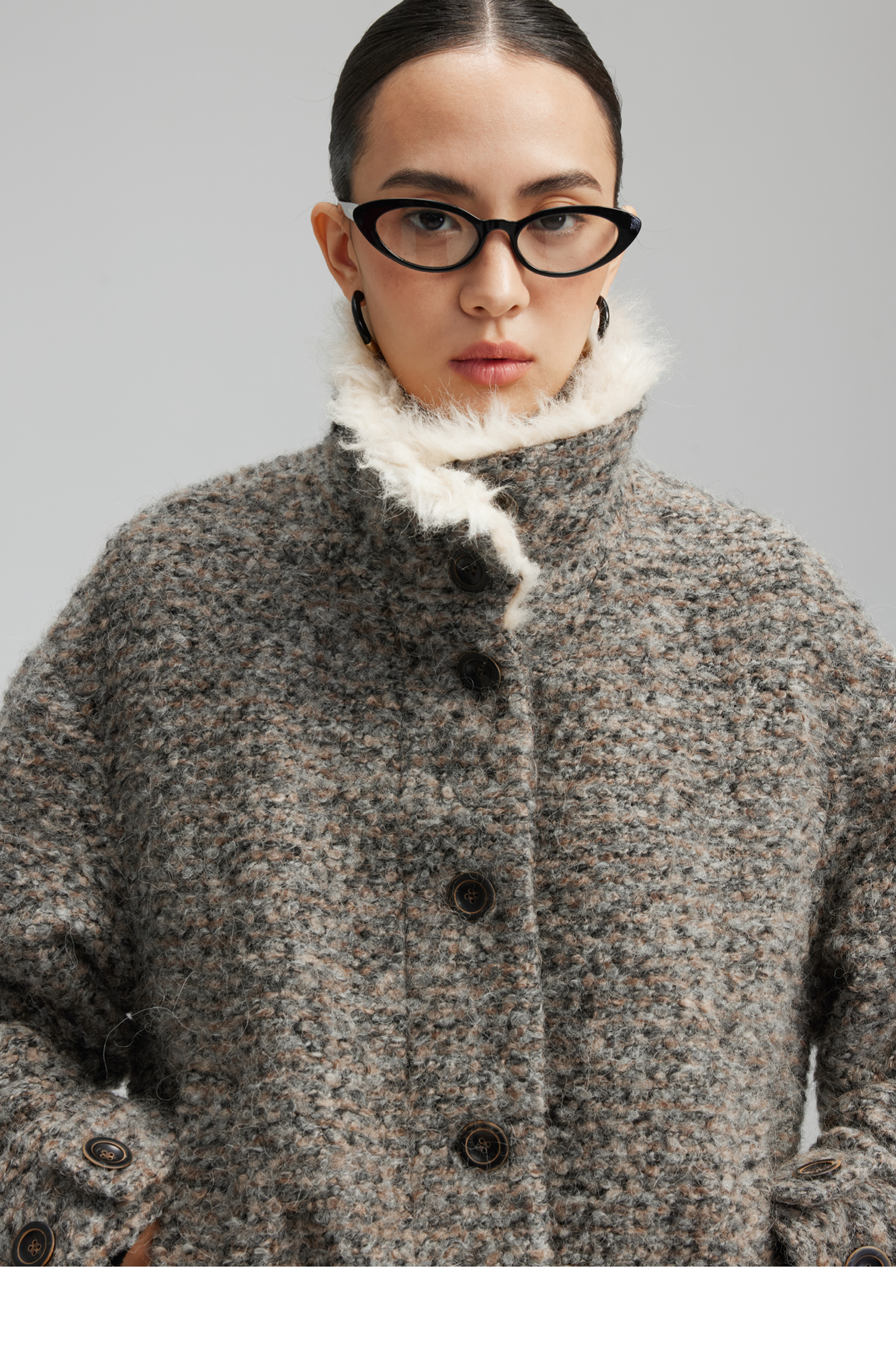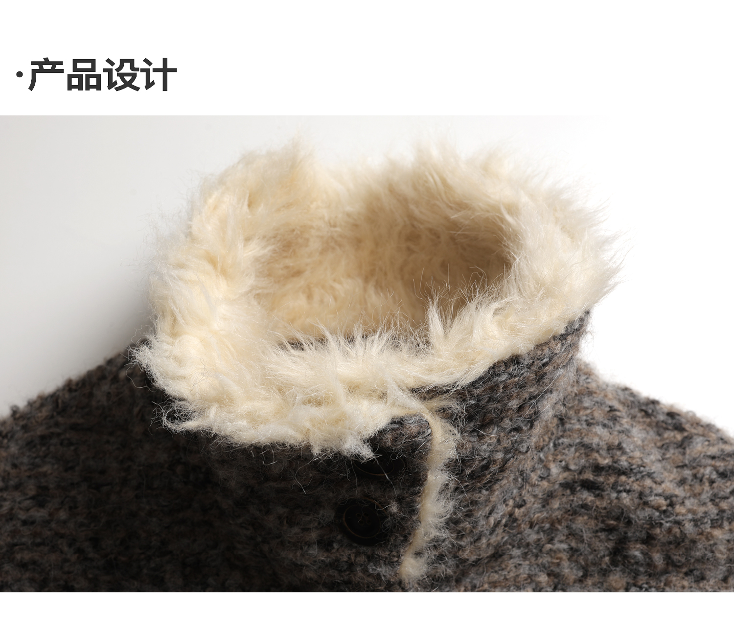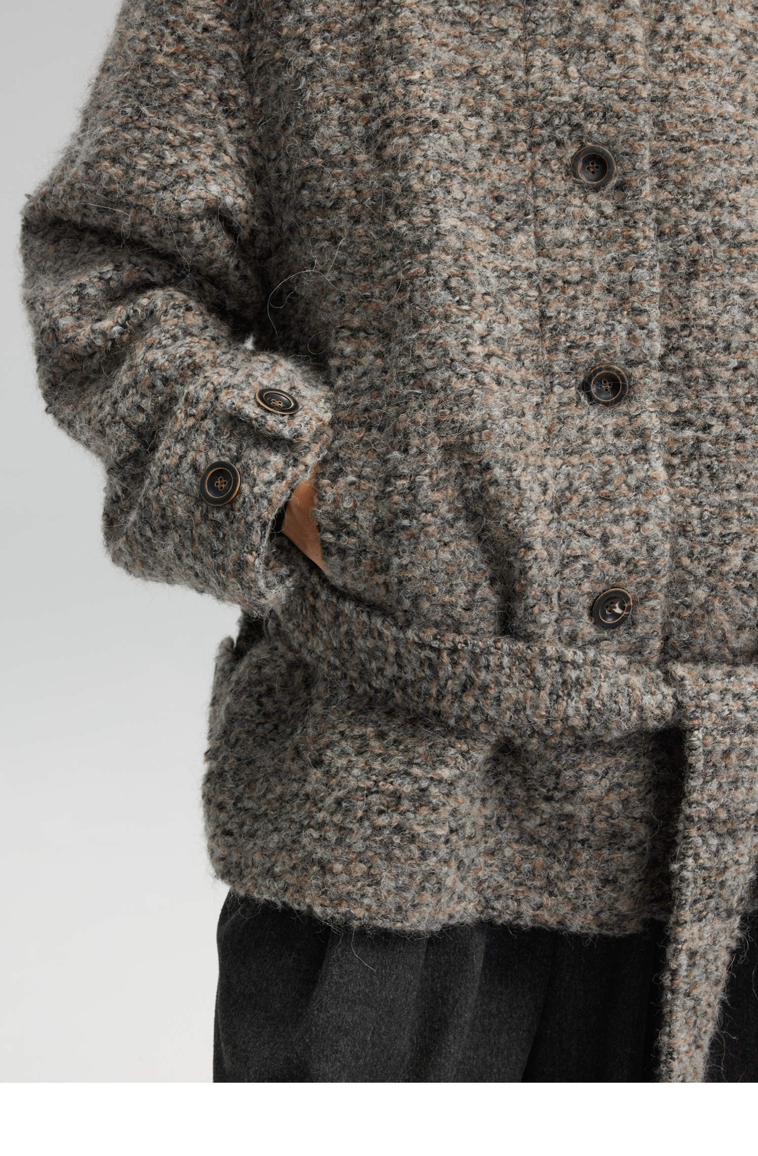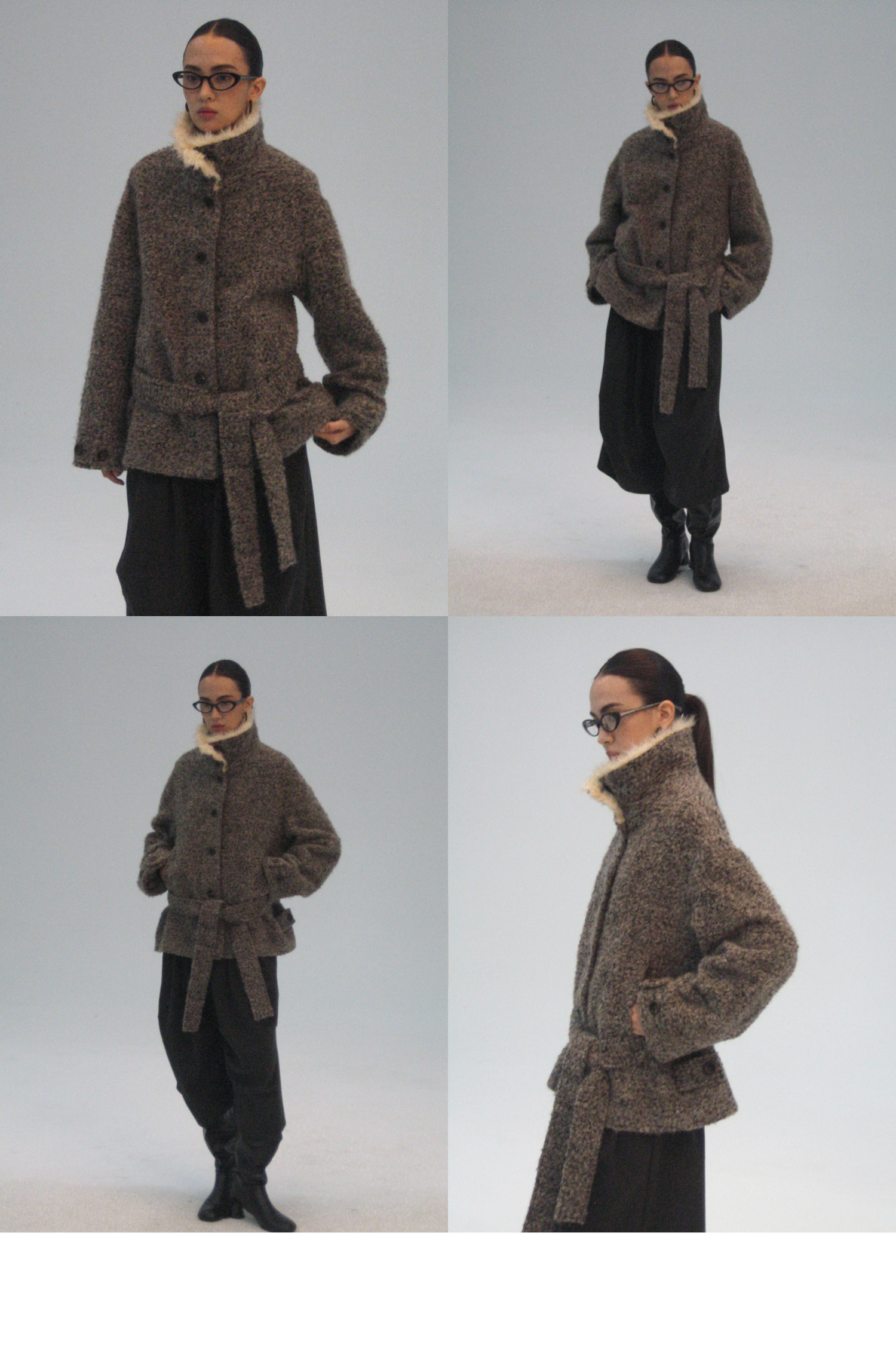 素舶 羊驼毛绵羊毛混纺杂色圈圈毛立领短款系带毛呢外套