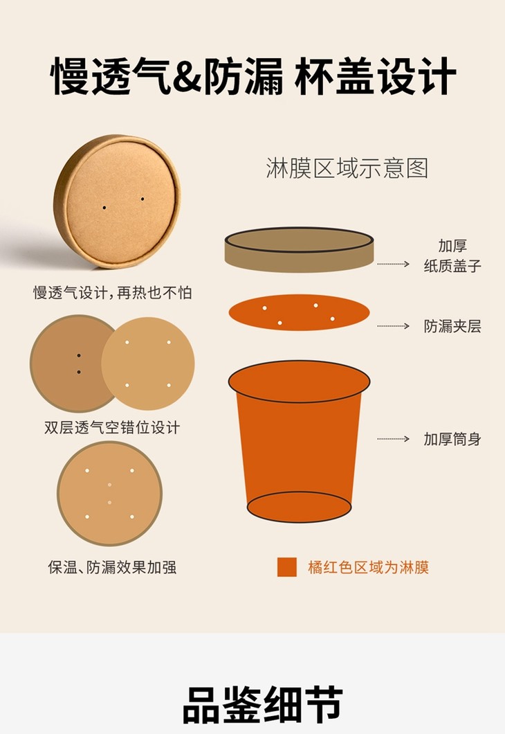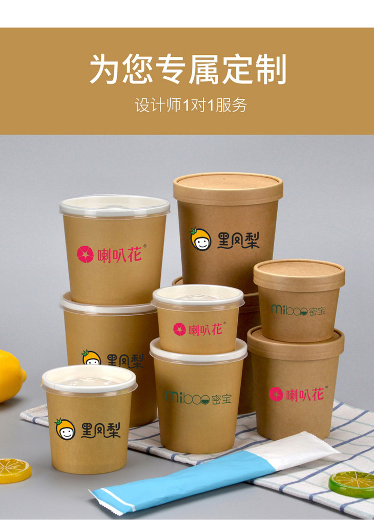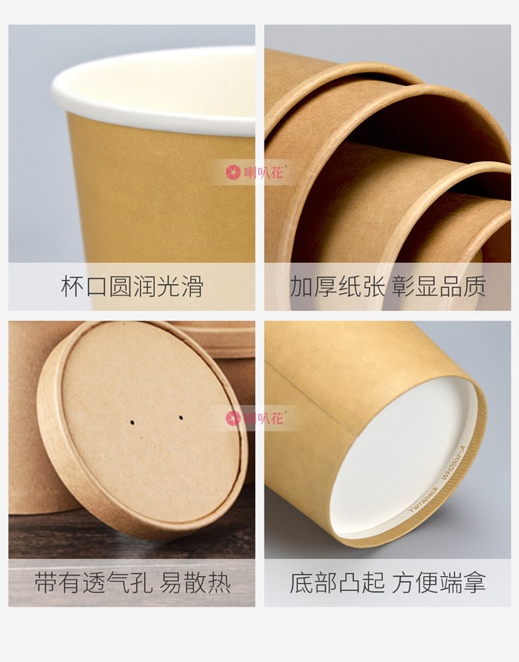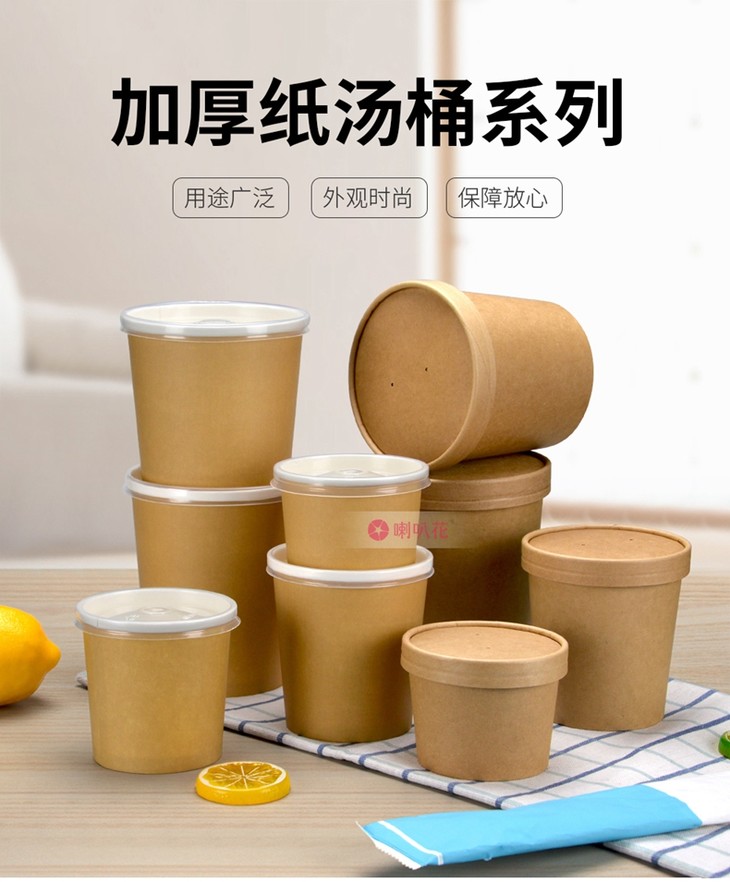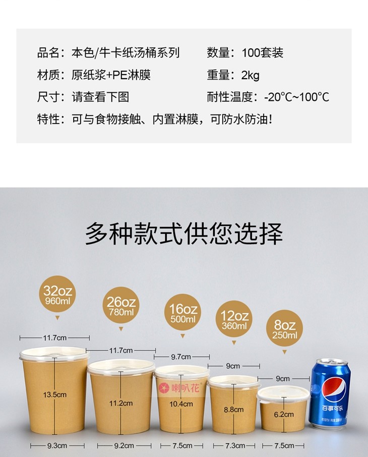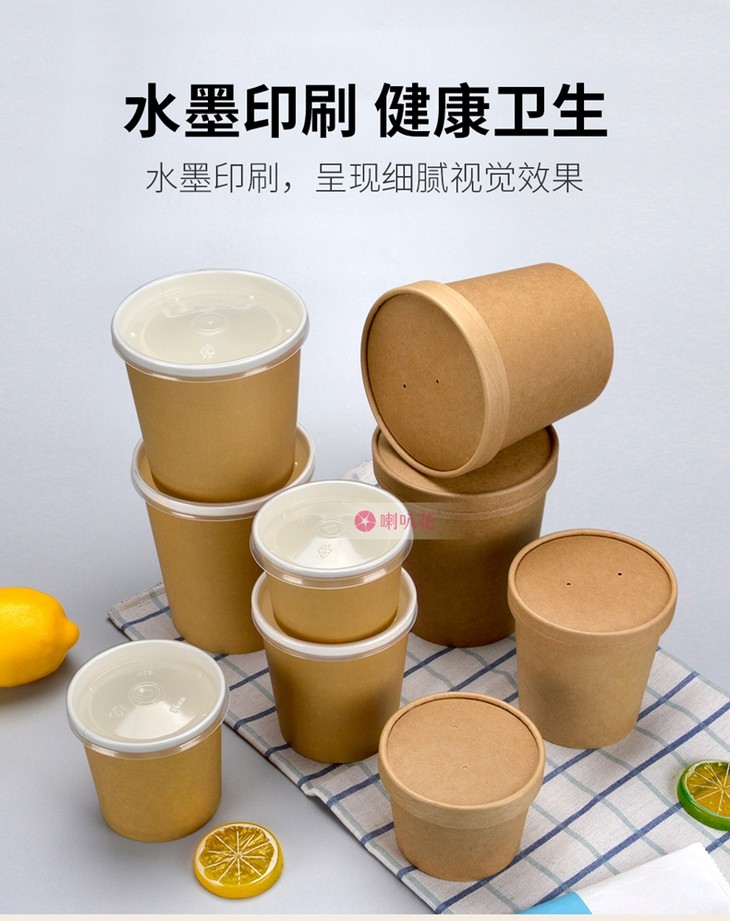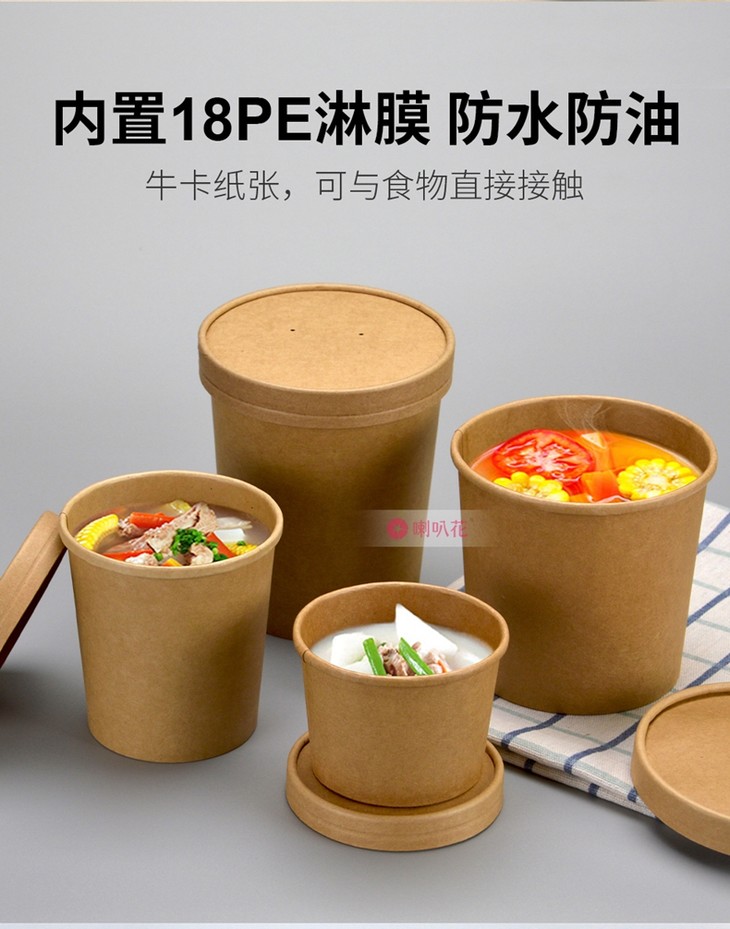 喇叭花 一次性汤碗外卖打包盒快餐盒牛皮纸碗杯带盖圆形汤盒100个