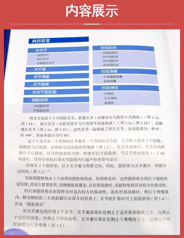 主要内容由两个部分组成,每个部分的长度是四个章节:一个是总论部分(引言,解剖,检查技术和超声外观和病理),另一个是描述基于地形图的肘关节超声研究(肌肉和远端二头肌肌腱,肱肌和肌腱,肱二头肌、骨间滑囊、正中神经、桡神经、冠状隐窝;外侧:伸肌总腱、外侧副韧带;内侧:屈肌总腱、内侧副韧带、尺神经;后侧:肱三头肌肌腱、鹰嘴滑囊、滑膜隐窝)