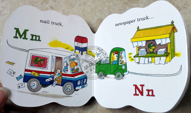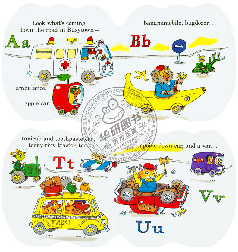 Richard Scarry’s Cars and Trucks from A to Z《汽车与货车》是由美国久负盛名的“金色童书”大师斯凯瑞所编写的幼儿字母书,内容幽默有趣,做工精湛,画质细腻,外形为富有创意的苹果车。各式各样天马行空的车子,能够培养孩子的想象力。