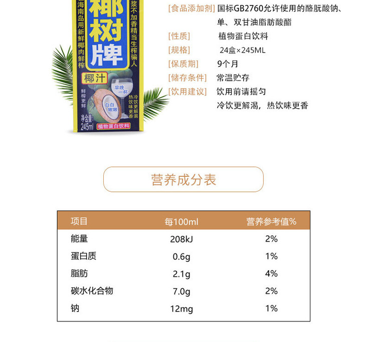 【整箱24盒】正宗椰树牌椰汁饮料1箱(245ml*24盒)