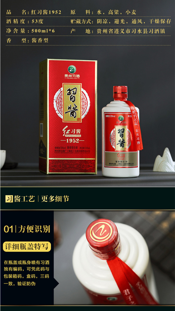 茅台集团习酒红习酱1952酱香型53度白酒500ml*6瓶整箱装