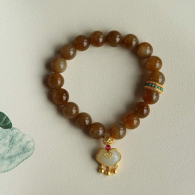 天然和田玉糖料手链 尺寸约9.5mm 搭配纯银鎏金镶嵌和田玉如意锁吊坠 搭配松石转运环