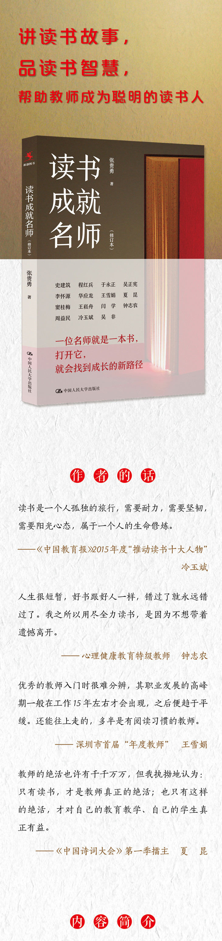 每位名师都是一道亮丽的风景,都是值得我们追随的榜样。考虑到地域、学科的平衡,此次修订出版的《读书成就名师》对原版做了一些删减,同时增加了几位年轻的一线教师。和原版相比,修订版的可读性更强,指向更丰富,学科领域也更开阔。通过剖析名师们的读书故事、教学实践和成长感悟,瞄准阅读与成长的关系,指向教师自我更新迭代的主题,为一线教师的专业发展提供了一条路径。