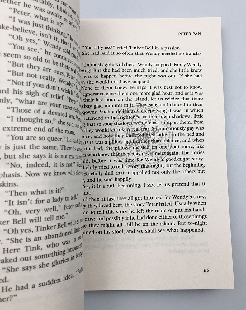 Peter Pan《彼得潘》是英国著名作家詹姆斯·巴里的成名作。该故事原本为舞台剧,作者将剧本小说化并于1911年首次出版,原名为Peter Pan and Wendy《彼得潘与温迪》。一百多年以来,《彼得潘》在各国舞台上反复上演,多次被拍为电影,并译成各种文字。彼得·潘这个不肯长大的男孩,已经成为西方世界无人不知的人物,象征着永恒的童年和永无止境的探险精神。世界儿童文学经典之作,描述了一个至真至纯的儿童世界,大人和小孩都适合阅读。