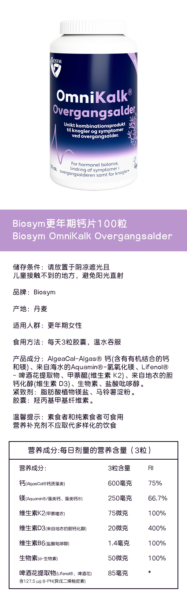 [丹麦]Biosym更年期钙片100粒. Biosym OmniKalk Overgangsalder 100 kap.
