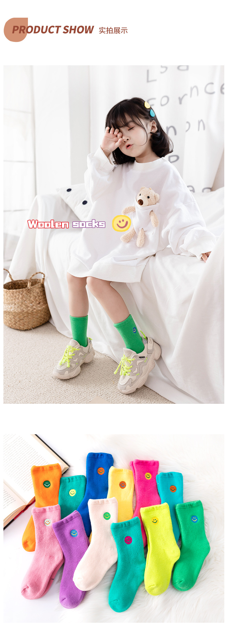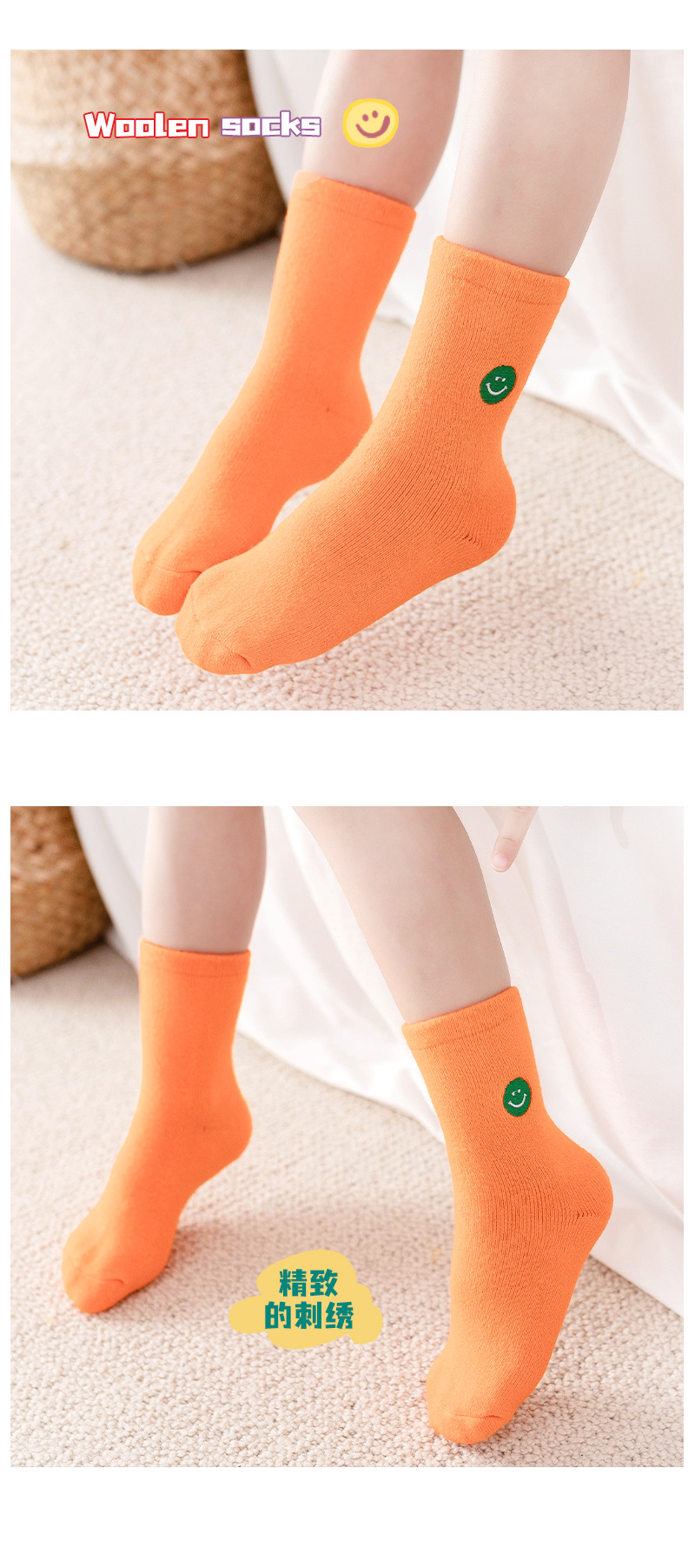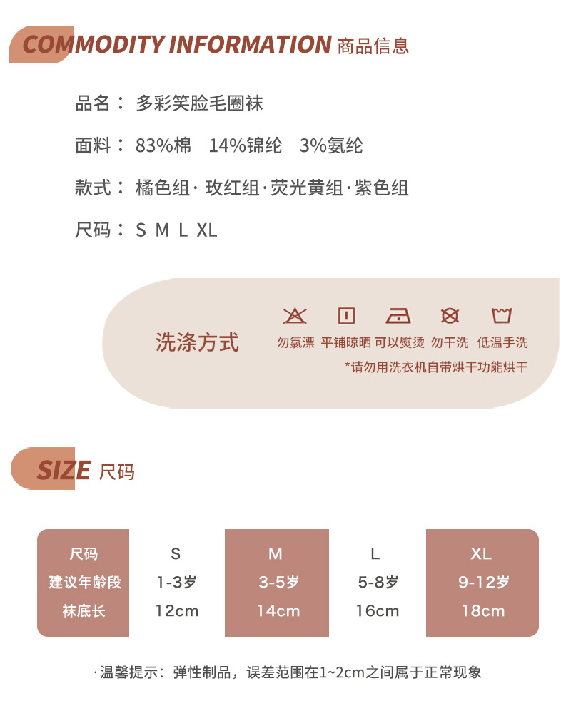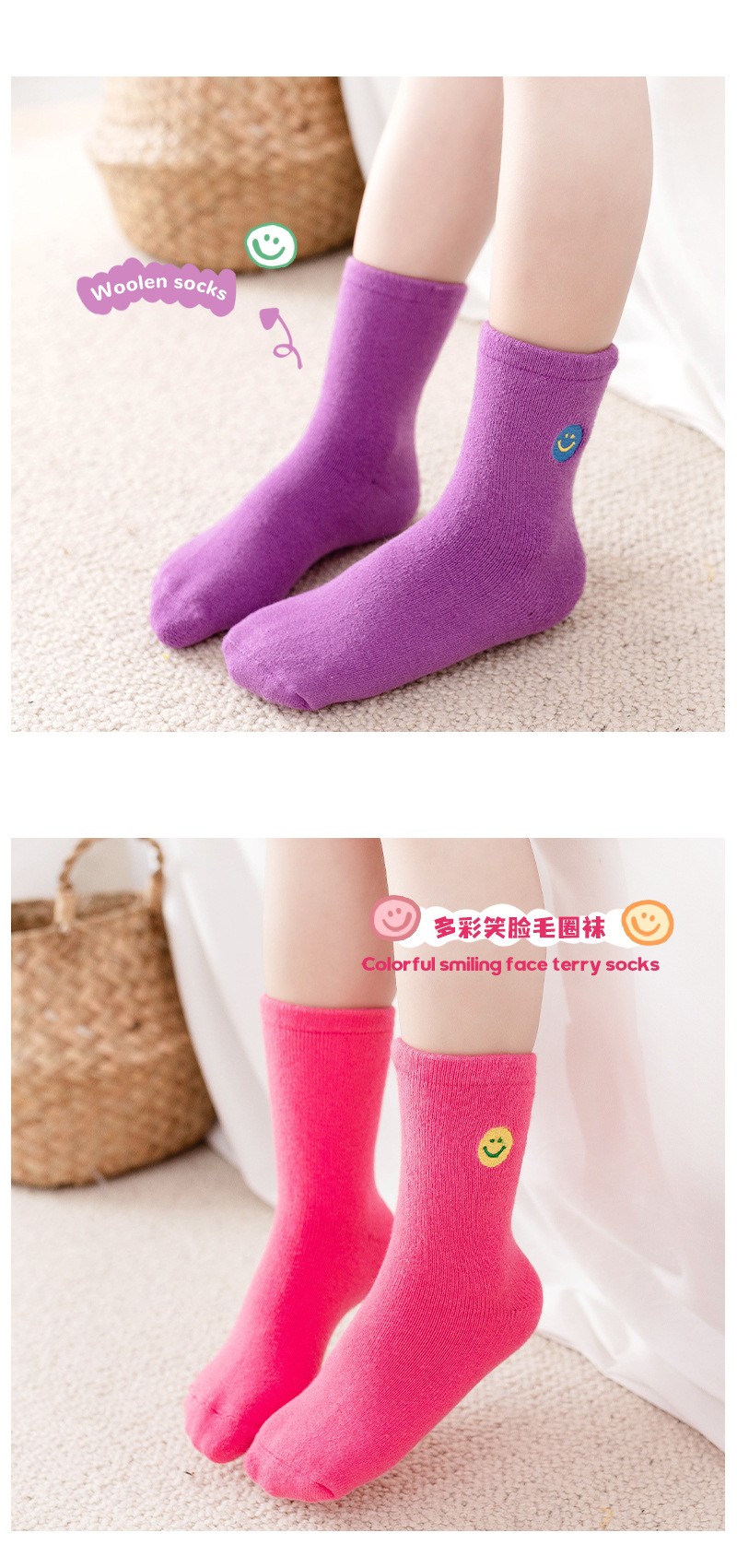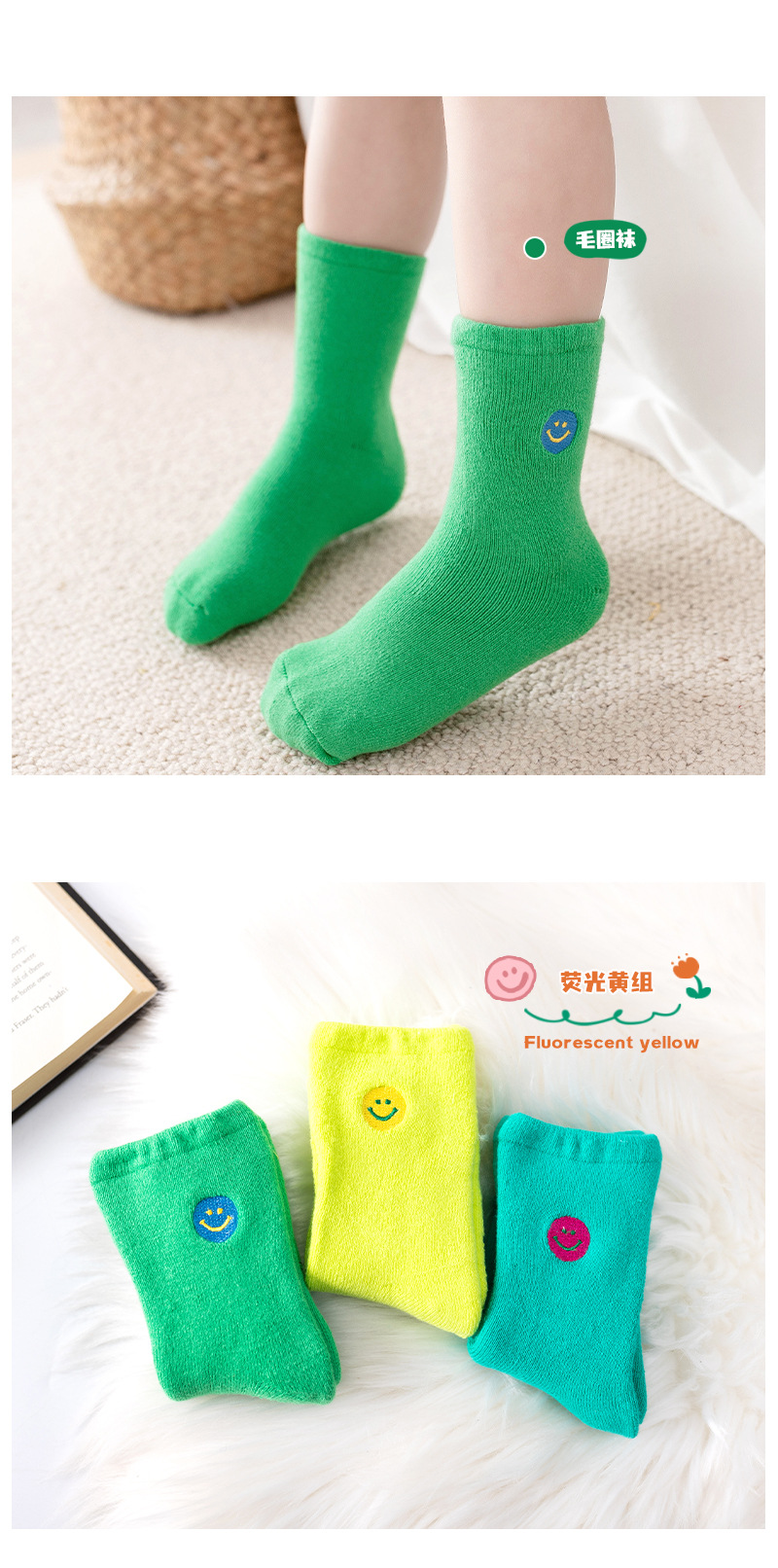 【3双装 蓄热保暖 多彩柔软无线头】刺绣笑脸儿童袜子秋冬儿童中筒袜 男童女童童袜 加厚毛圈儿童袜子